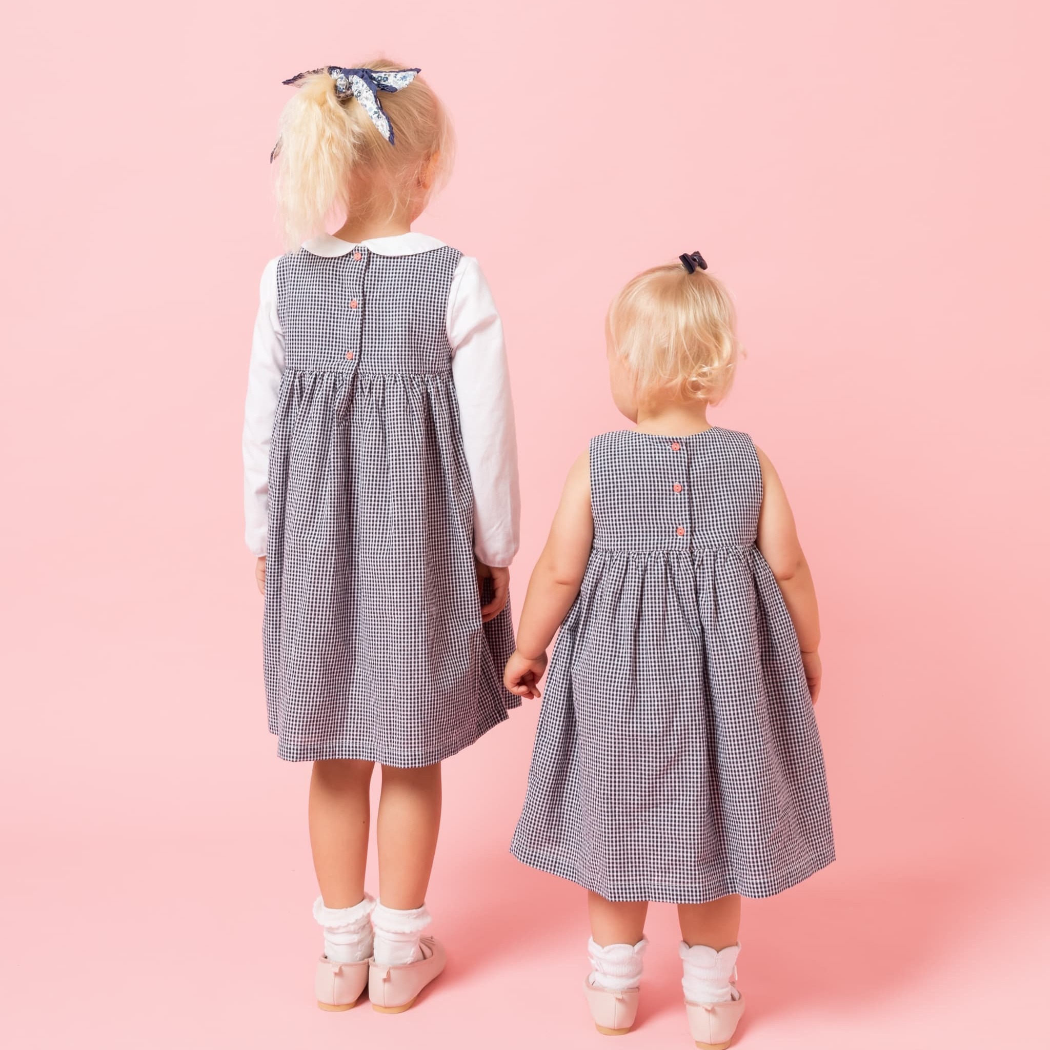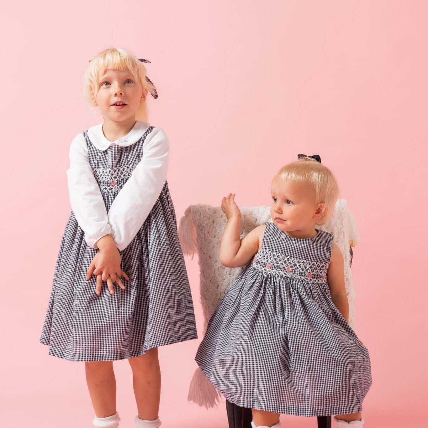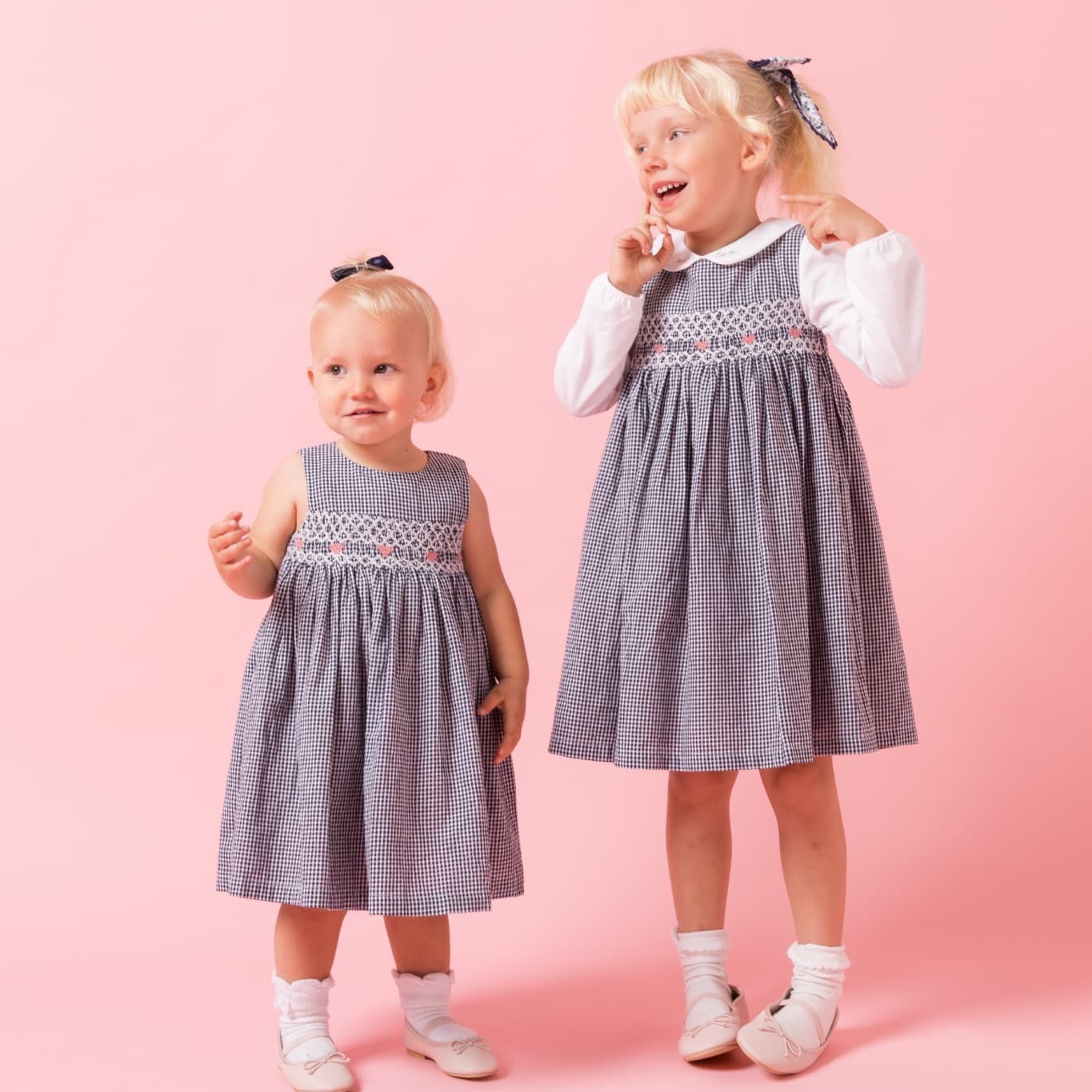 落ち着いたブルーカラーのギンガムチェックに、胸元のハンドスモック刺繍とハートが愛らしいノースリーブワンピース。一枚で着ると爽やかで元気な印象に、アルベッタのブラウスと重ねて着るとフォーマルな印象に。季節によって異なる雰囲気を楽しめます◎