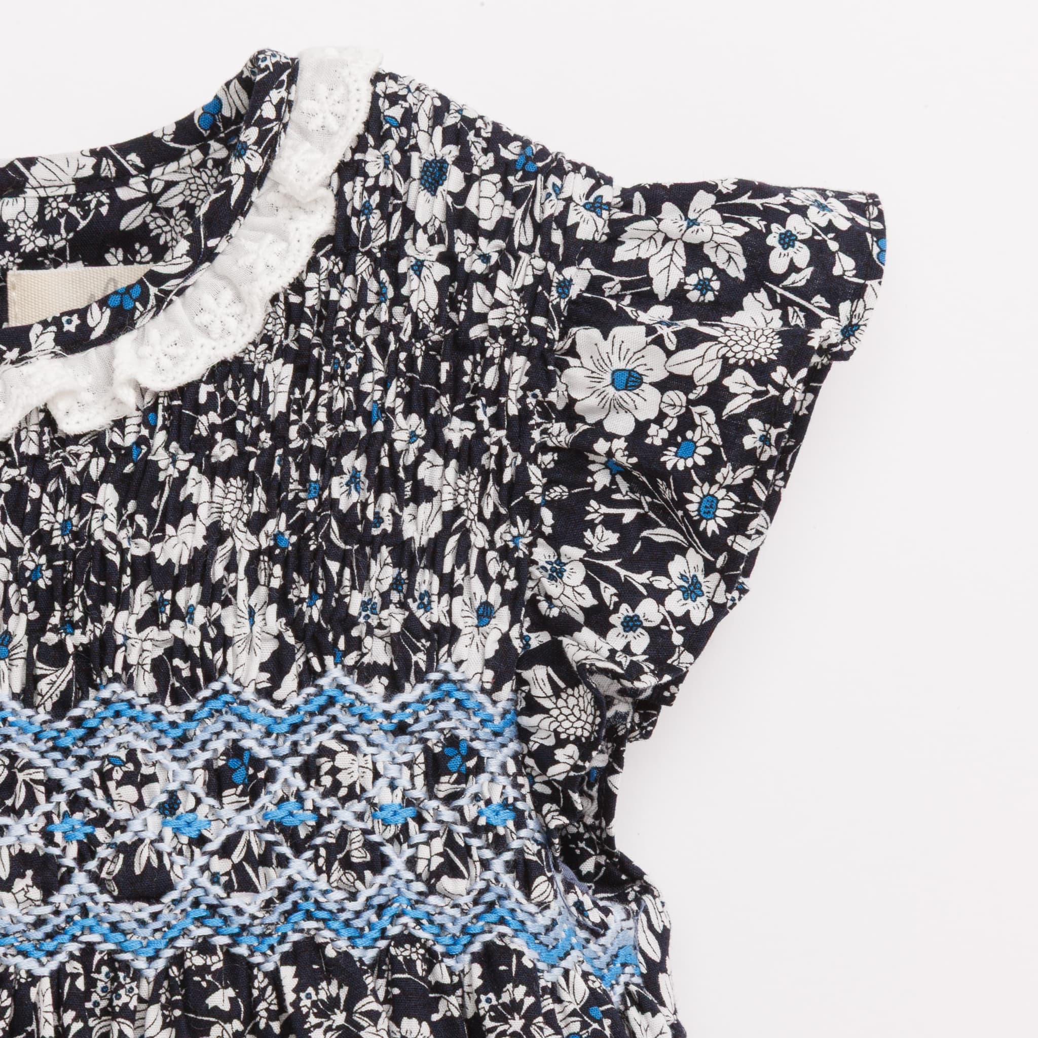 落ち着いたダークブルーの花柄に、明るいブルーのスモッキング刺繍が映えるワンピース。襟の白いレースがより華やかな印象を与え、これ一枚でおしゃれなお出かけスタイルが完成します。