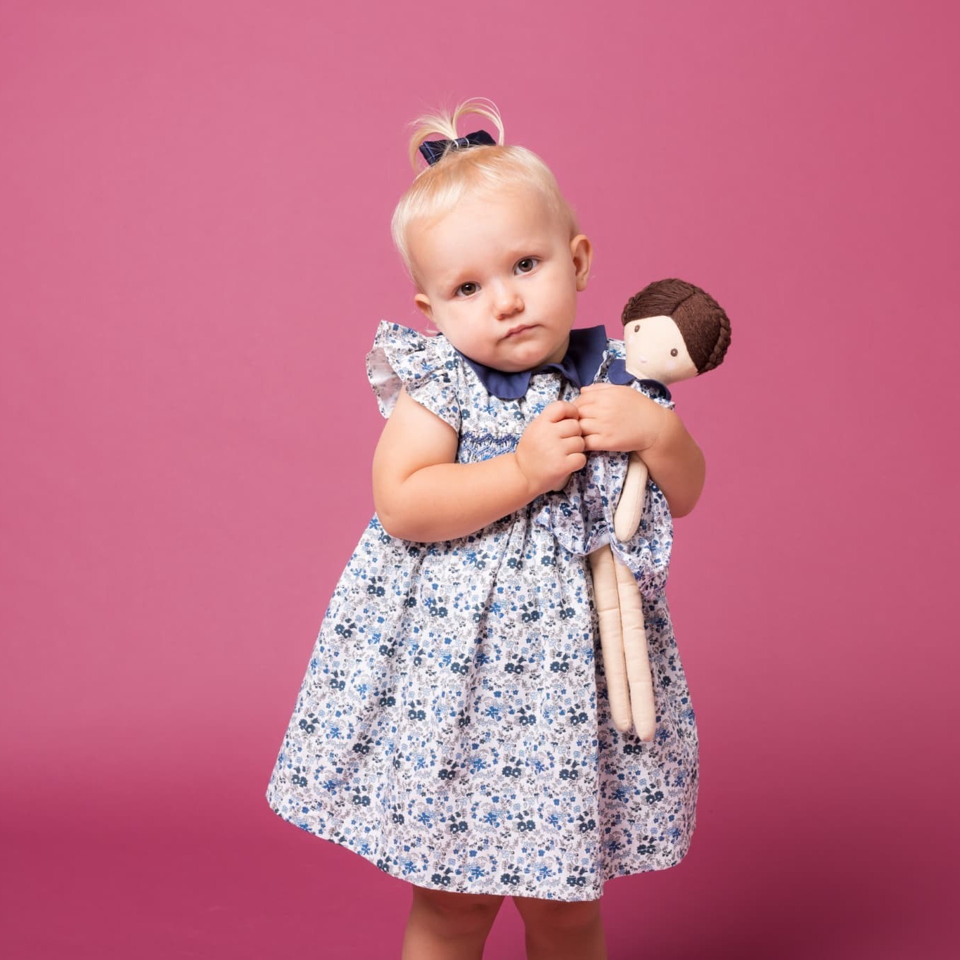 優しいブルーの小花柄に、胸元のスモッキング刺繍とお花の刺繍が可愛いワンピース。ブルーの丸襟がきちんとした印象を与え、カジュアルにもフォーマルにも活躍する一枚です。ベストフレンドドールとのお揃いコーデもおすすめです。
