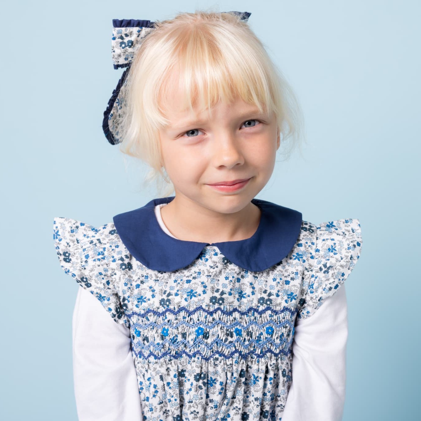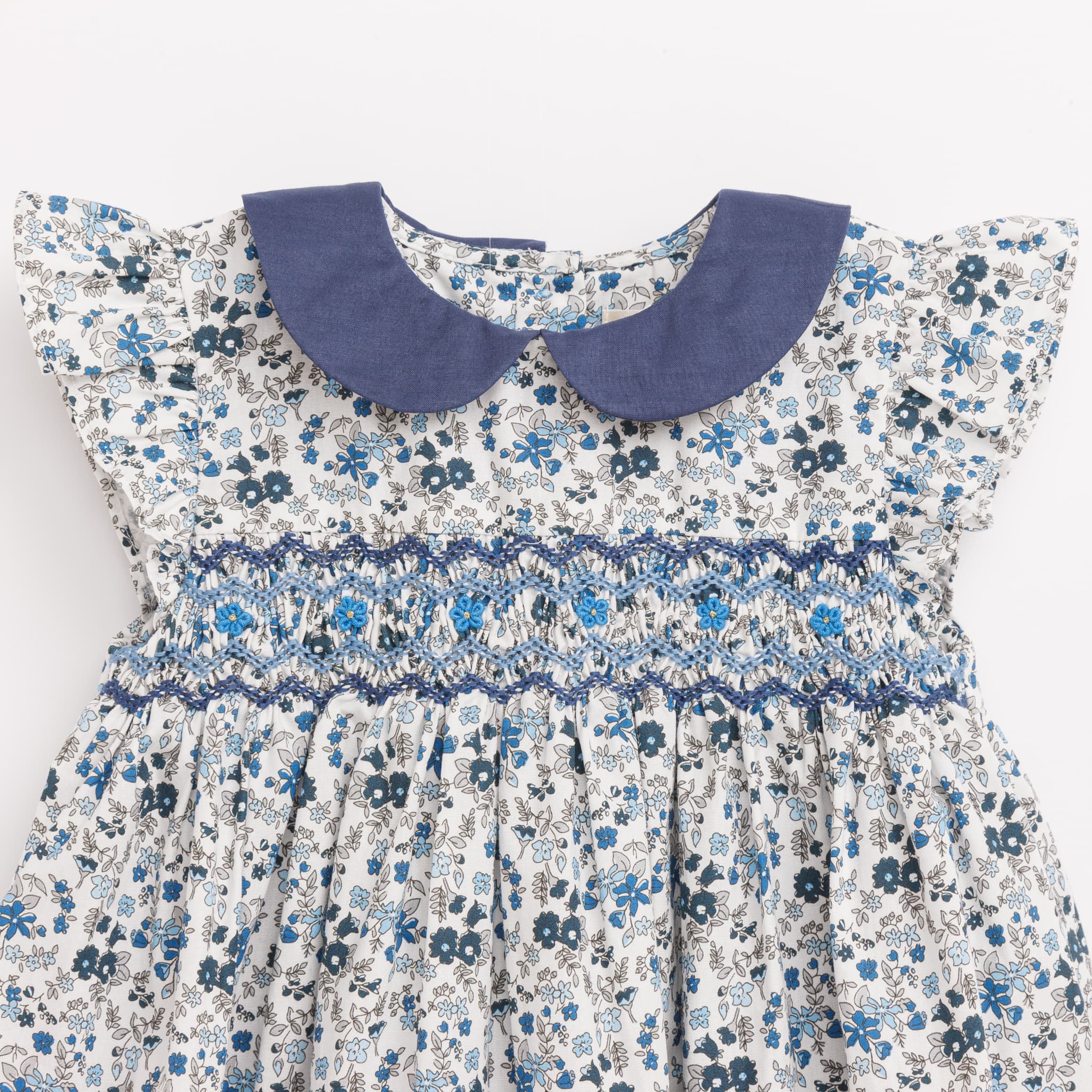 優しいブルーの小花柄に、胸元のスモッキング刺繍とお花の刺繍が可愛いワンピース。ブルーの丸襟がきちんとした印象を与え、カジュアルにもフォーマルにも活躍する一枚です。ベストフレンドドールとのお揃いコーデもおすすめです。