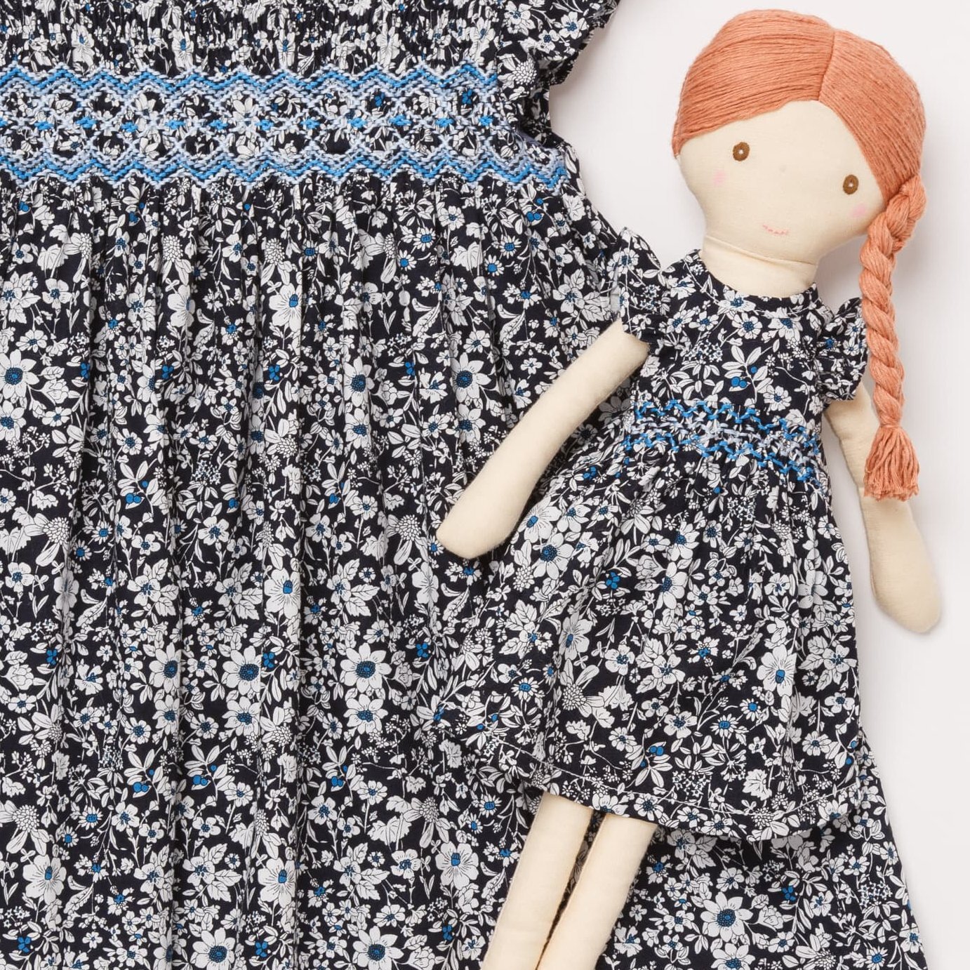 【ドール用】ダークブルーフラワー・ハンドスモック・ドールドレス