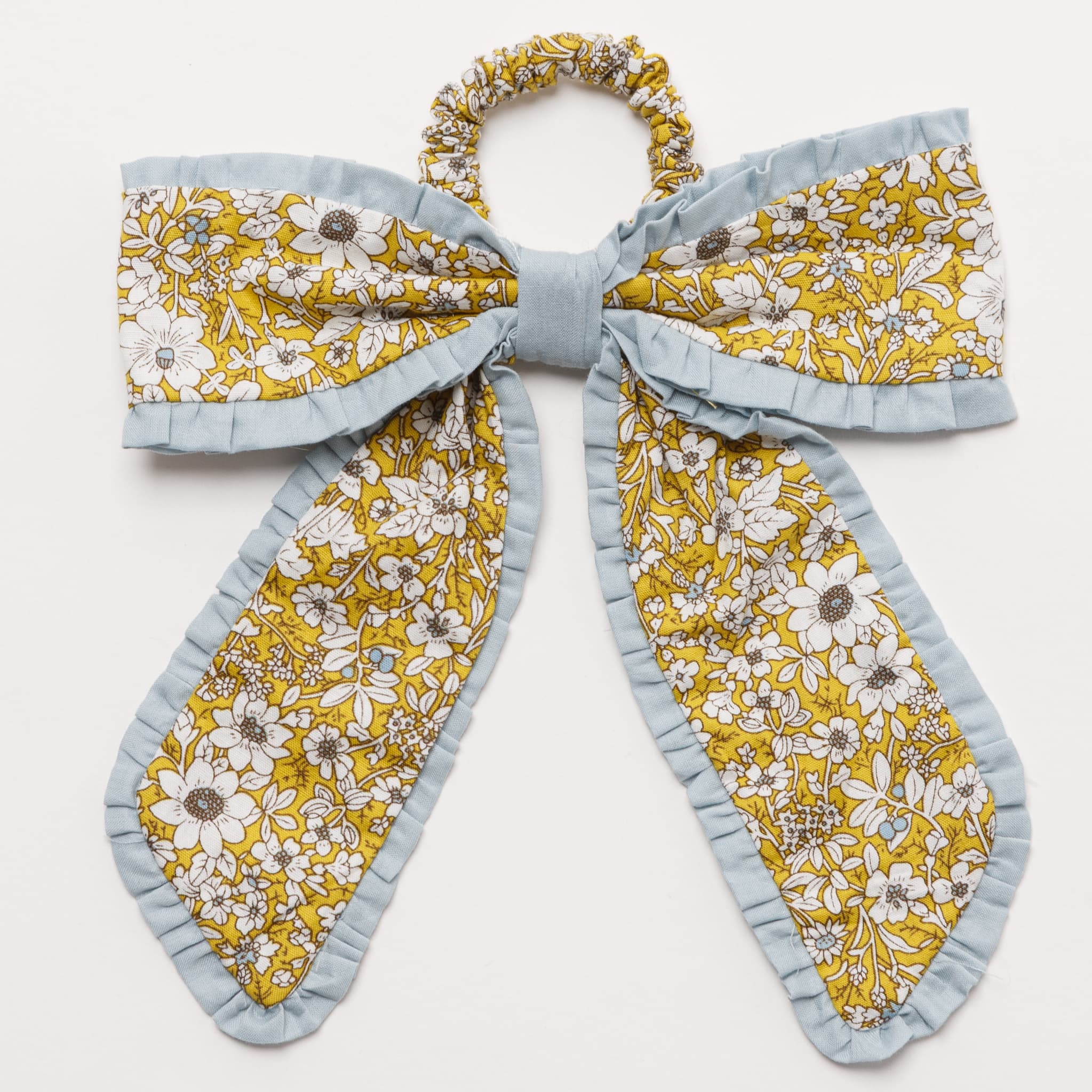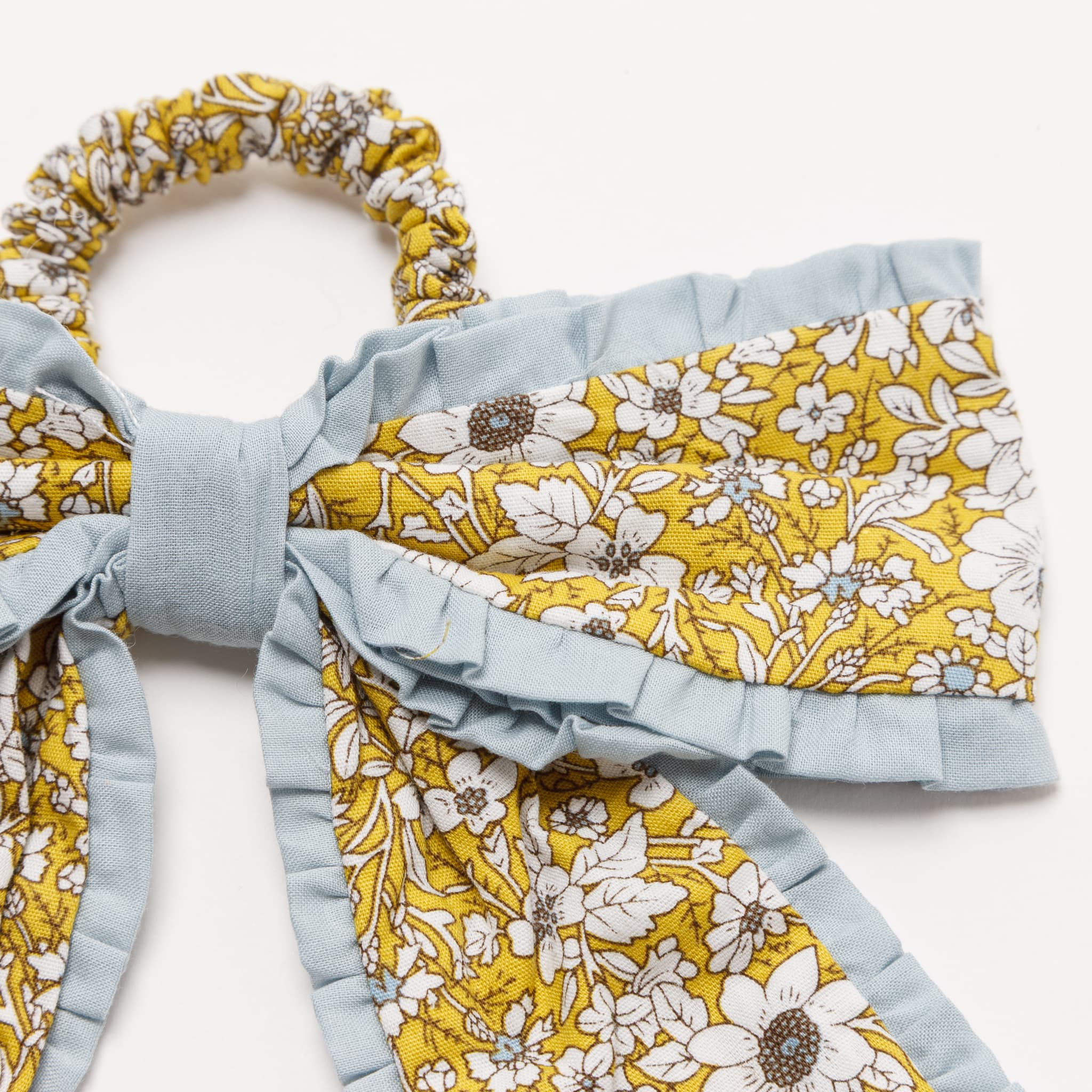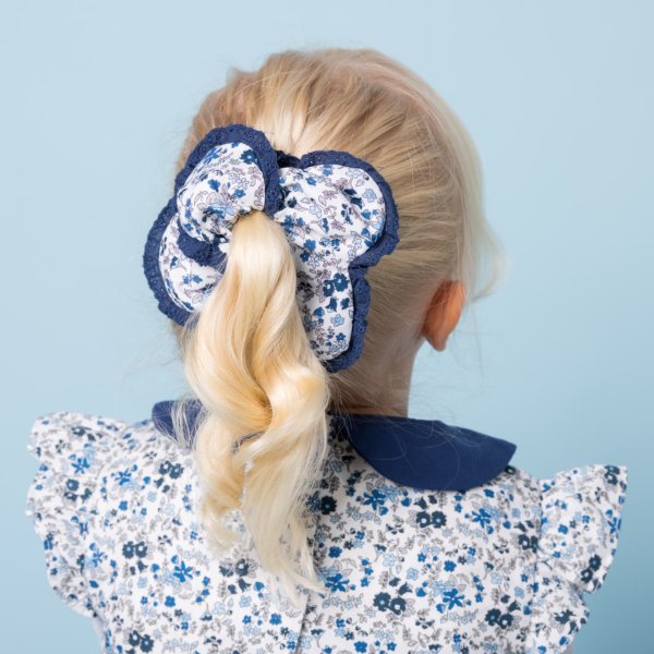 大きなリボンのついたシュシュと、キュートなお花の形のシュシュがセットになっています。リボンのシュシュは華やかなイエローの花柄に、優しいブルーで縁取ったデザイン。お花のシュシュは、落ち着いたダークブルーの花柄に、白のレースで甘さをプラスしたデザインになっています。お揃いの花柄のワンピースや小物と合わせるのもおすすめです◎