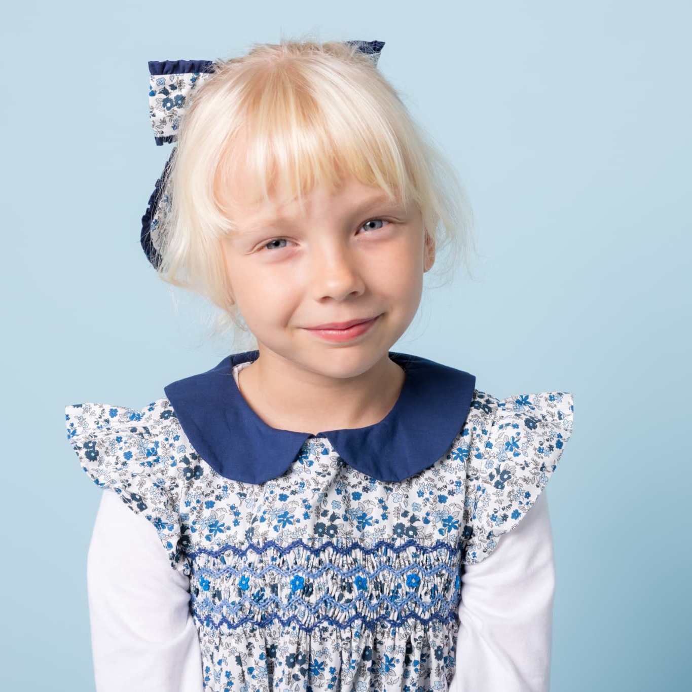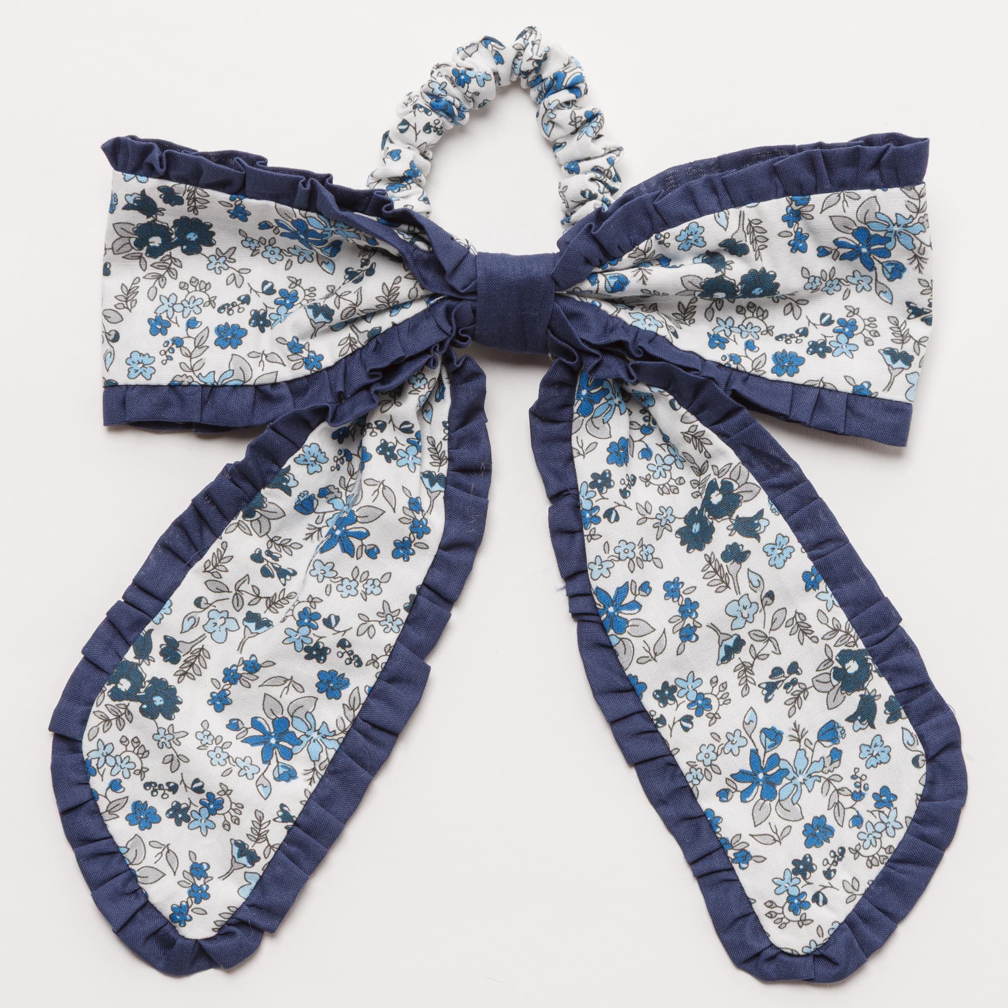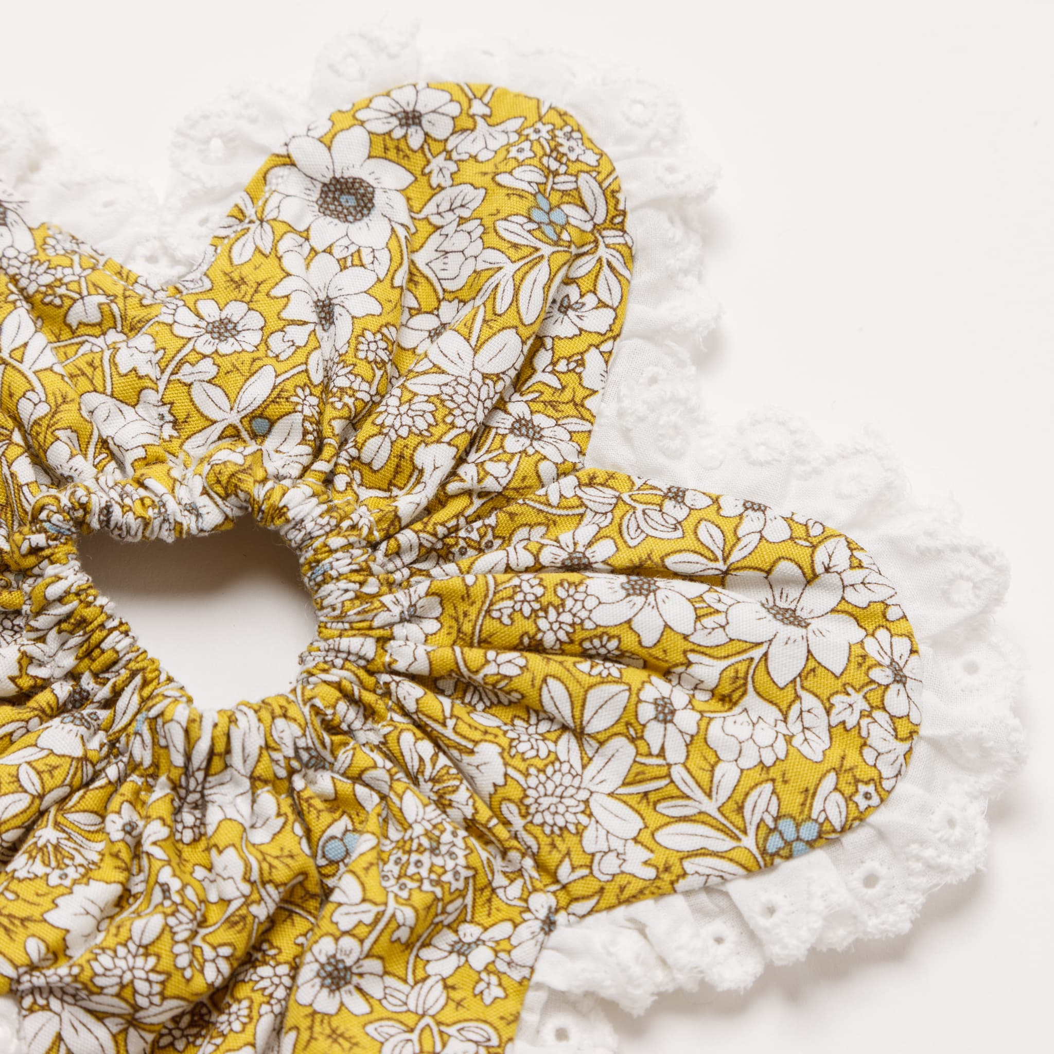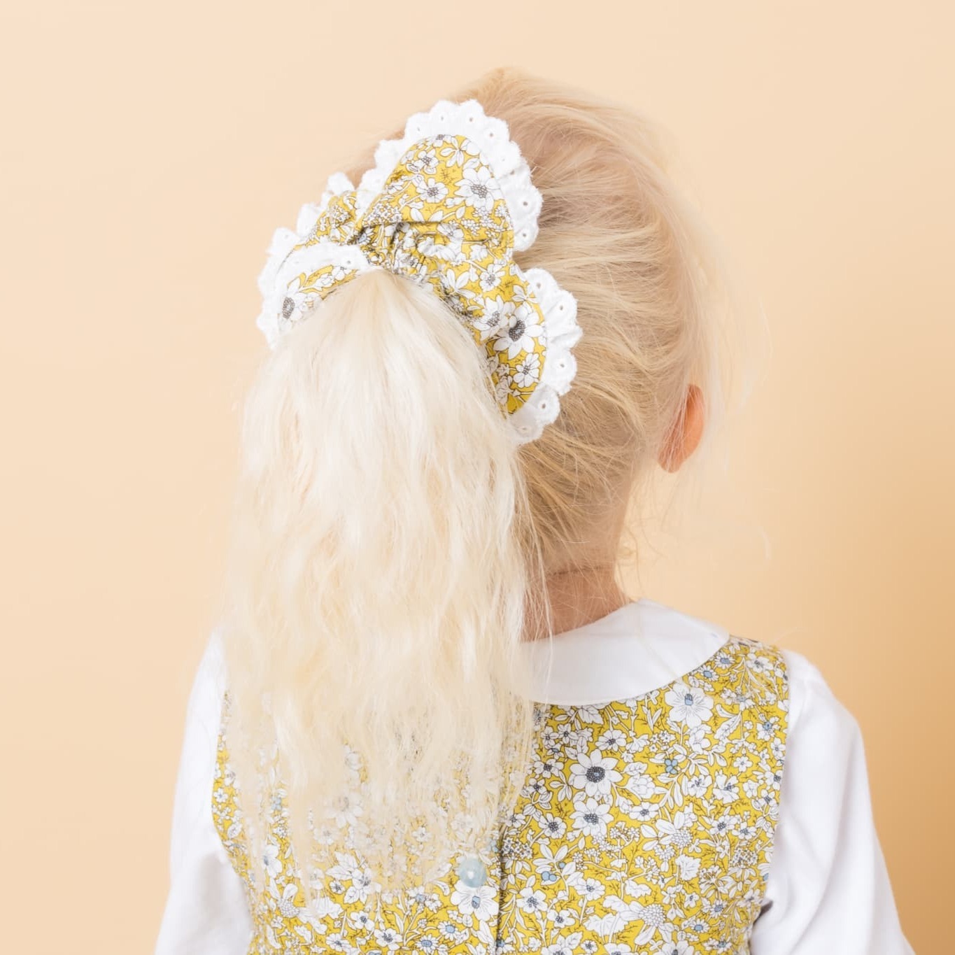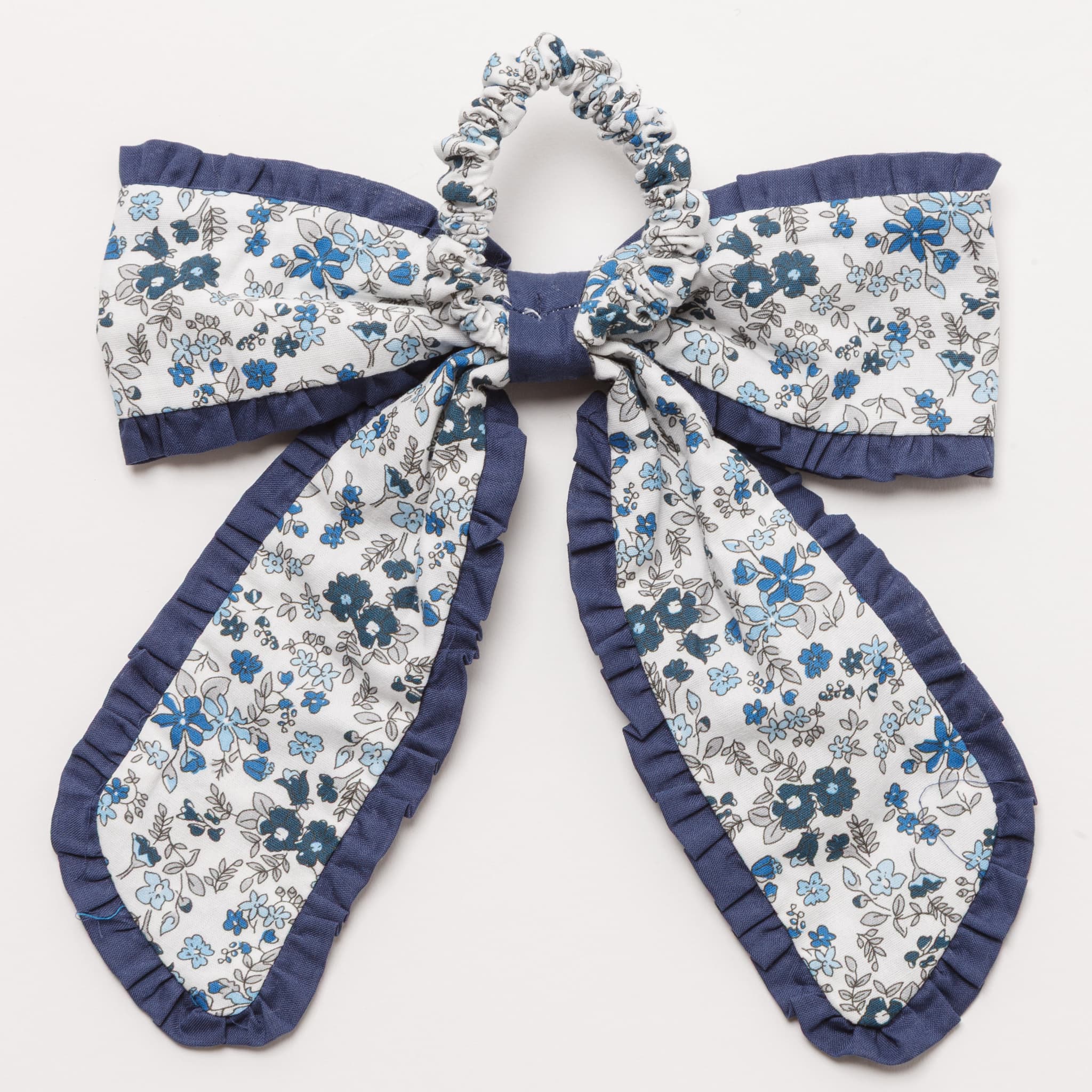 大きなリボンのついたシュシュと、キュートなお花の形のシュシュがセットになっています。リボンのシュシュは、可愛らしいブルーの花柄に、落ち着いたネイビーの縁取りで優しくまとまったデザイン。お花のシュシュは、華やかなイエローの花柄に、白レースの縁取りが魅力的なデザインになっています。お揃いの花柄のワンピースや小物と合わせるのもおすすめです◎