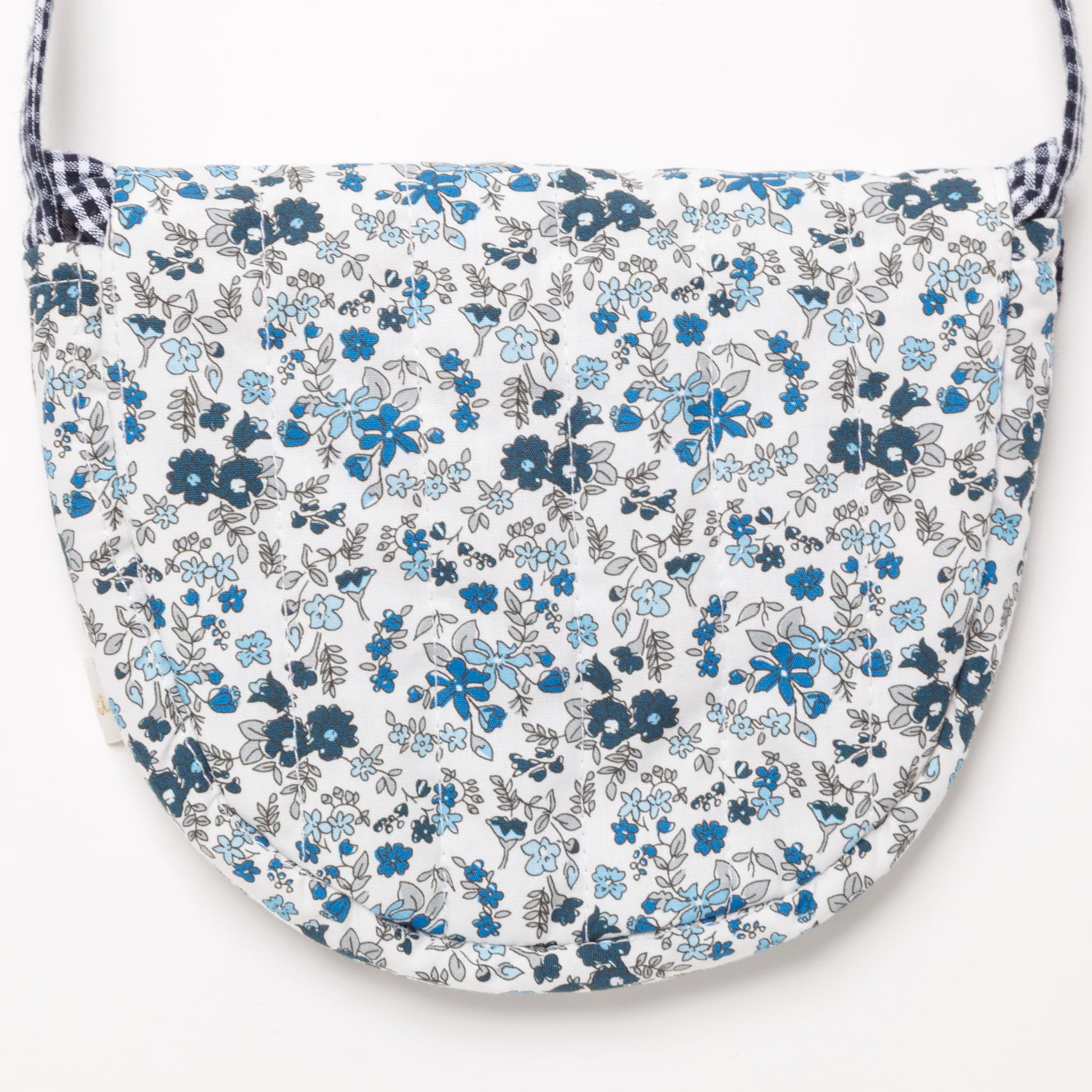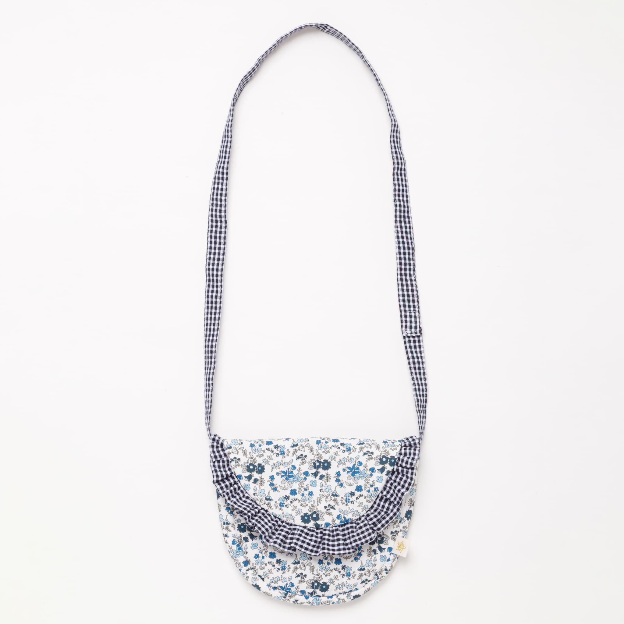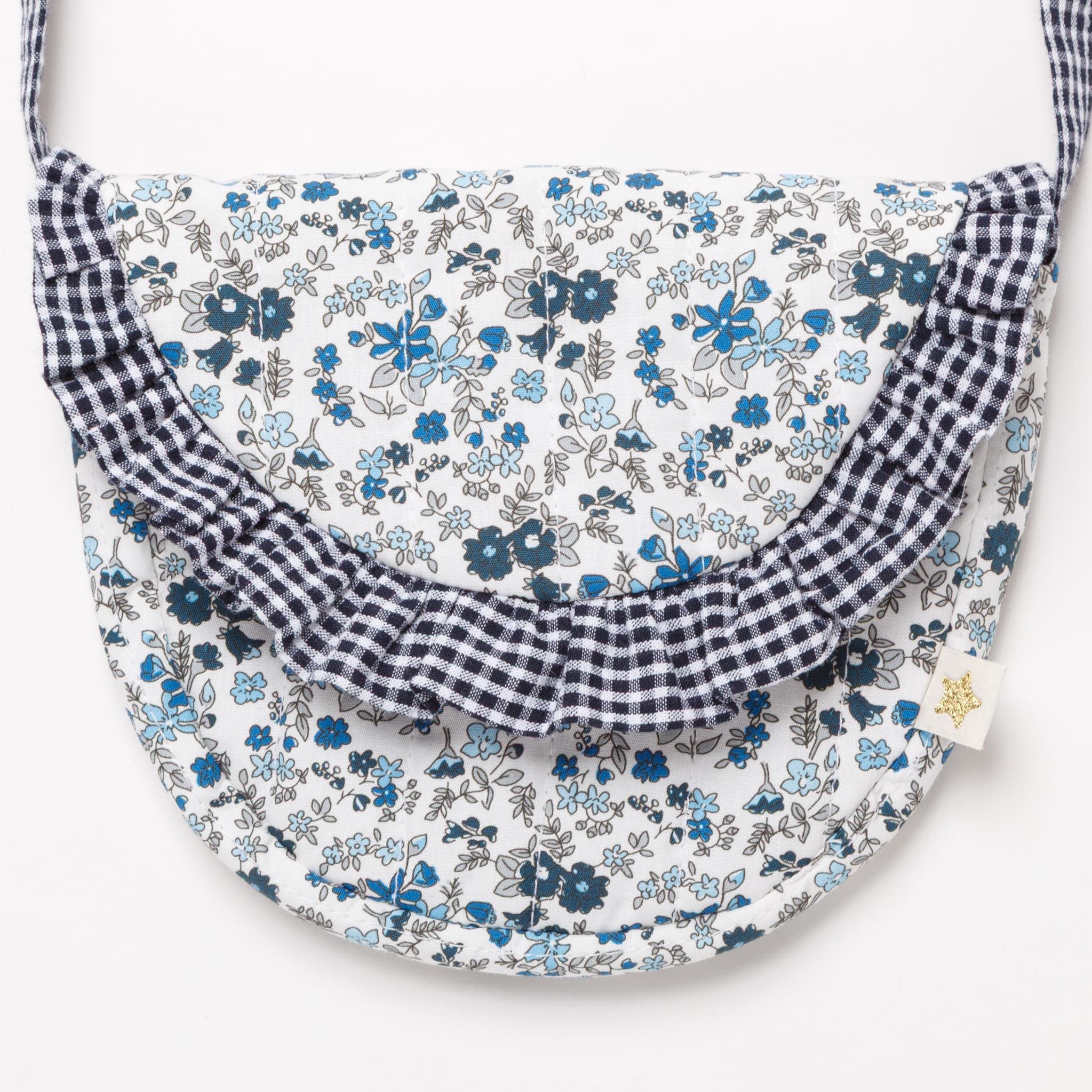 可愛らしいブルーの花柄に、ギンガムチェックの縁取りとストラップを合わせた、コンパクトなショルダーバッグ。普段のちょっとしたお出かけを可愛らしく彩ってくれるアイテムです。ストラップはマジックテープになっていて、強く引っ張ると外れるようになっているため、小さなお子様でも安心です。