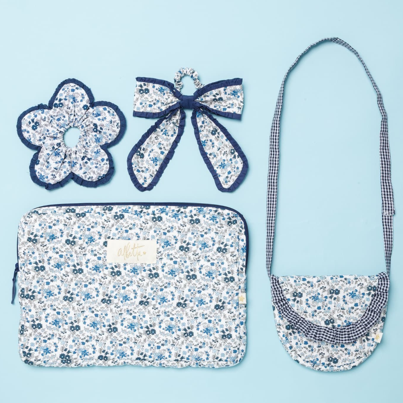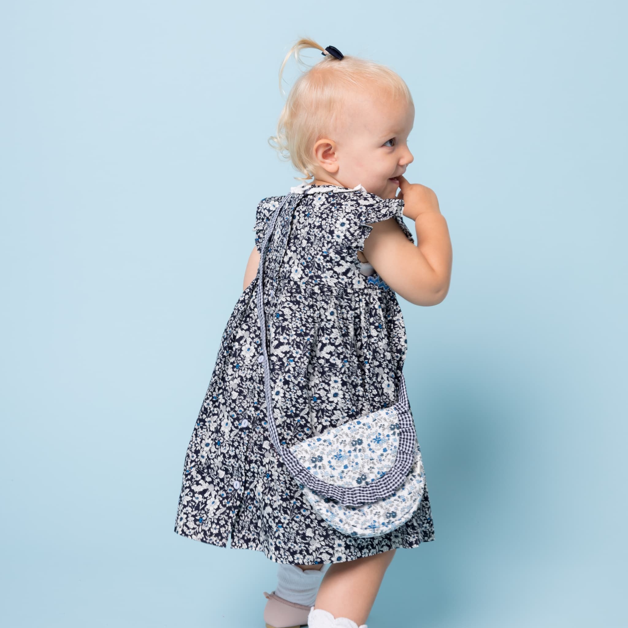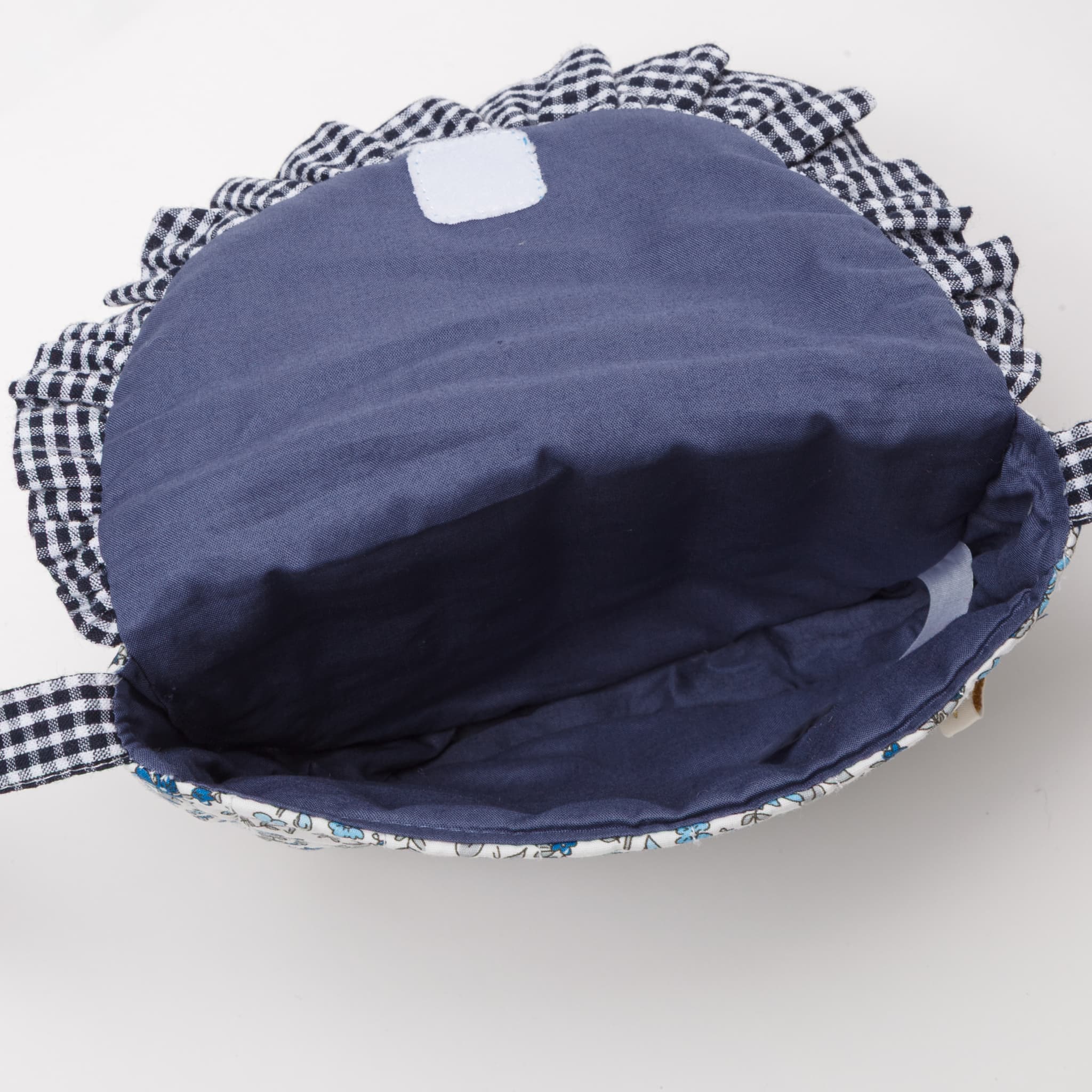 可愛らしいブルーの花柄に、ギンガムチェックの縁取りとストラップを合わせた、コンパクトなショルダーバッグ。普段のちょっとしたお出かけを可愛らしく彩ってくれるアイテムです。ストラップはマジックテープになっていて、強く引っ張ると外れるようになっているため、小さなお子様でも安心です。