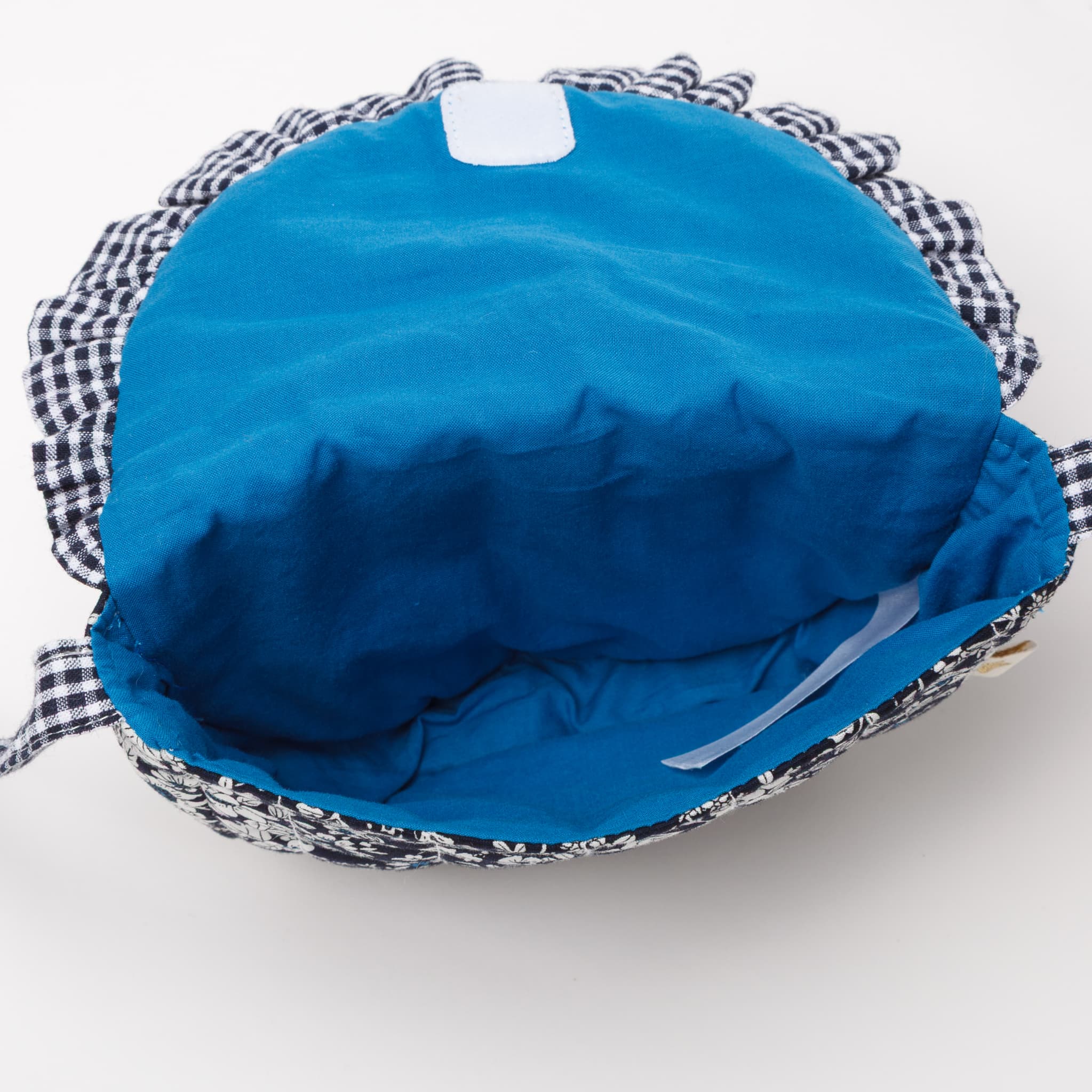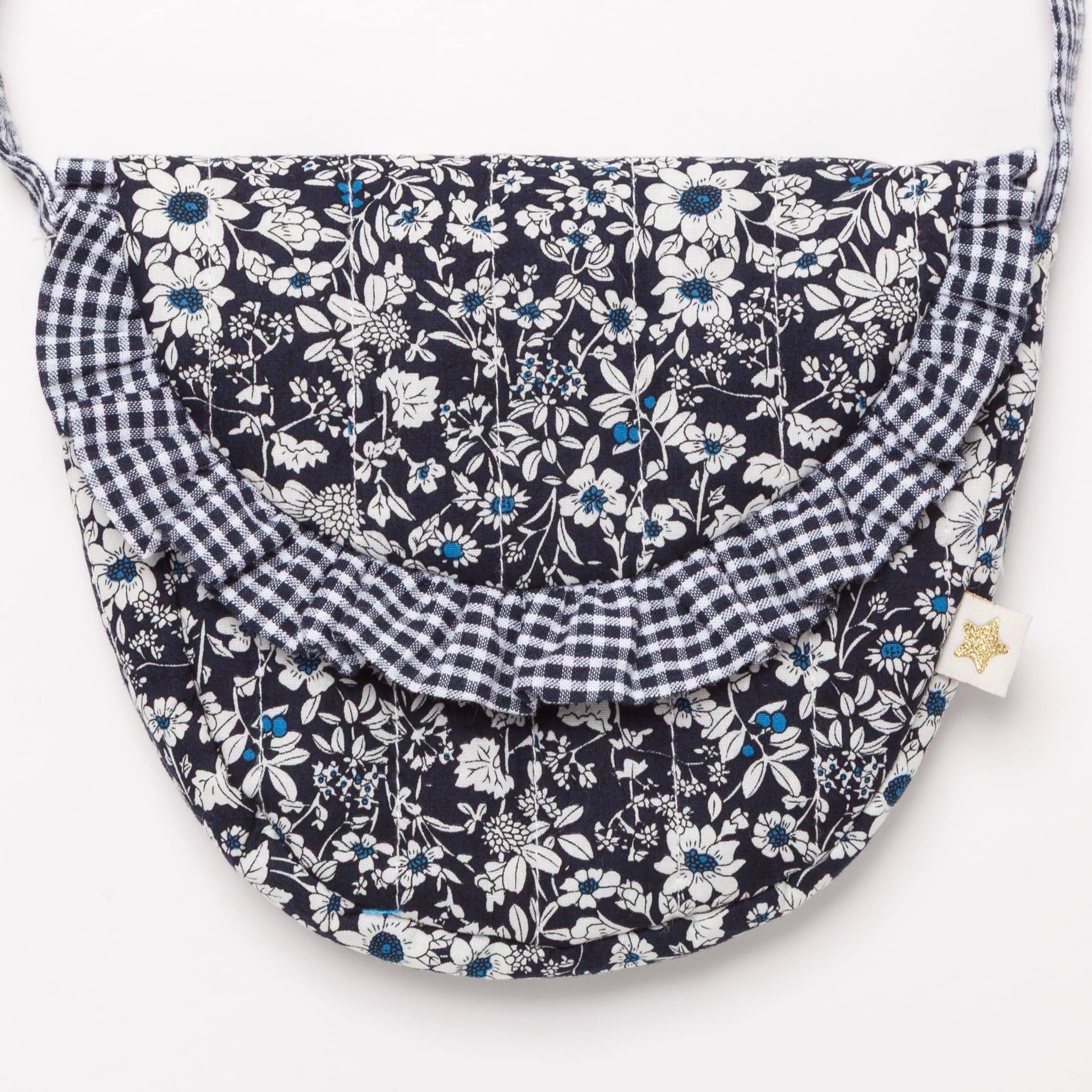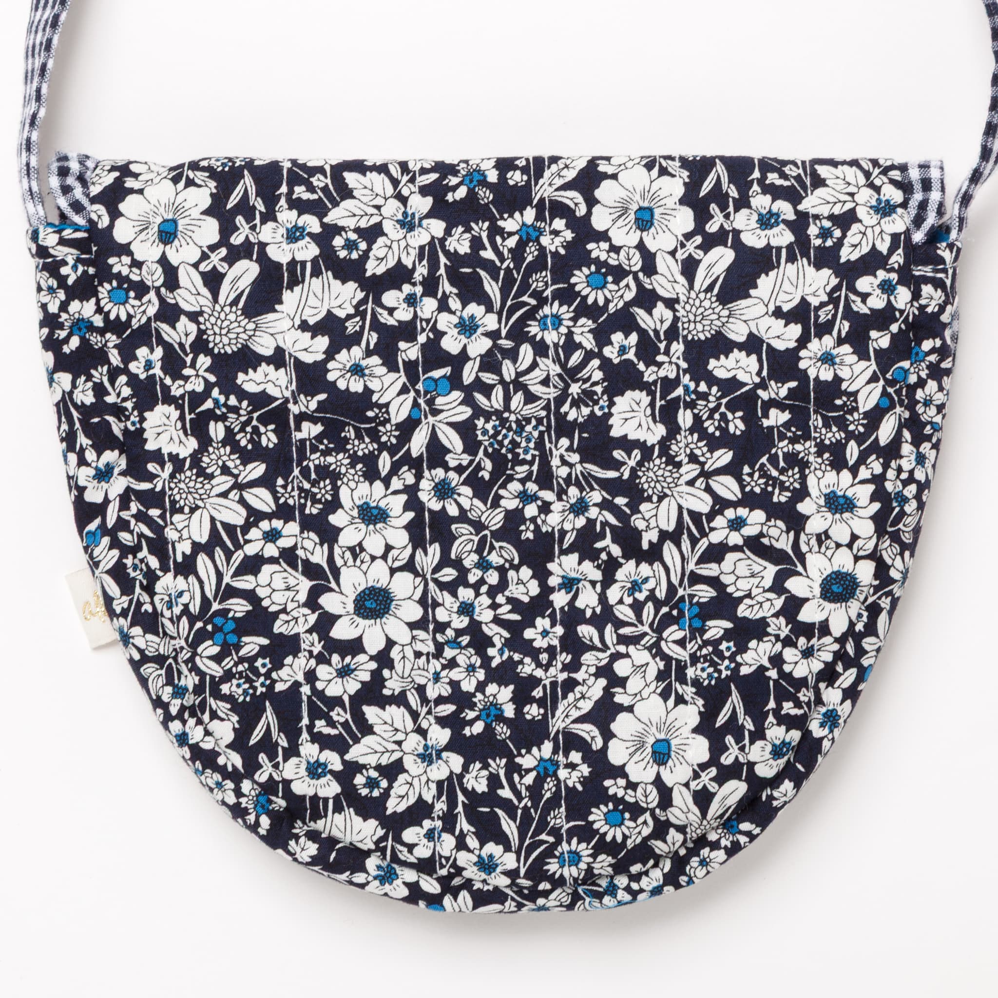 落ち着いたダークブルーの花柄に、ギンガムチェックの縁取りとストラップを合わせた、コンパクトなショルダーバッグ。普段のちょっとしたお出かけを可愛らしく彩ってくれるアイテムです。ストラップはマジックテープになっていて、強く引っ張ると外れるようになっているため、小さなお子様でも安心です。