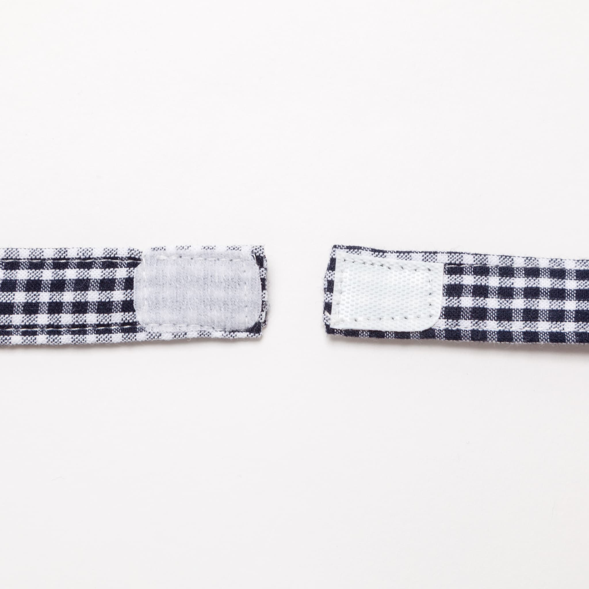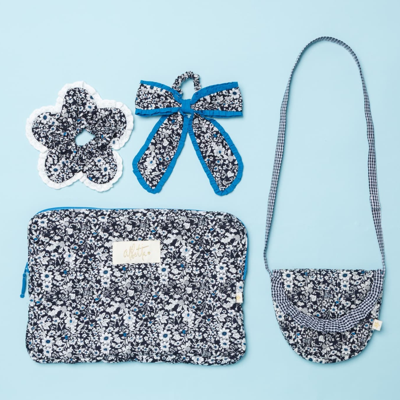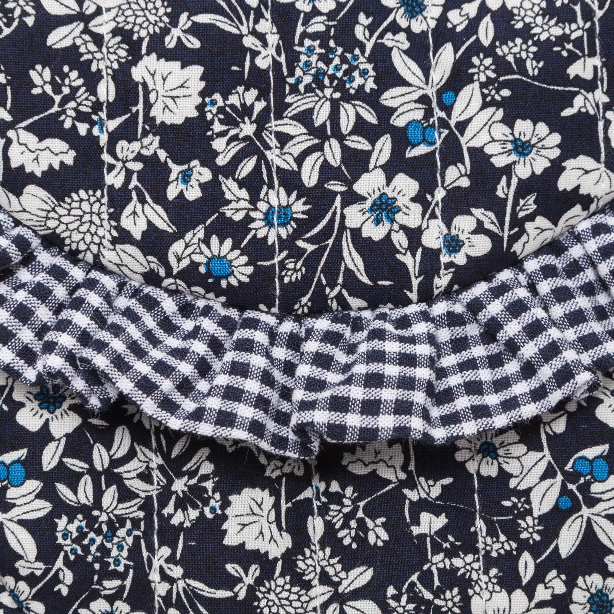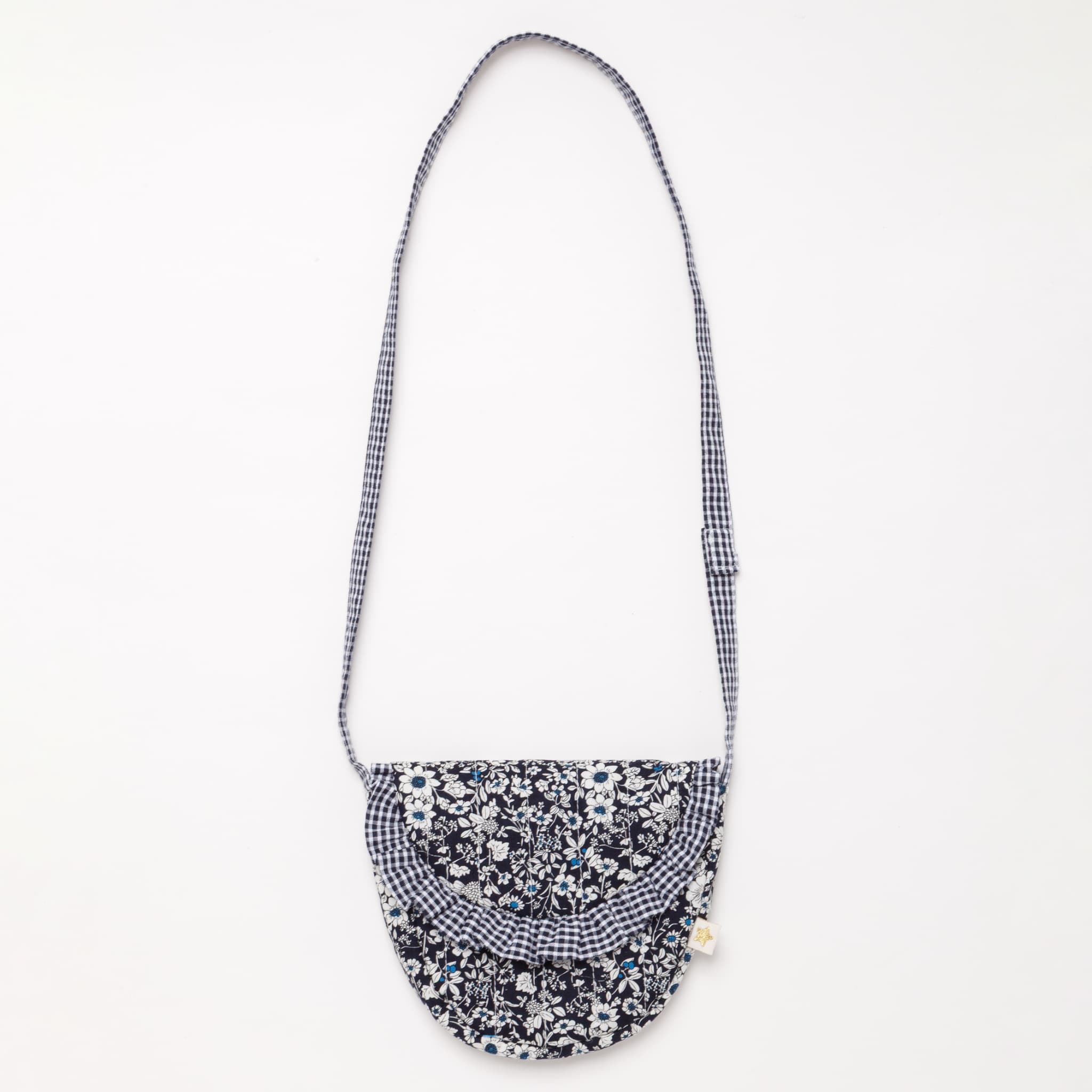 落ち着いたダークブルーの花柄に、ギンガムチェックの縁取りとストラップを合わせた、コンパクトなショルダーバッグ。普段のちょっとしたお出かけを可愛らしく彩ってくれるアイテムです。ストラップはマジックテープになっていて、強く引っ張ると外れるようになっているため、小さなお子様でも安心です。