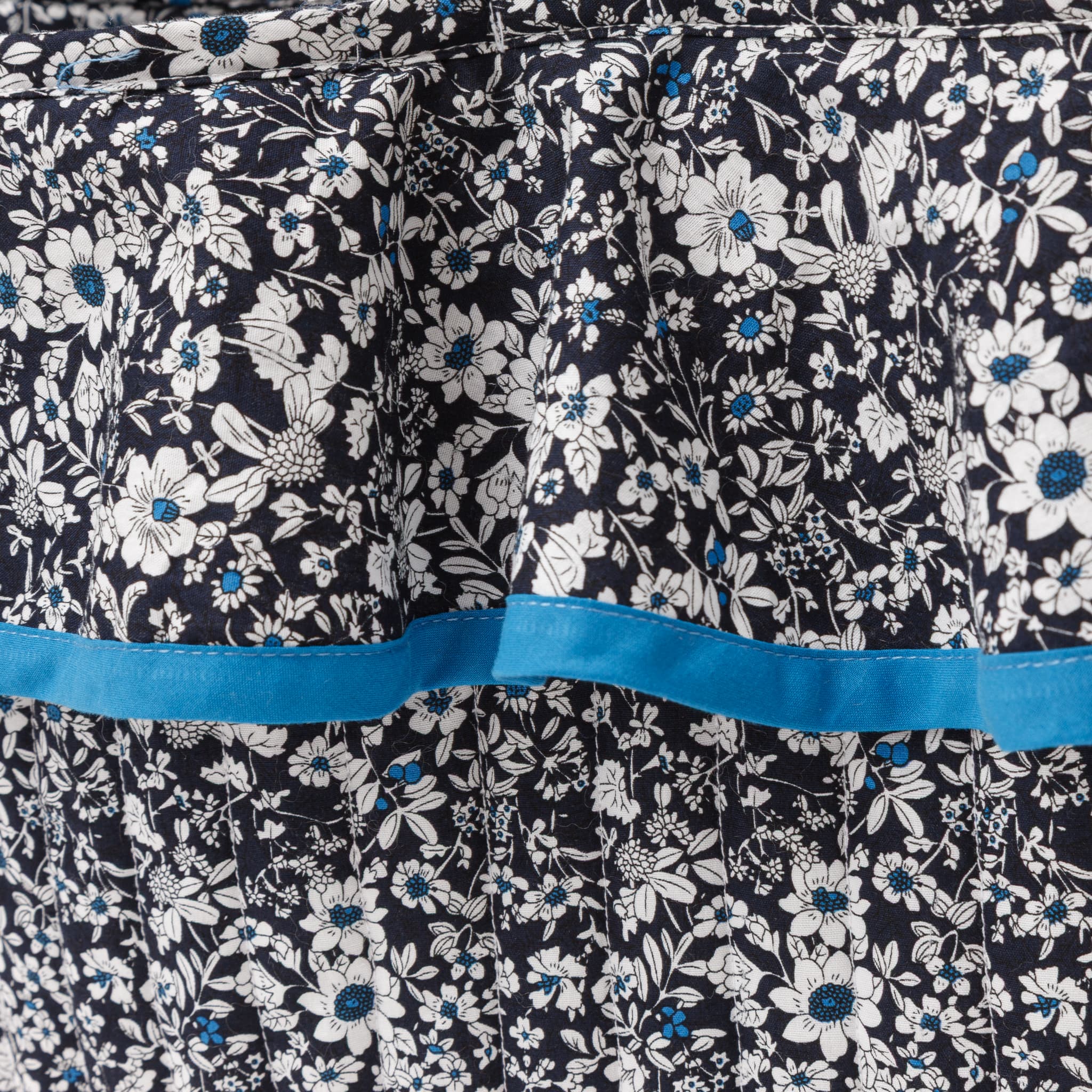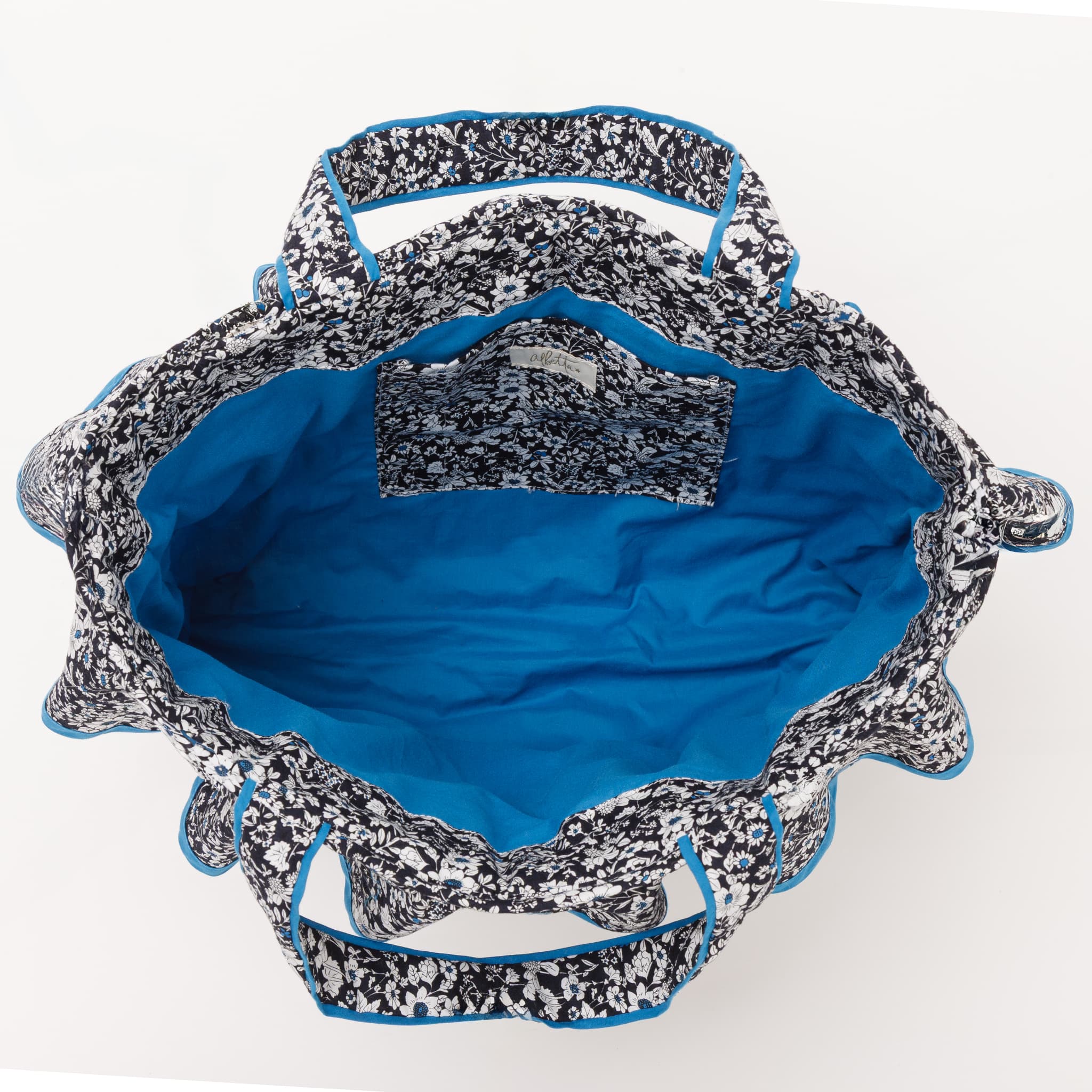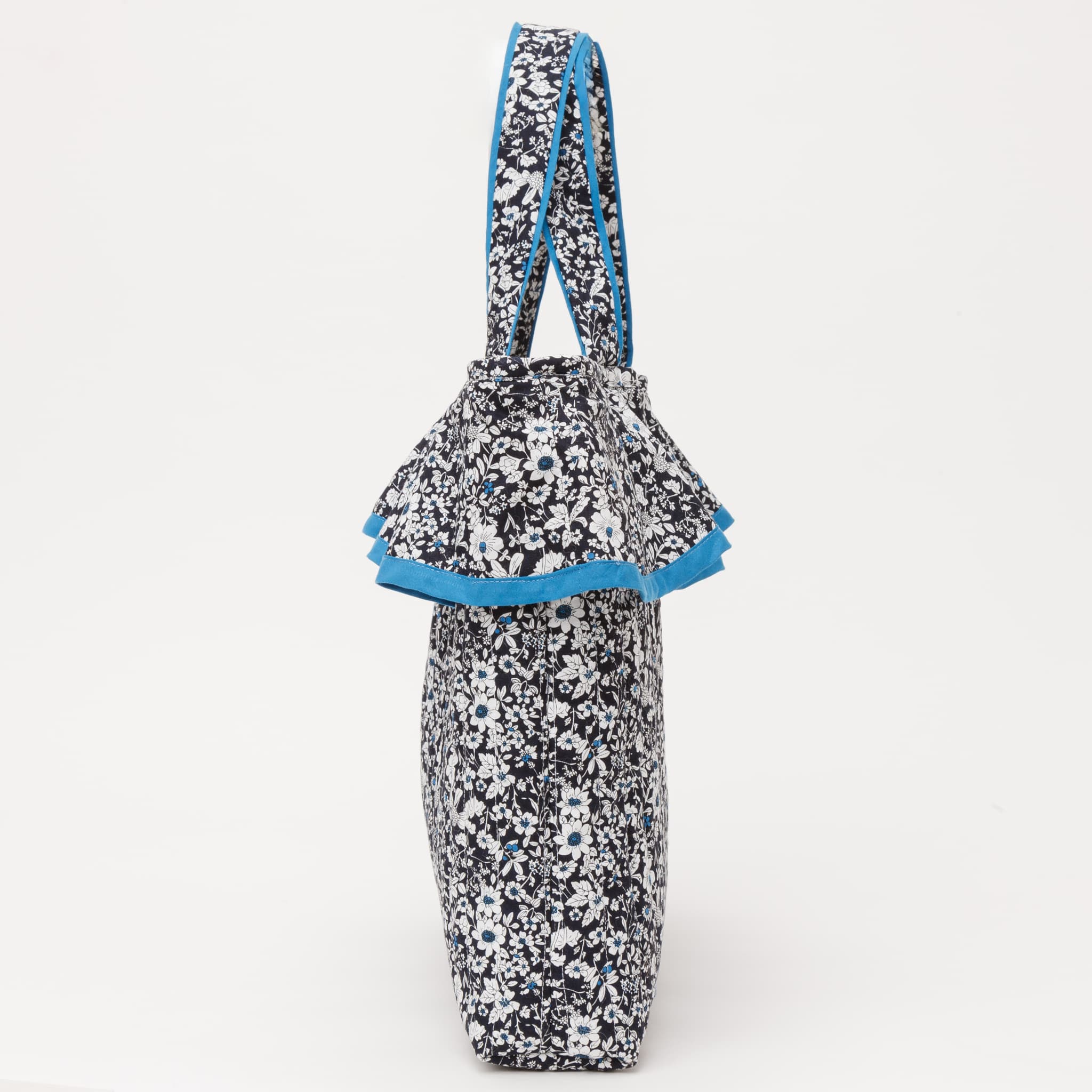 落ち着いたダークブルーの花柄に、鮮やかなブルーで縁取ったフリルが印象的なバッグです。たくさんものが入れられる大容量のバッグで、内側にポケットがついているのも嬉しいポイント。お揃い柄のパソコンケース(13インチ)もすっぽり入るので、セットで使うのもおすすめです!