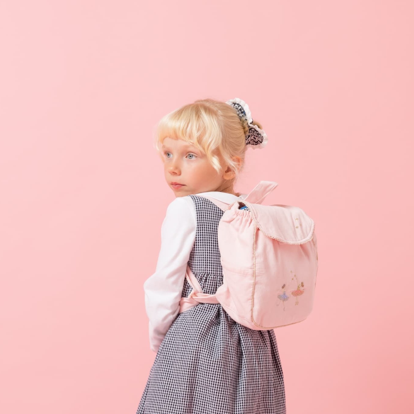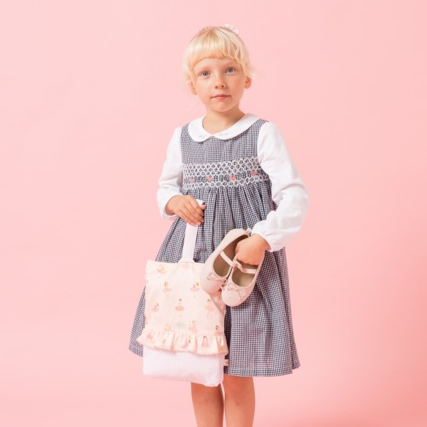 柔らかなピンクの布地に、表情豊かなバレリーナの刺繍が印象的なリュックサック。入れ口が窄まっていることで、コロンとした可愛らしいフォルムに仕上がっています。コンパクトながら収納力が高く、横ポケットには小さなペットボトルを入れることもできるのが嬉しいポイント!日常のお出かけにぴったりのバッグです。