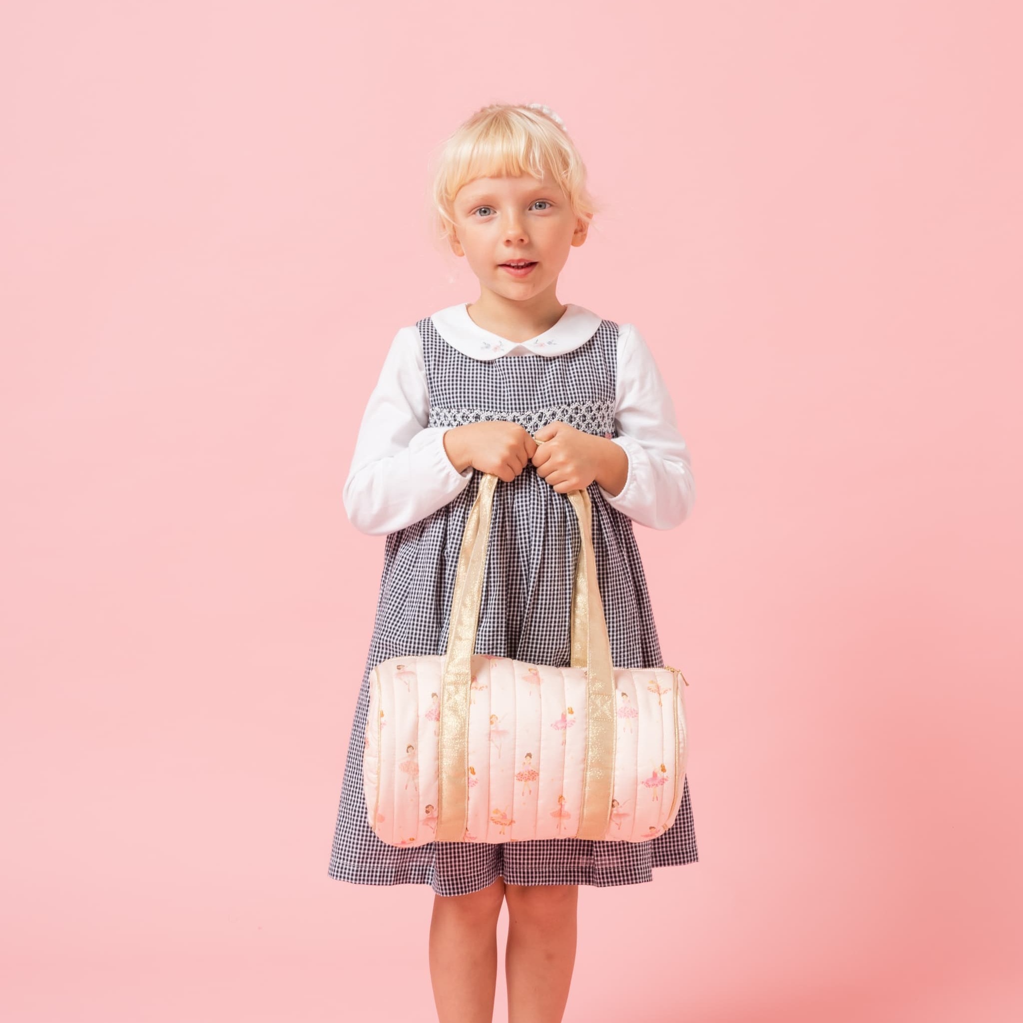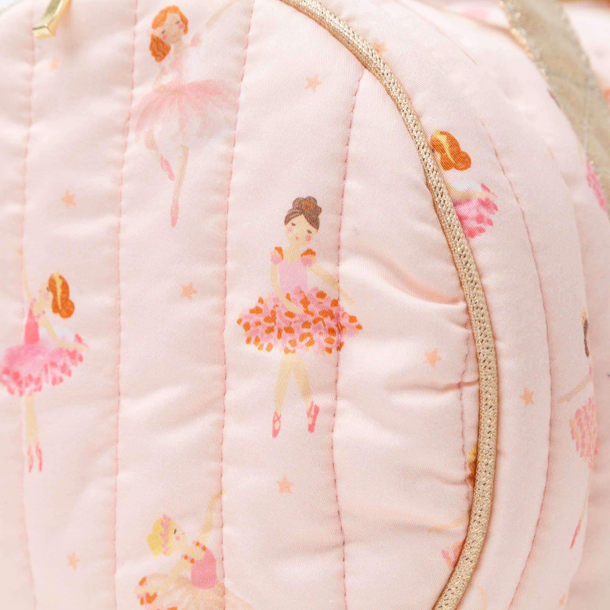 優しいピンクの布地にバレリーナの絵柄が可愛らしいキルティングバッグ。持ち手とファスナーのゴールドがより華やかさを加え、特別感のあるアイテムになっています。コロンと丸いフォルムで、持っているだけで楽しい気分になれること間違いなしです!