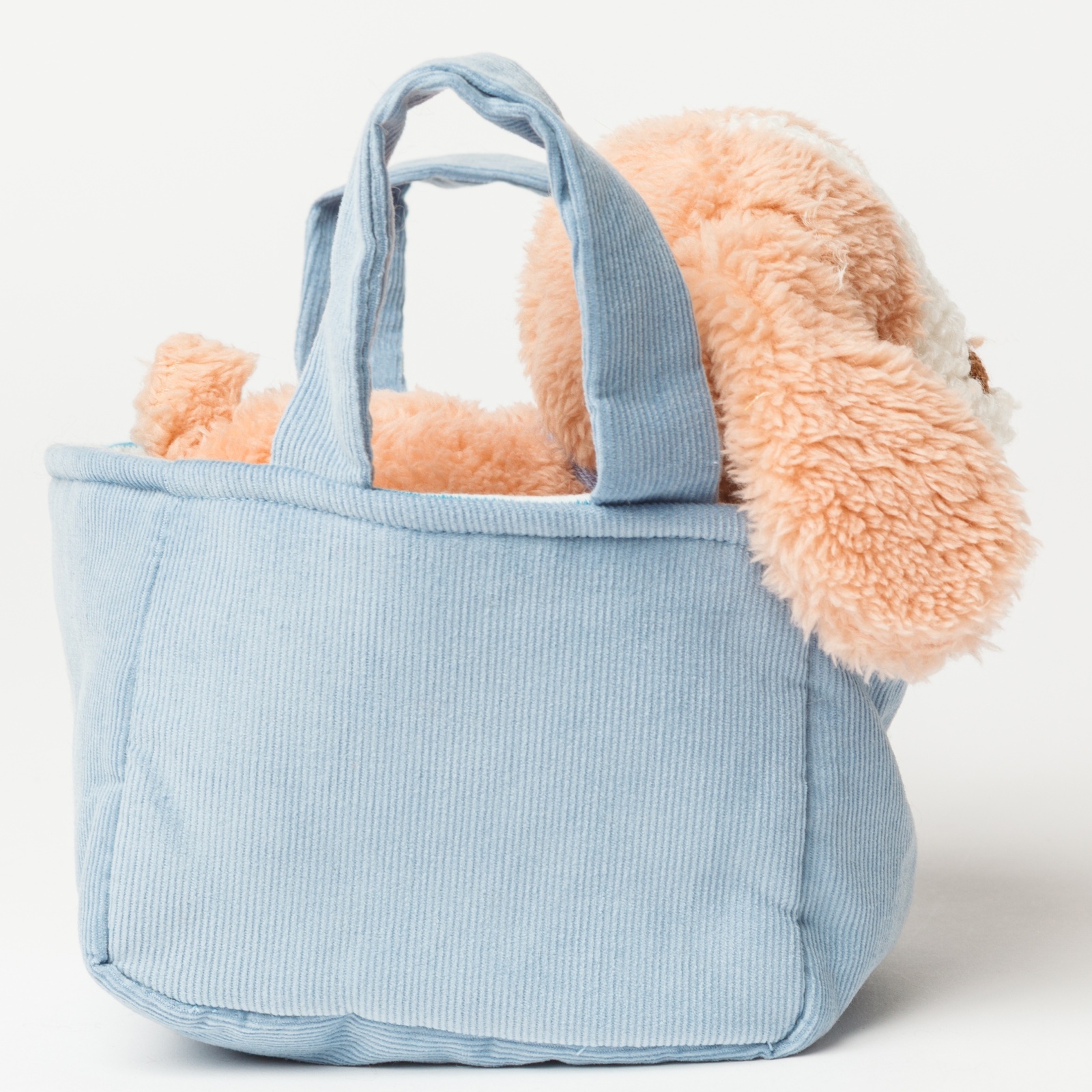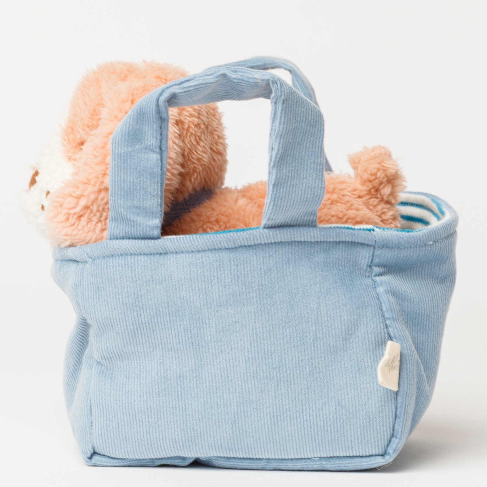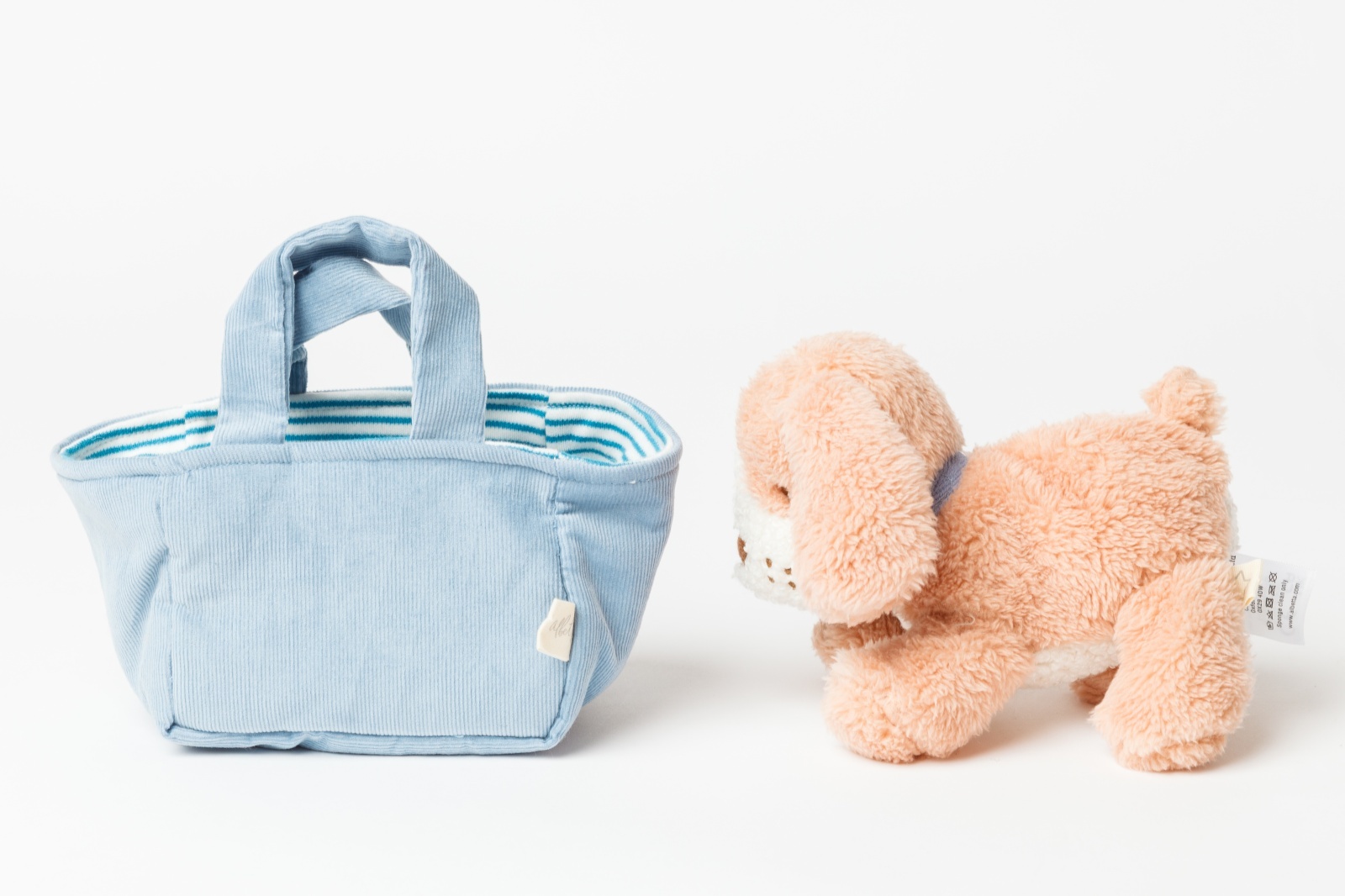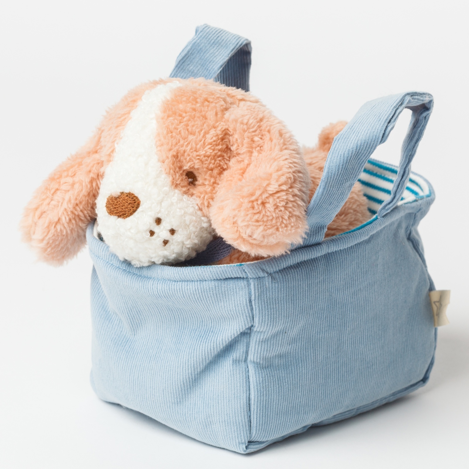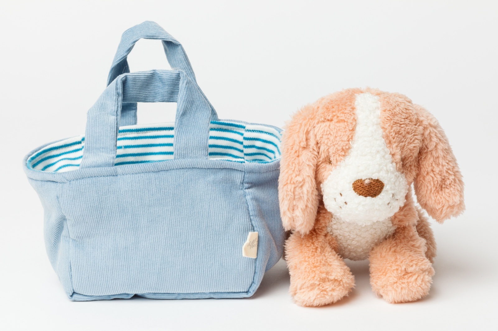 水色の爽やかなバスケットから、わんちゃんがひょっこりとお顔を出している姿がとっても可愛いセットです。バスケットには持ち手が付いているので、小さなお子様でもお気に入りのわんちゃんを連れて、楽しくお出かけができます。温かみのあるコーデュロイ素材とふわふわな質感が心地よく、大切なお友達として毎日を彩ってくれます。