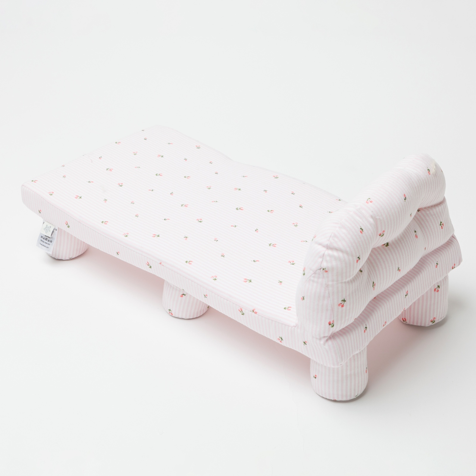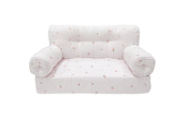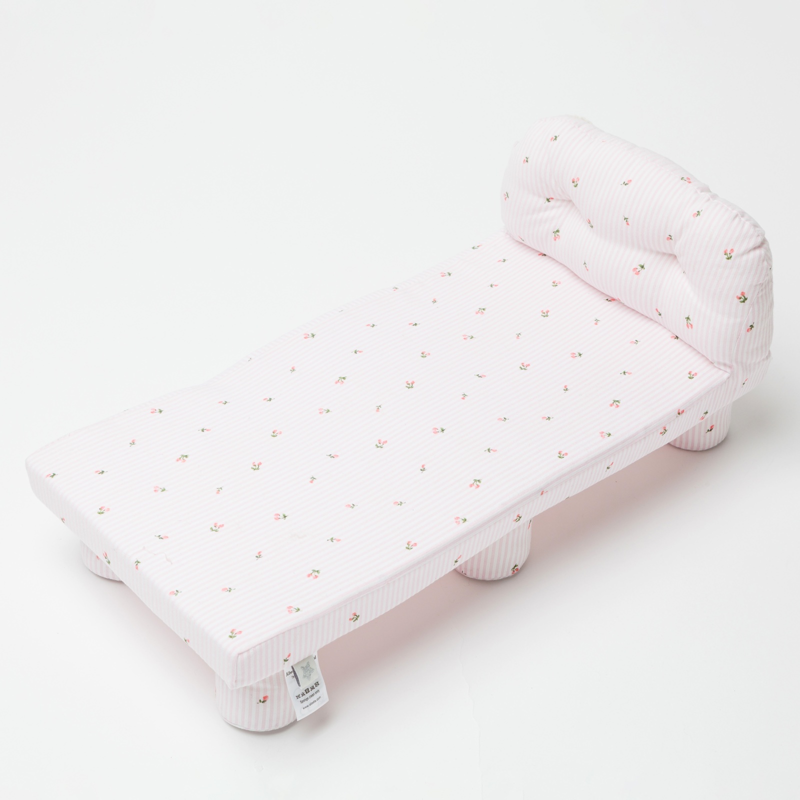 淡いピンクのストライプに、小さなお花が散りばめられた、可憐で優しいデザインのドール専用ベッドです。全体がふかふかと柔らかいクッション素材でできているので、お気に入りのお人形を優しく寝かせることができます。背もたれ付きのゆったりしたデザインで、ごっこ遊びをより楽しく演出してくれます。
