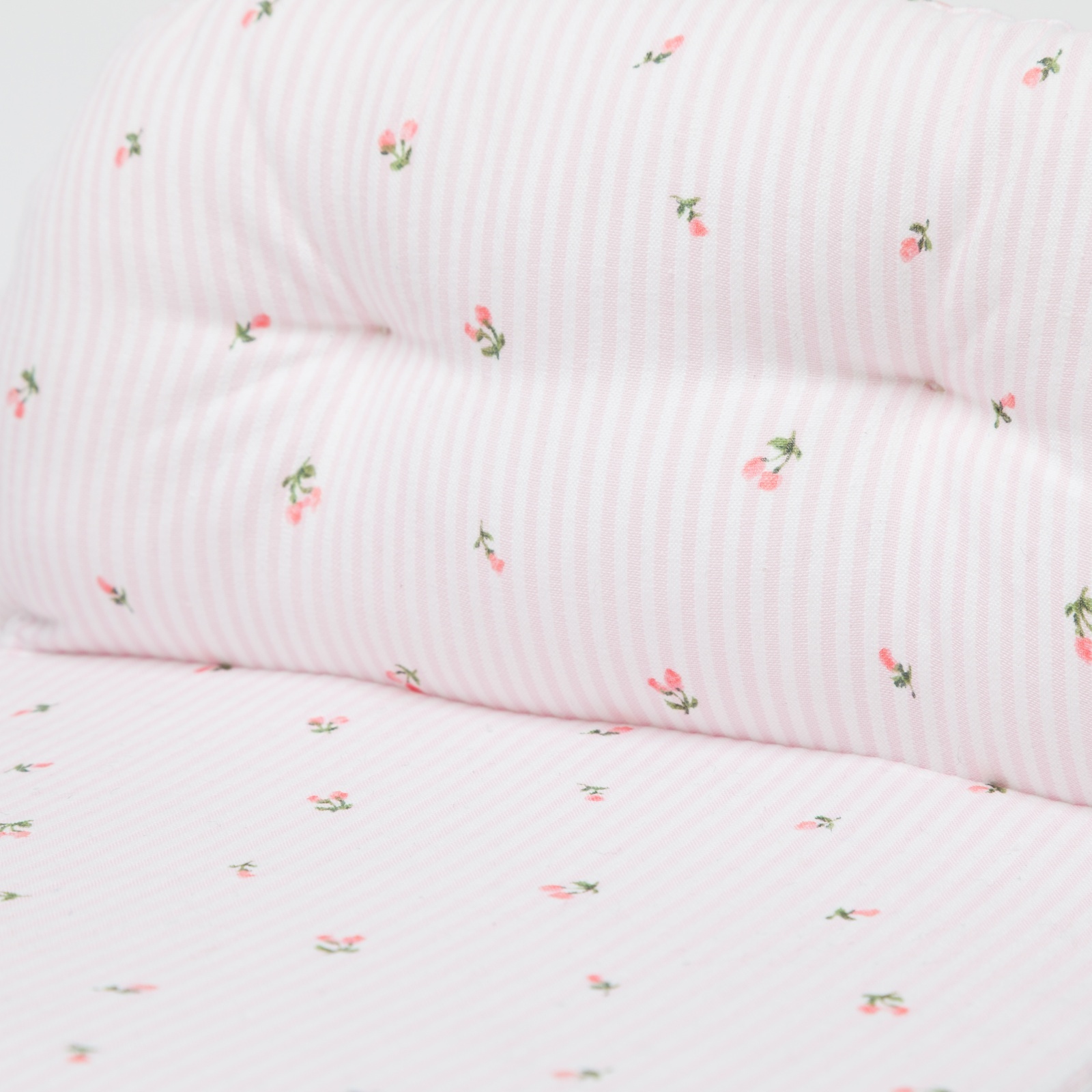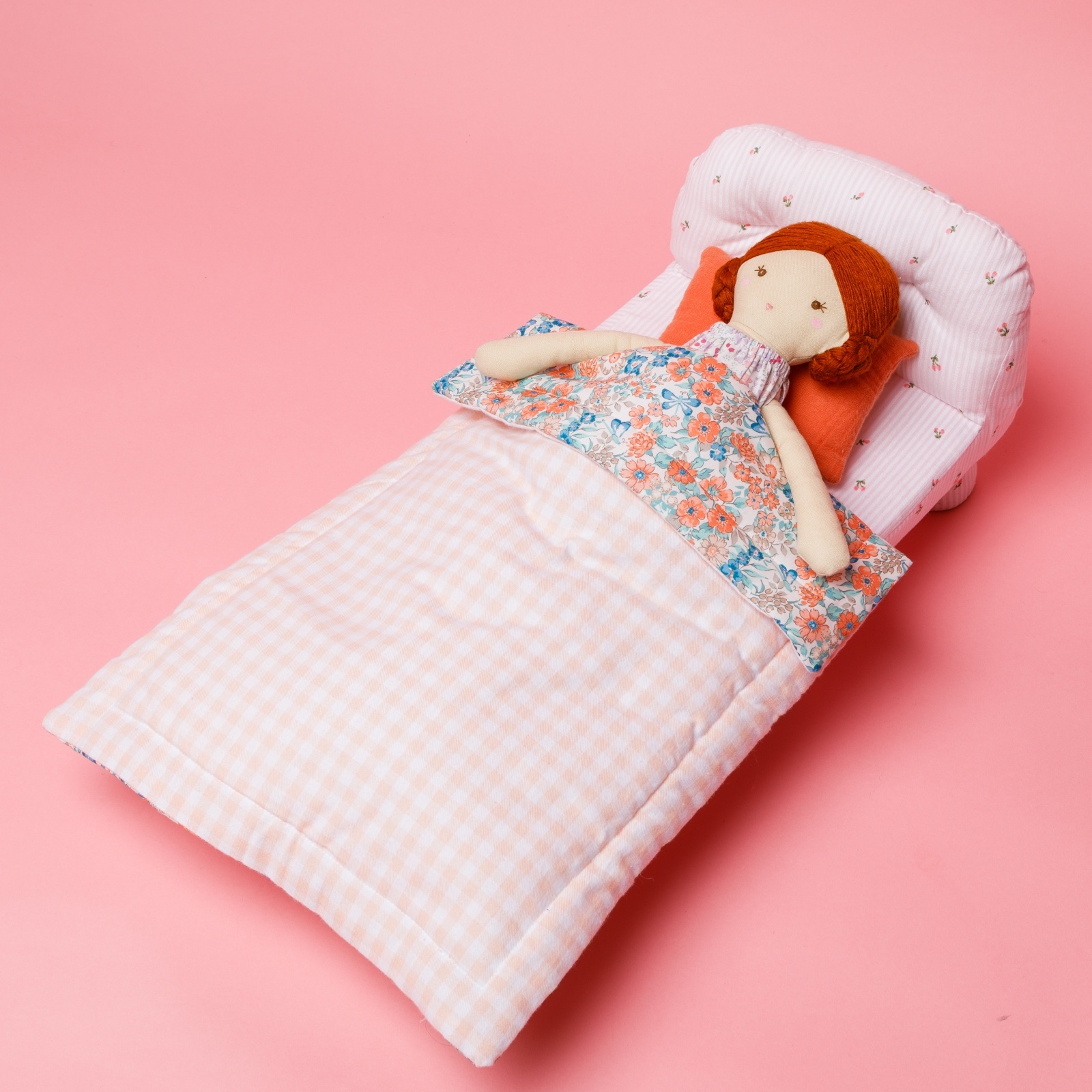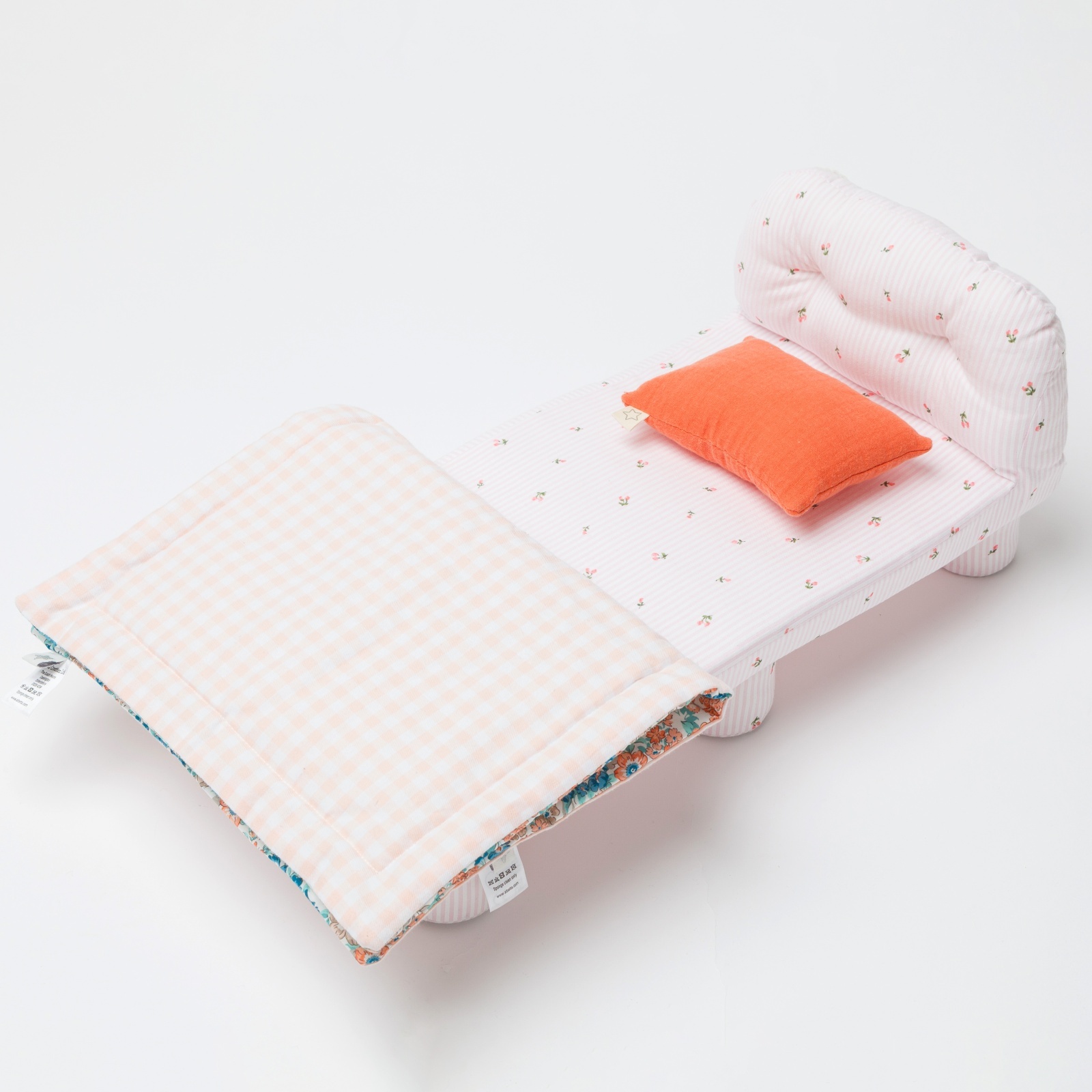 淡いピンクのストライプに、小さなお花が散りばめられた、可憐で優しいデザインのドール専用ベッドです。全体がふかふかと柔らかいクッション素材でできているので、お気に入りのお人形を優しく寝かせることができます。背もたれ付きのゆったりしたデザインで、ごっこ遊びをより楽しく演出してくれます。