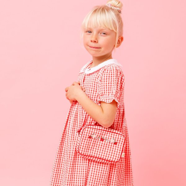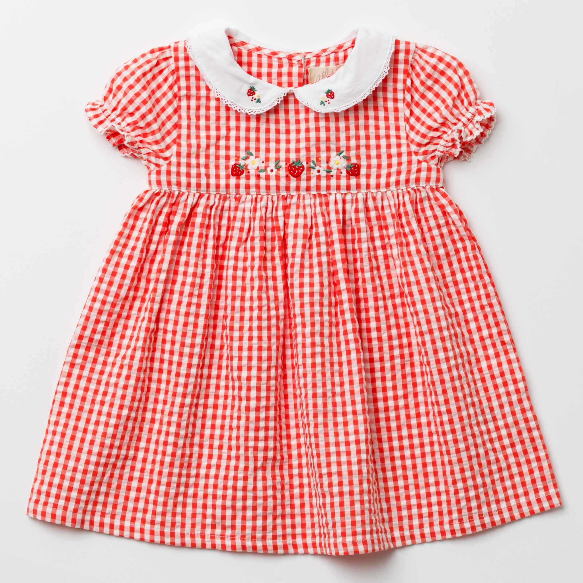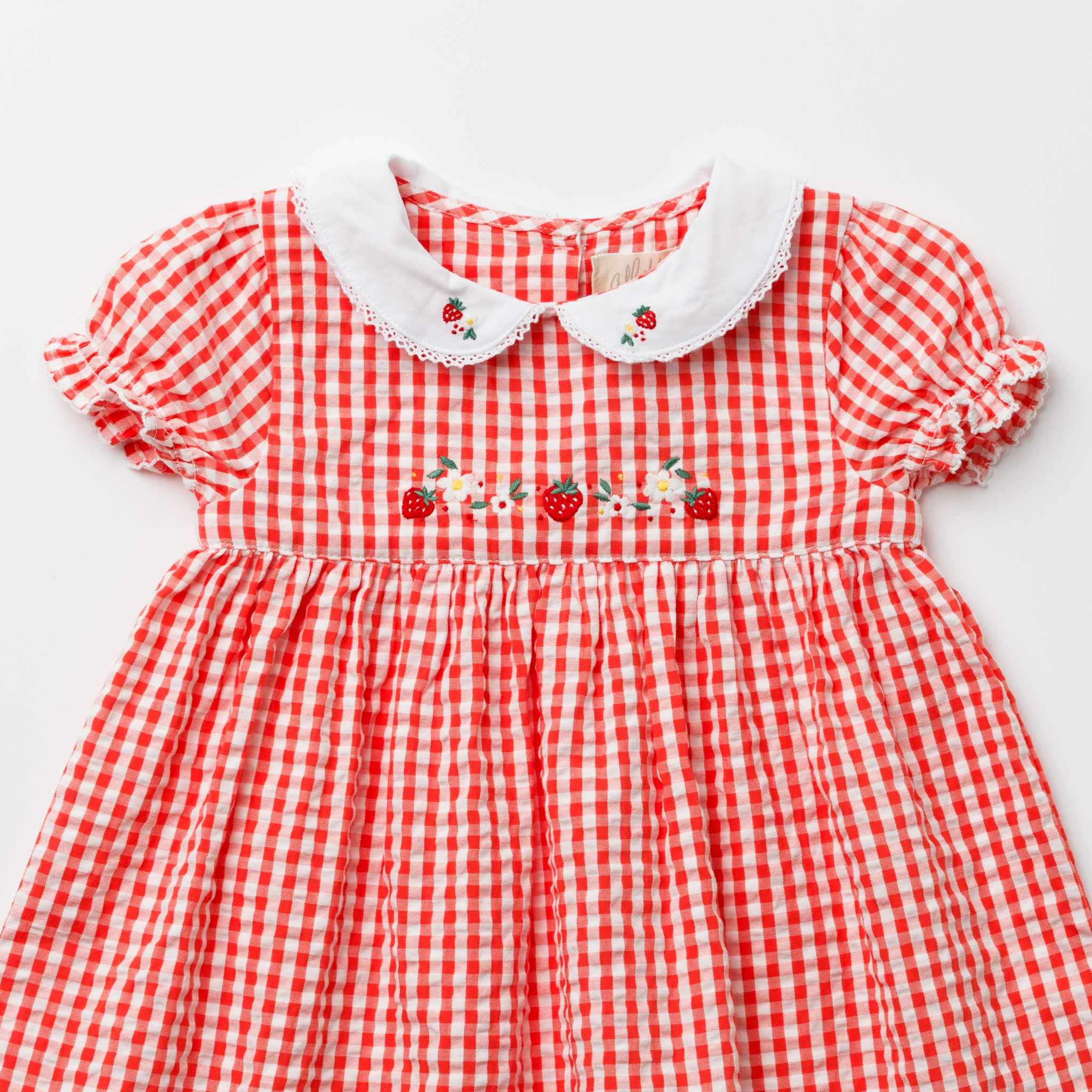 鮮やかなレッドのギンガムチェックに、可憐ないちご刺繍をあしらった愛らしいワンピースです。胸元の手刺繍がやさしいアクセントとなり、白い丸襟やパフスリーブが上品な印象を添えます。軽やかなコットン素材とふんわり広がるシルエットで、着心地も快適。日常のお出かけから特別なシーンまで、可愛らしさを引き立てる一着です。