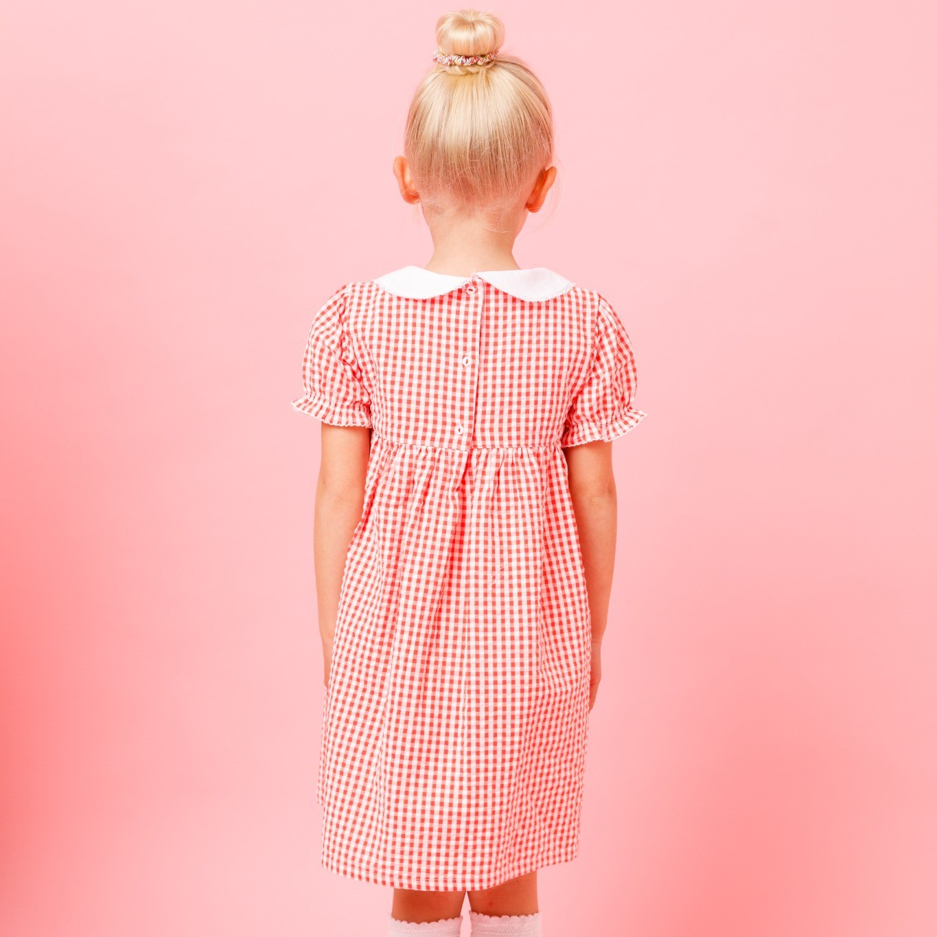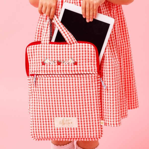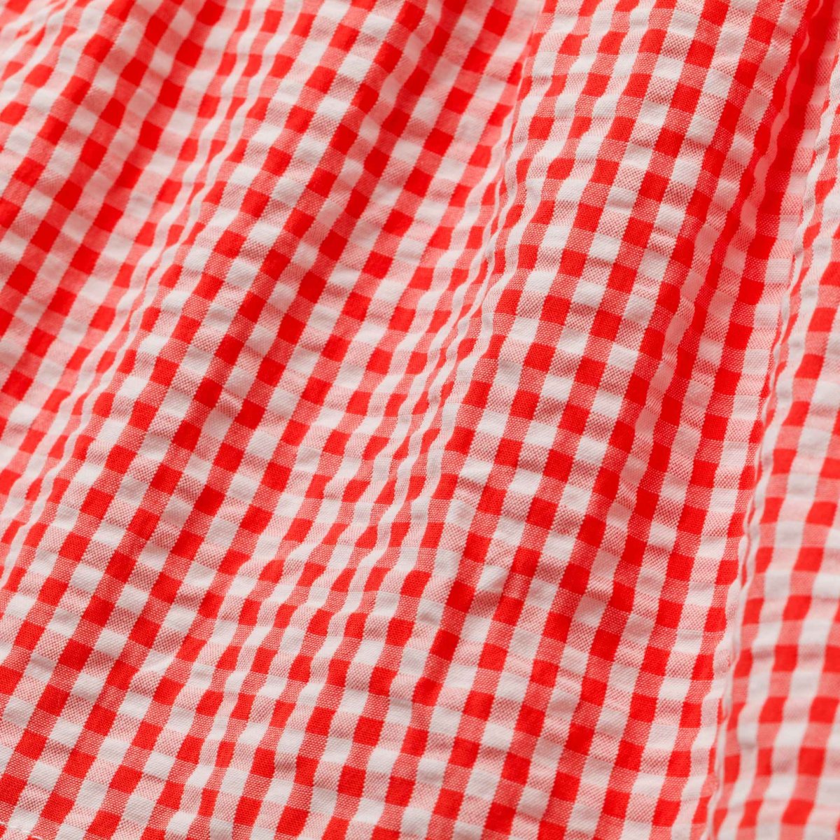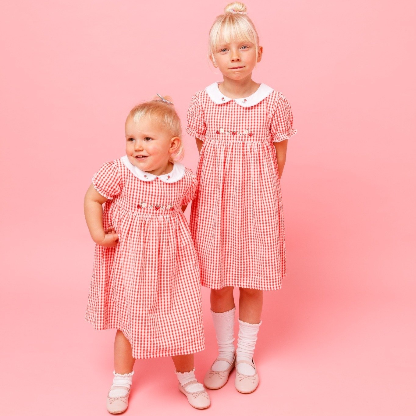 鮮やかなレッドのギンガムチェックに、可憐ないちご刺繍をあしらった愛らしいワンピースです。胸元の手刺繍がやさしいアクセントとなり、白い丸襟やパフスリーブが上品な印象を添えます。軽やかなコットン素材とふんわり広がるシルエットで、着心地も快適。日常のお出かけから特別なシーンまで、可愛らしさを引き立てる一着です。