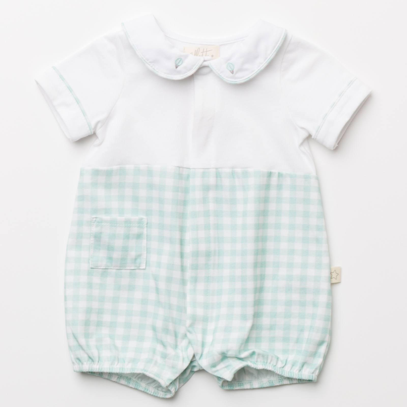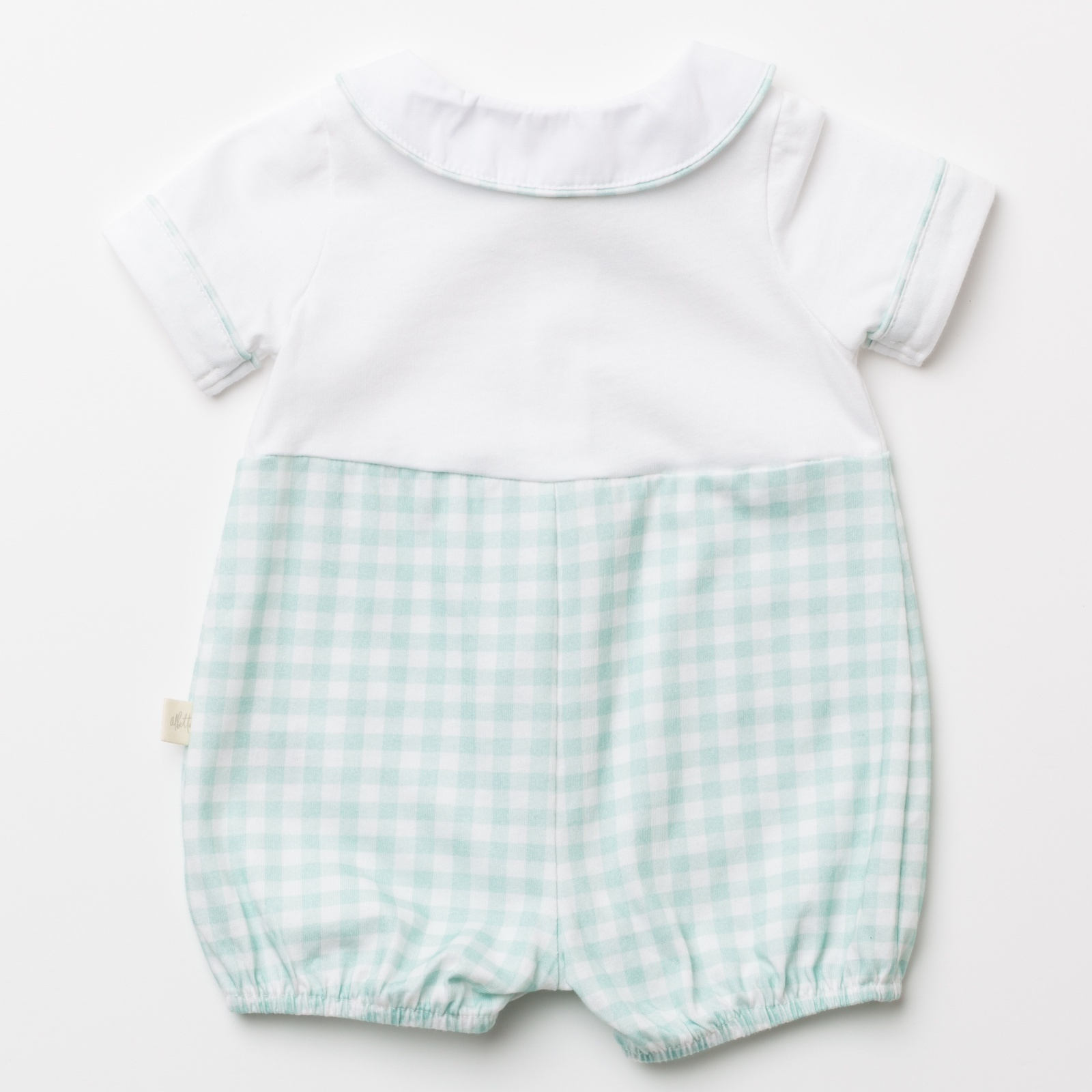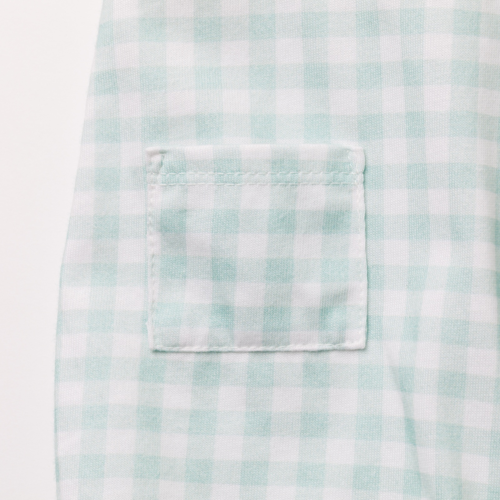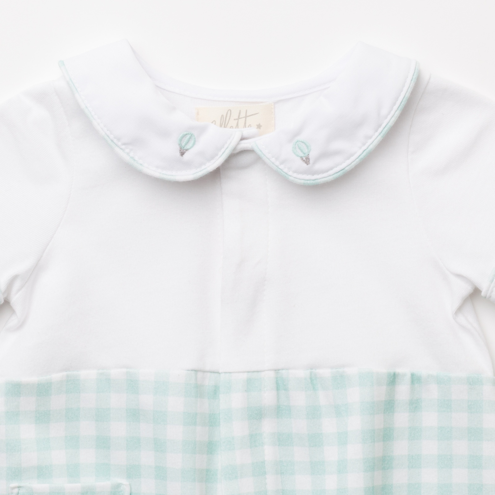 やさしいグリーンのギンガムチェックに、襟元の気球刺繍が愛らしいアクセントを添えるロンパースです。丸みのある襟と繊細な刺繍が上品で可憐な印象を演出。やわらかな素材とゆったりとしたシルエットで着心地も良く、スナップボタン仕様でお着替えもスムーズです。デイリーからお出かけまで幅広く活躍する一着です。