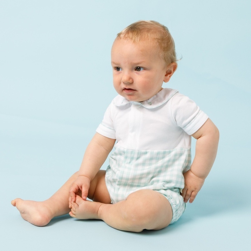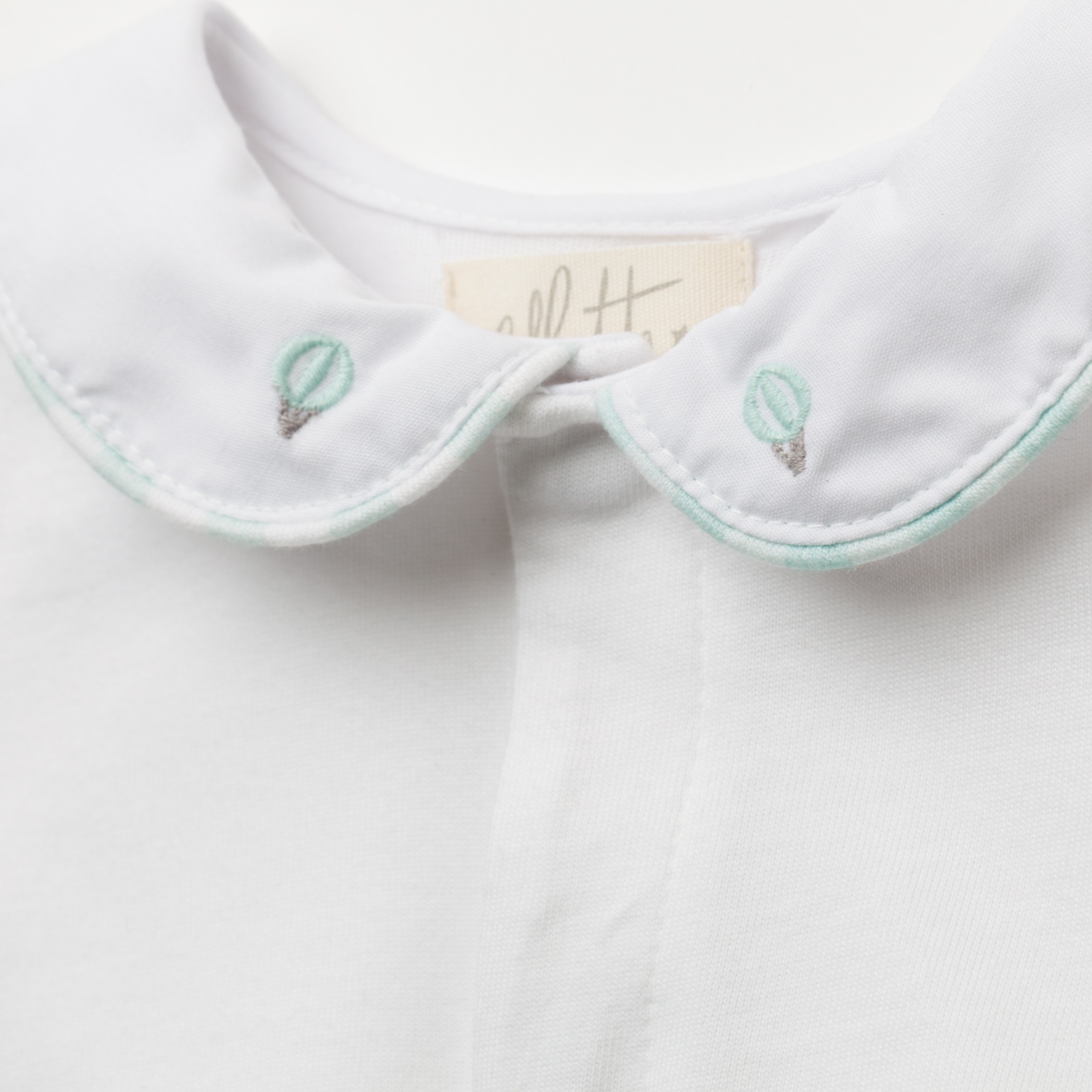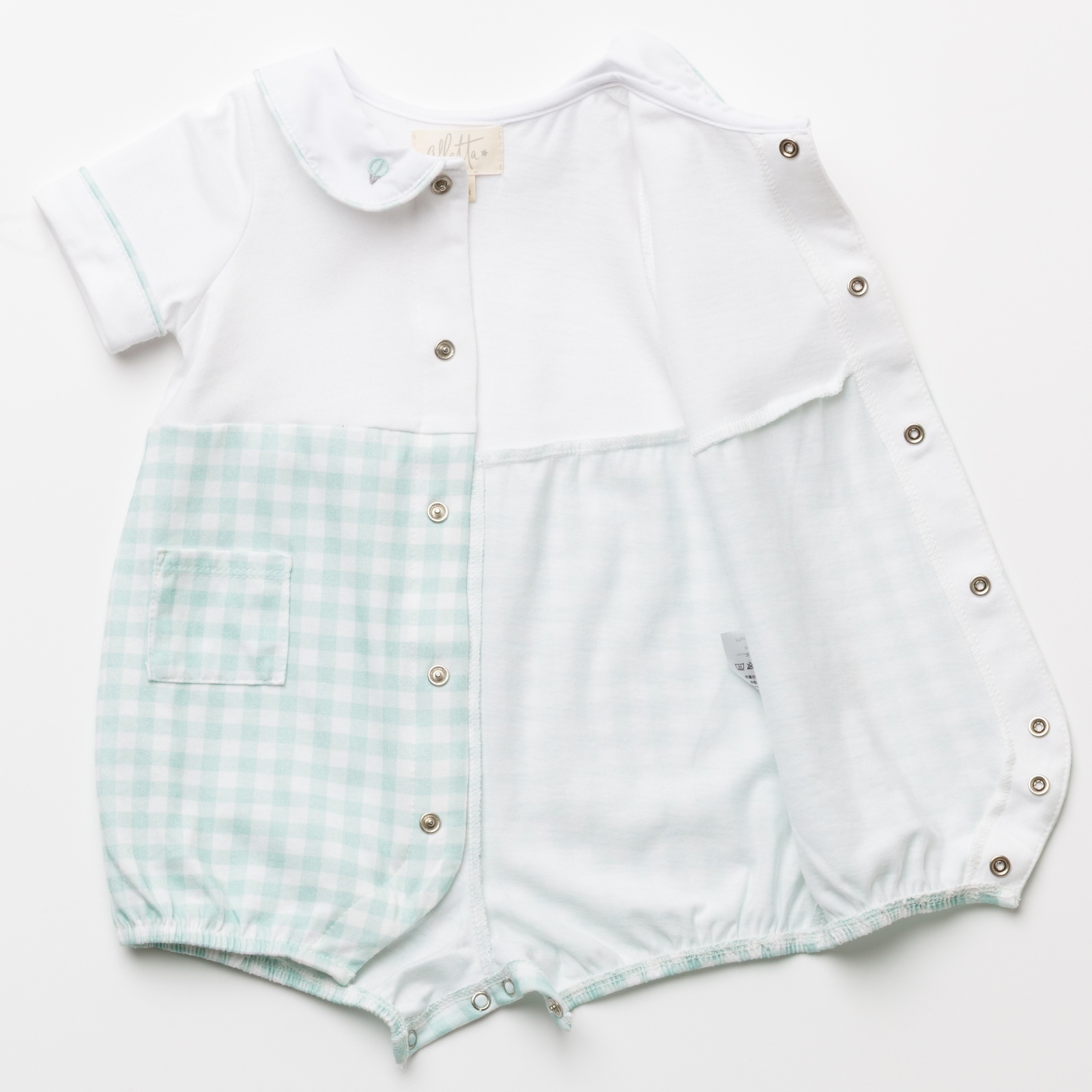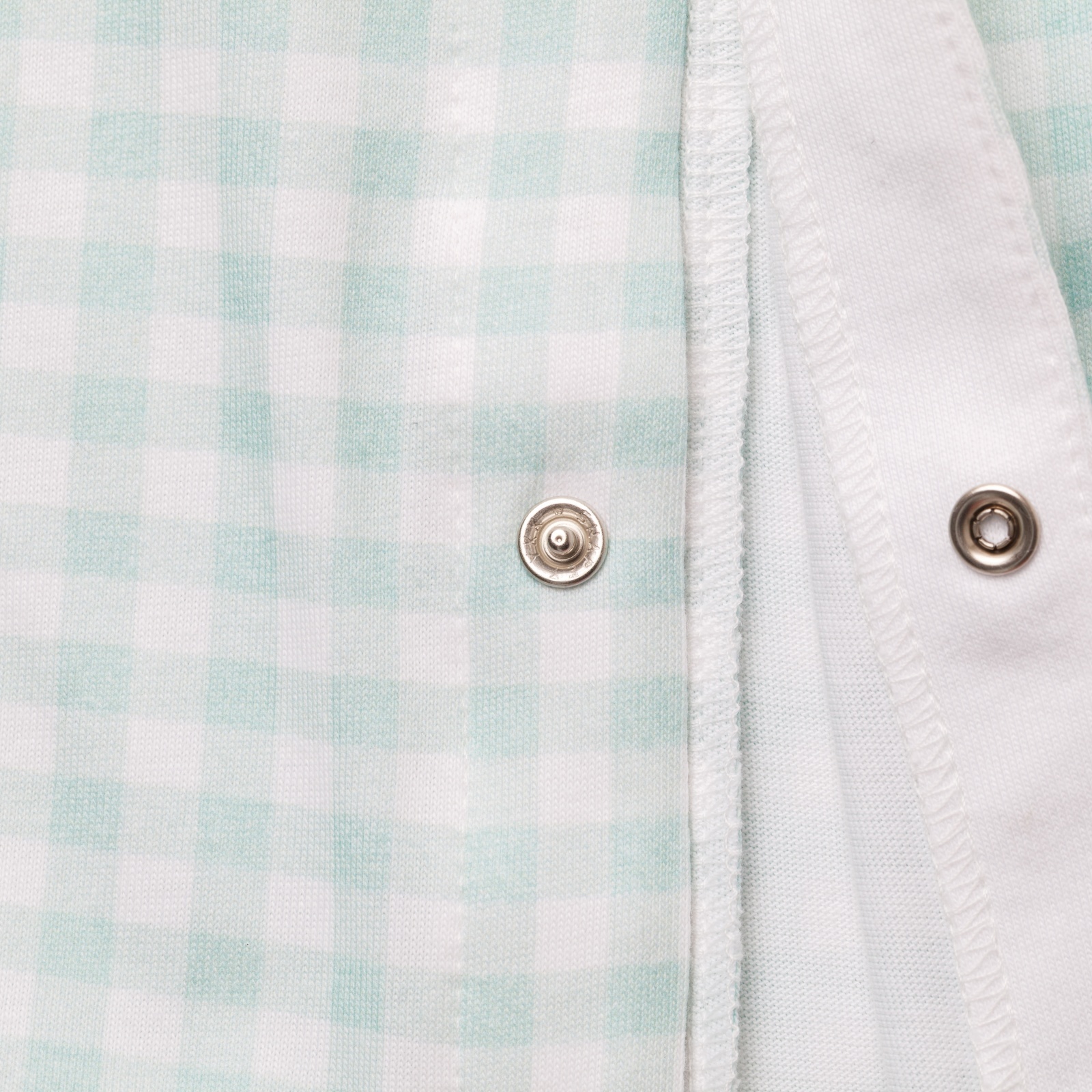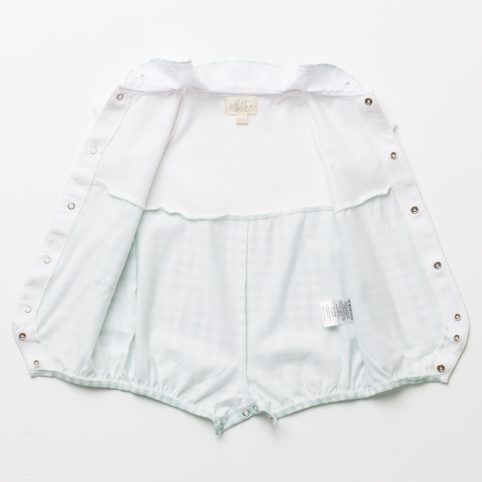 やさしいグリーンのギンガムチェックに、襟元の気球刺繍が愛らしいアクセントを添えるロンパースです。丸みのある襟と繊細な刺繍が上品で可憐な印象を演出。やわらかな素材とゆったりとしたシルエットで着心地も良く、スナップボタン仕様でお着替えもスムーズです。デイリーからお出かけまで幅広く活躍する一着です。