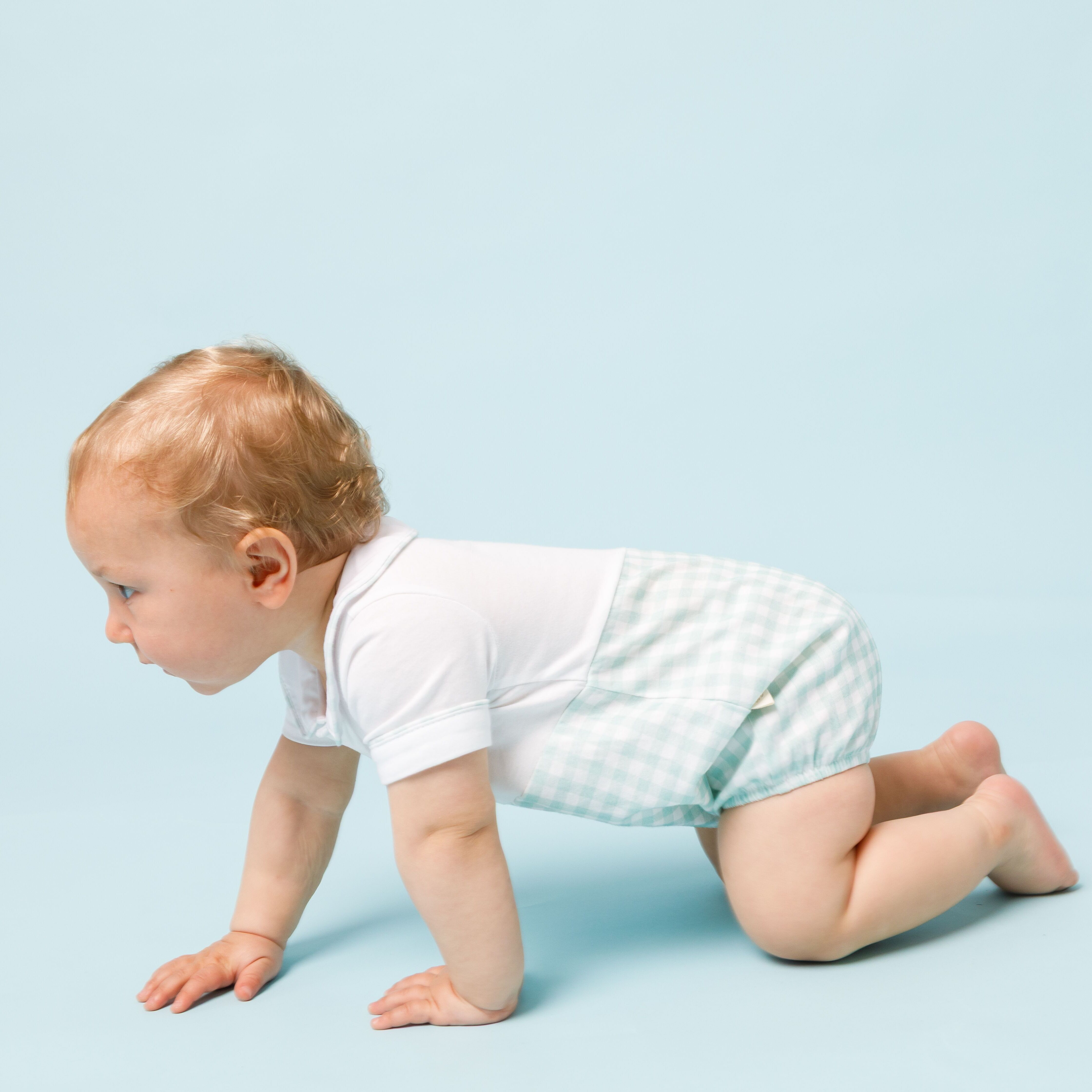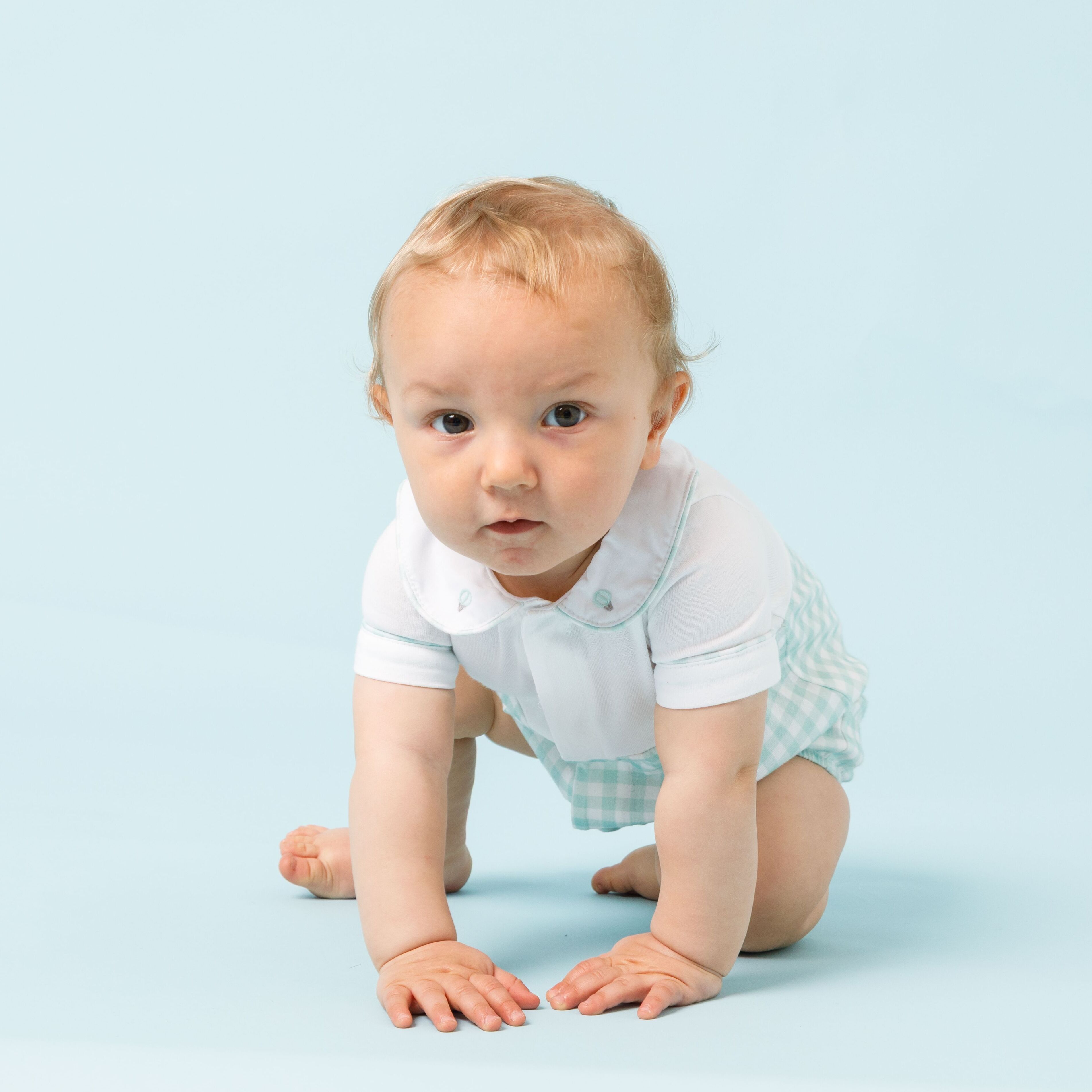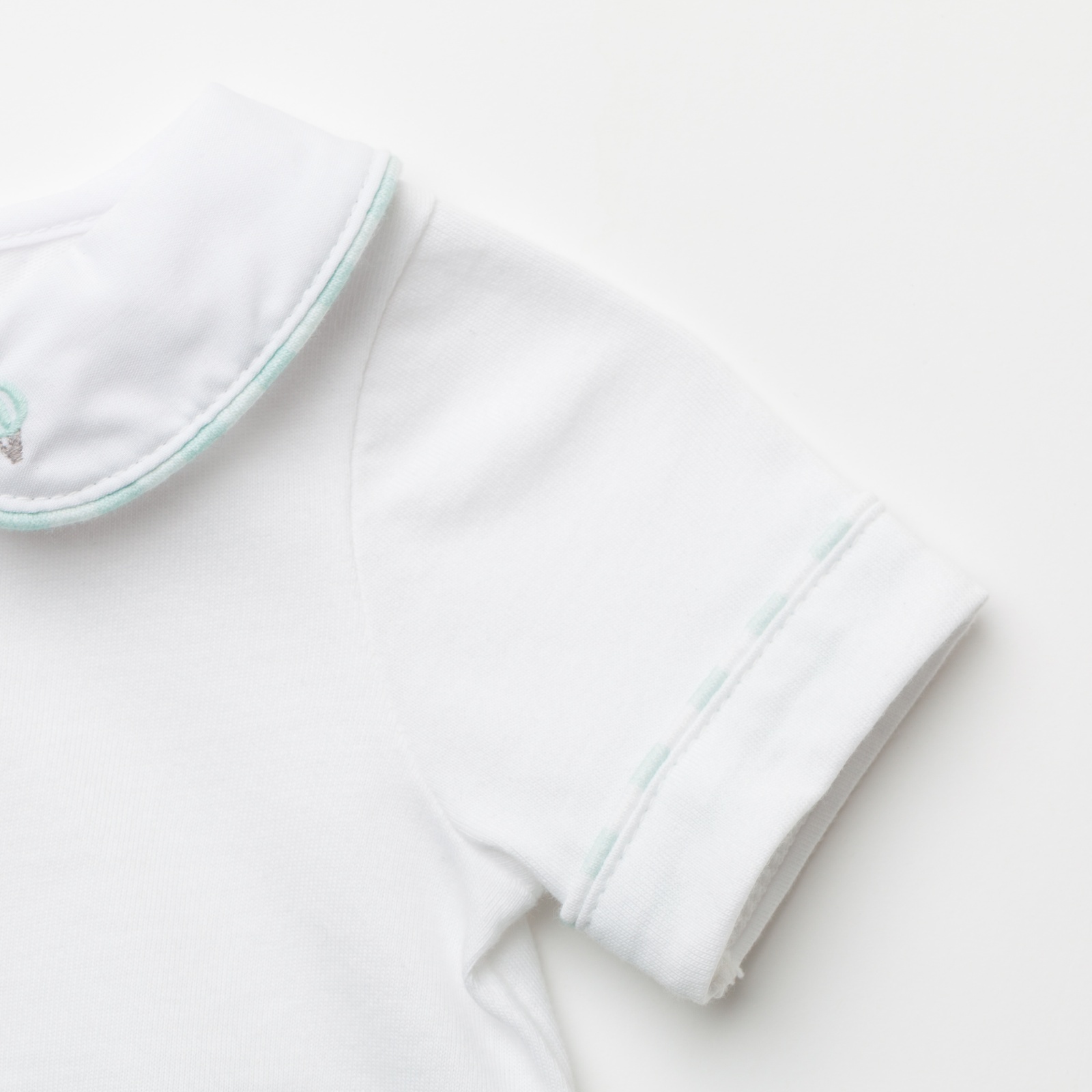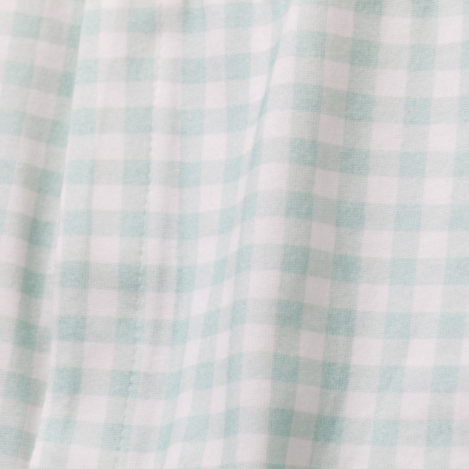 やさしいグリーンのギンガムチェックに、襟元の気球刺繍が愛らしいアクセントを添えるロンパースです。丸みのある襟と繊細な刺繍が上品で可憐な印象を演出。やわらかな素材とゆったりとしたシルエットで着心地も良く、スナップボタン仕様でお着替えもスムーズです。デイリーからお出かけまで幅広く活躍する一着です。