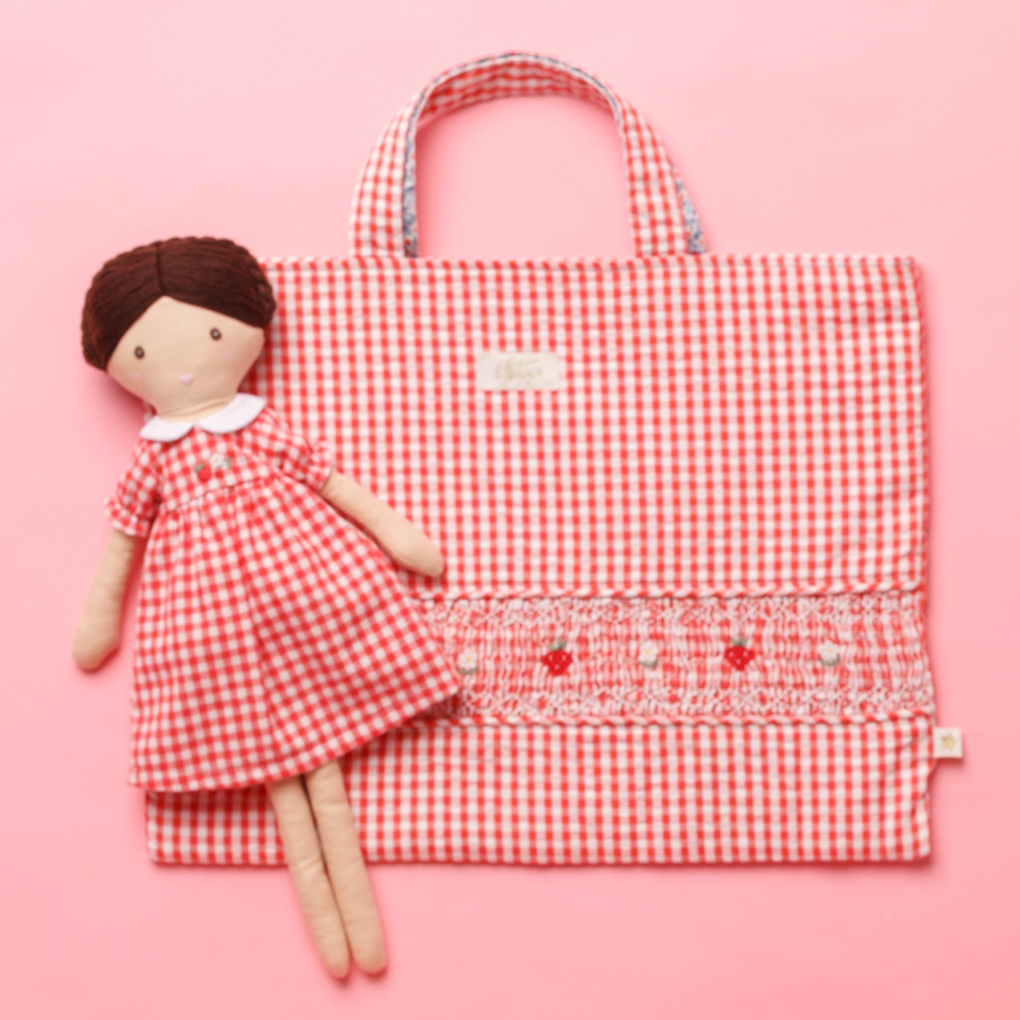可愛らしい赤のギンガムチェックに、ぷっくりとした苺の刺繍がアクセントを添える、遊び心あふれるデザインのバッグです。スモッキング部分に施された細やかな手仕事が高級感を醸し出し、可愛らしさの中にも上品な印象を与えてくれます。マチのないフラットな形状は書類や絵本が収まりやすく、お子様の通園バッグとしてはもちろん、大人のサブバッグとしても目を引く一品です。※ドール・ドールドレスは別売となります。