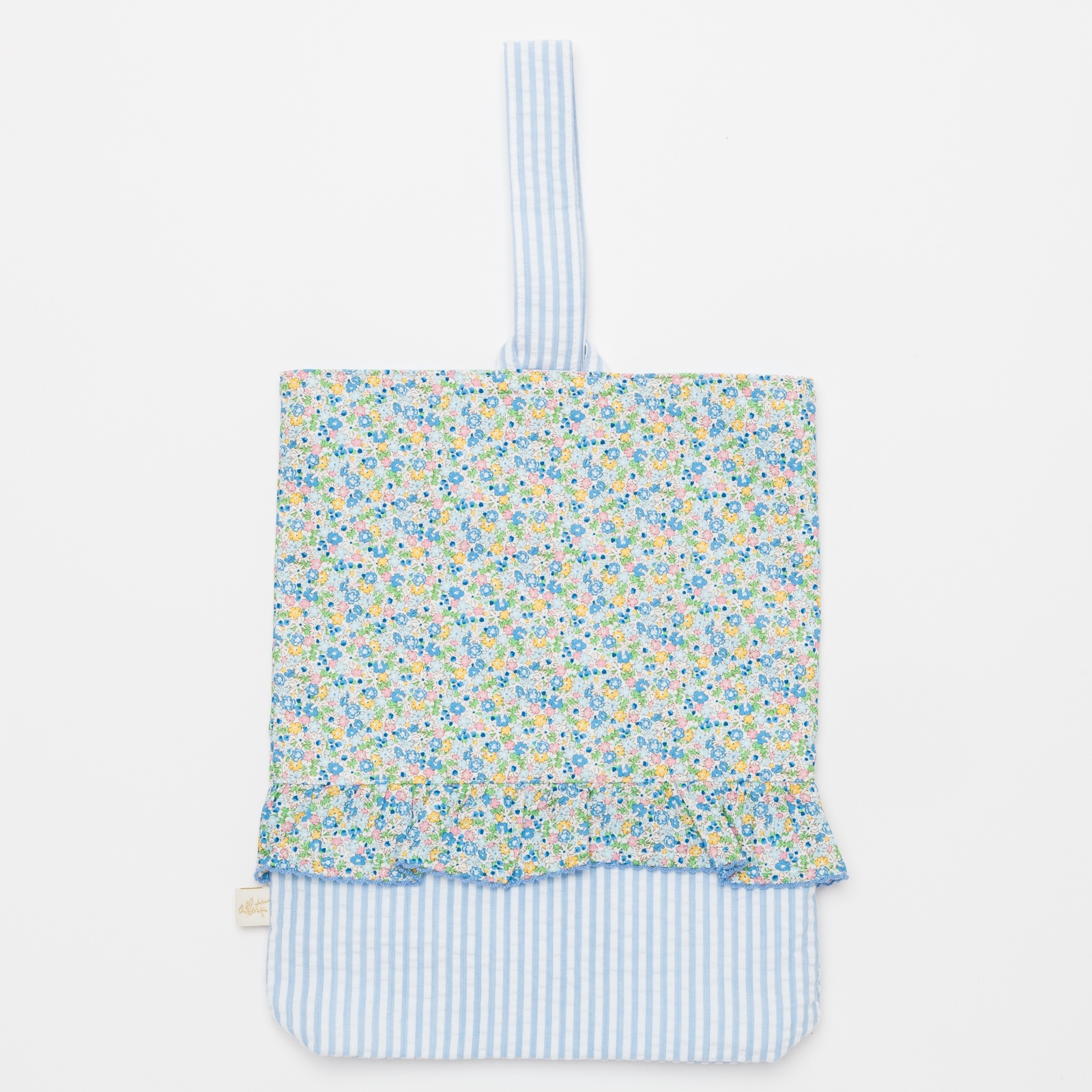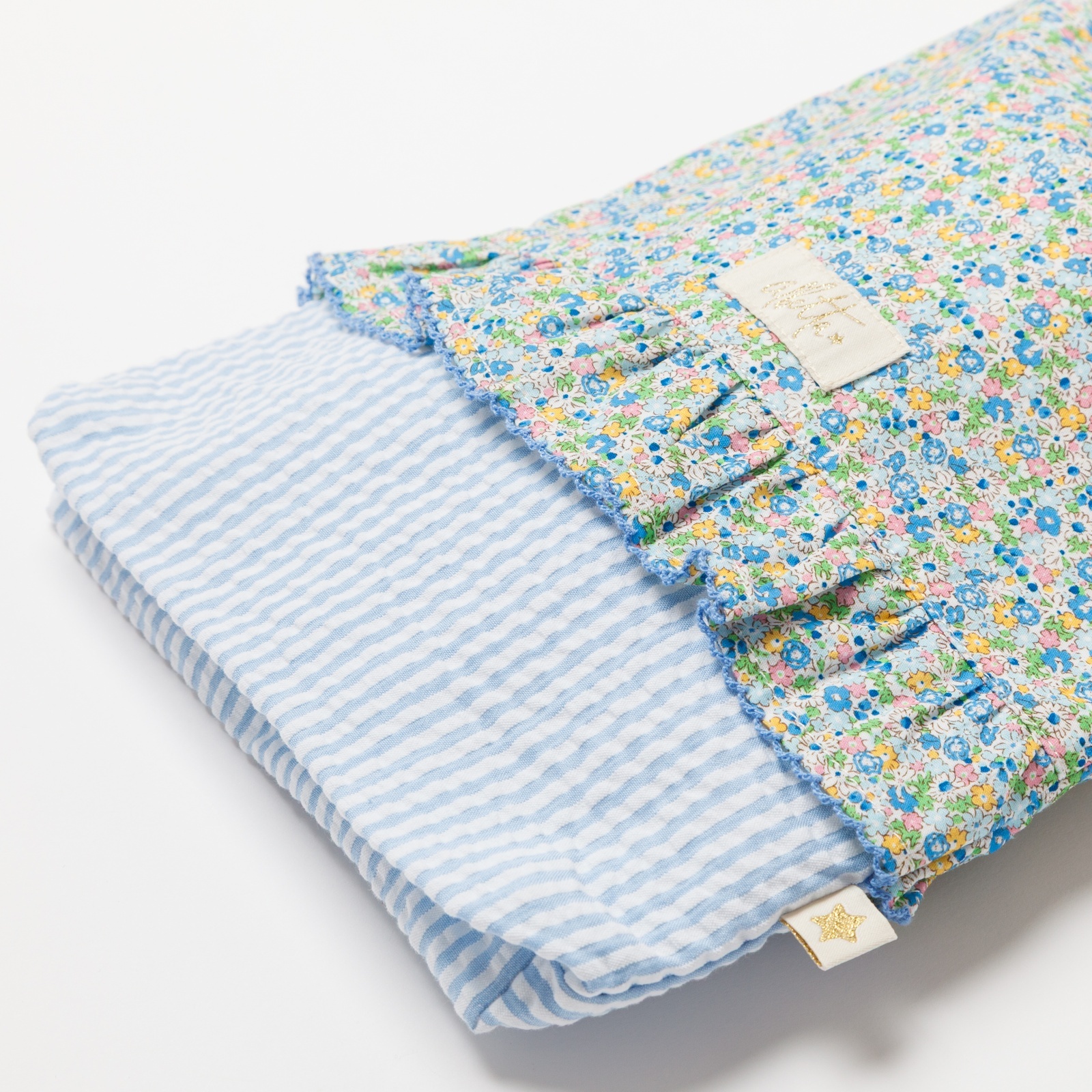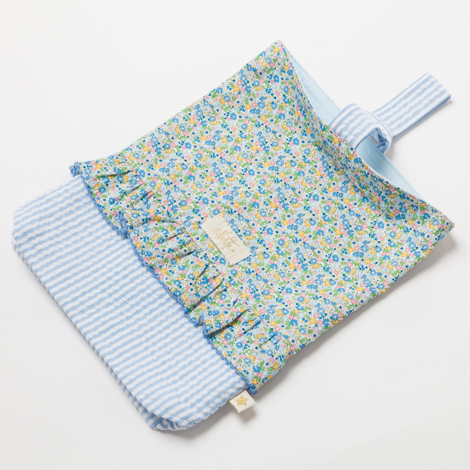 可憐な小花柄と清涼感のあるストライプを、贅沢なフリルで繋ぎ合わせた気品あふれるシューズバッグです。