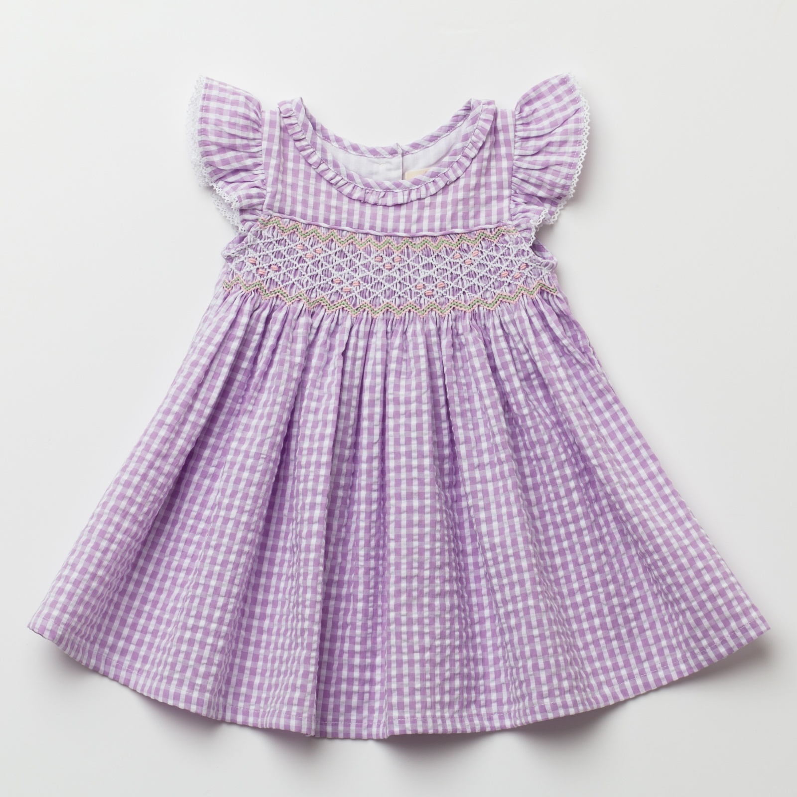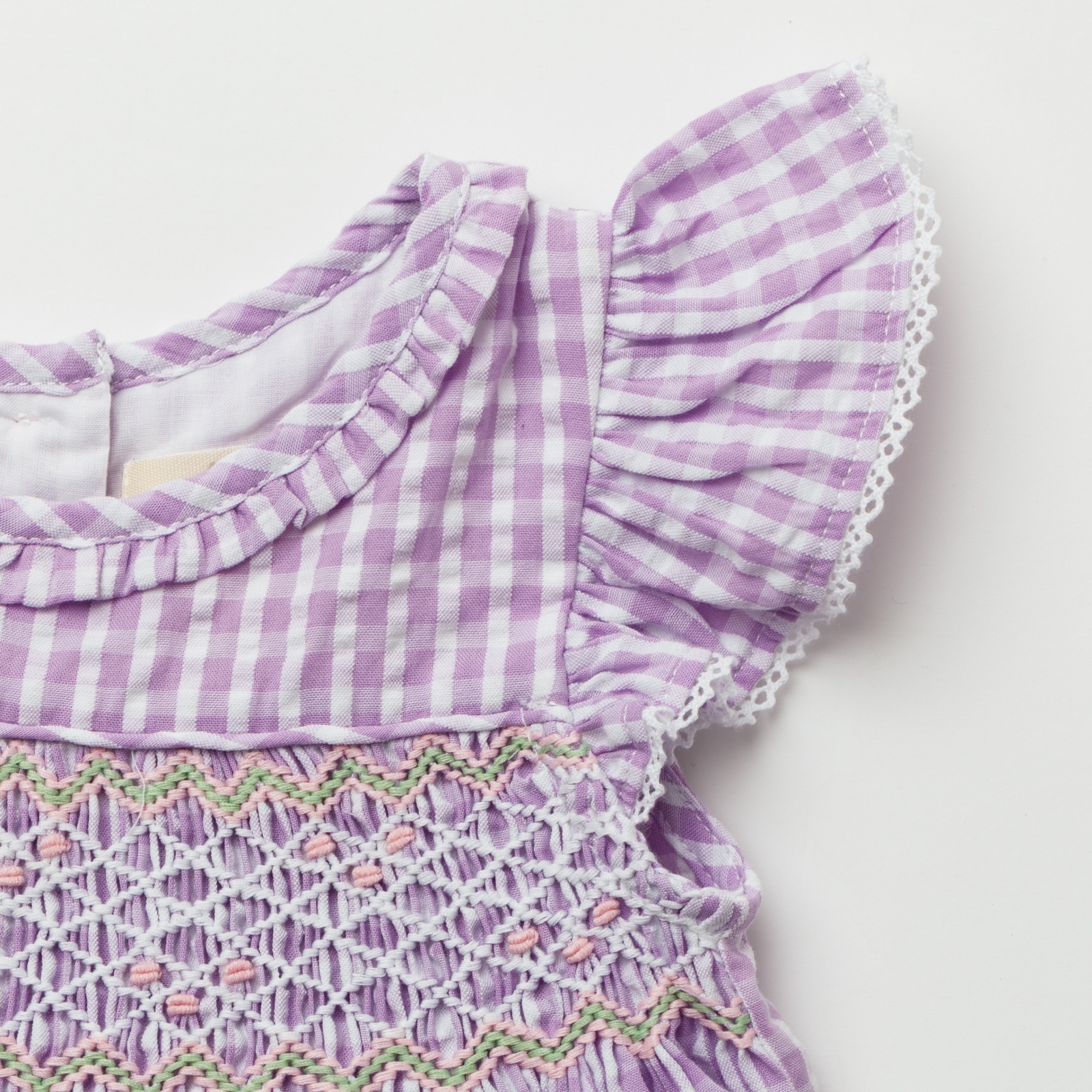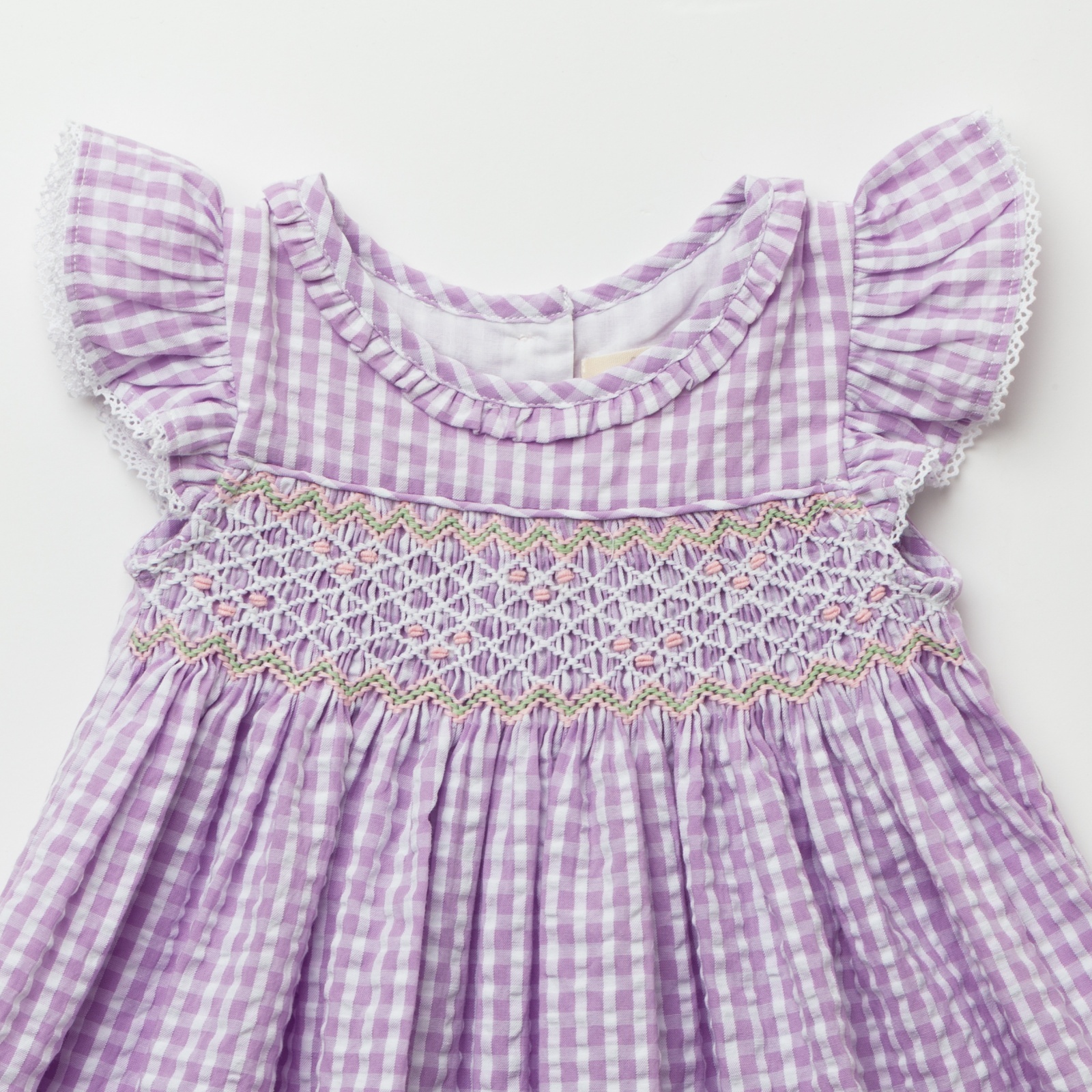 ラベンダーカラーのやさしいギンガムチェックに、胸元の手刺繍のハンドスモッキングが美しく映えるワンピースです。軽やかなコットン素材とふんわり広がるシルエットが、上品で可愛らしい印象に仕上げています。袖のフリルや繊細なレース使いなど細部まで丁寧に作られており、特別なお出かけや記念日にもぴったりの一着です。お揃いのドールドレスと合わせて、リンクコーデも楽しめます。