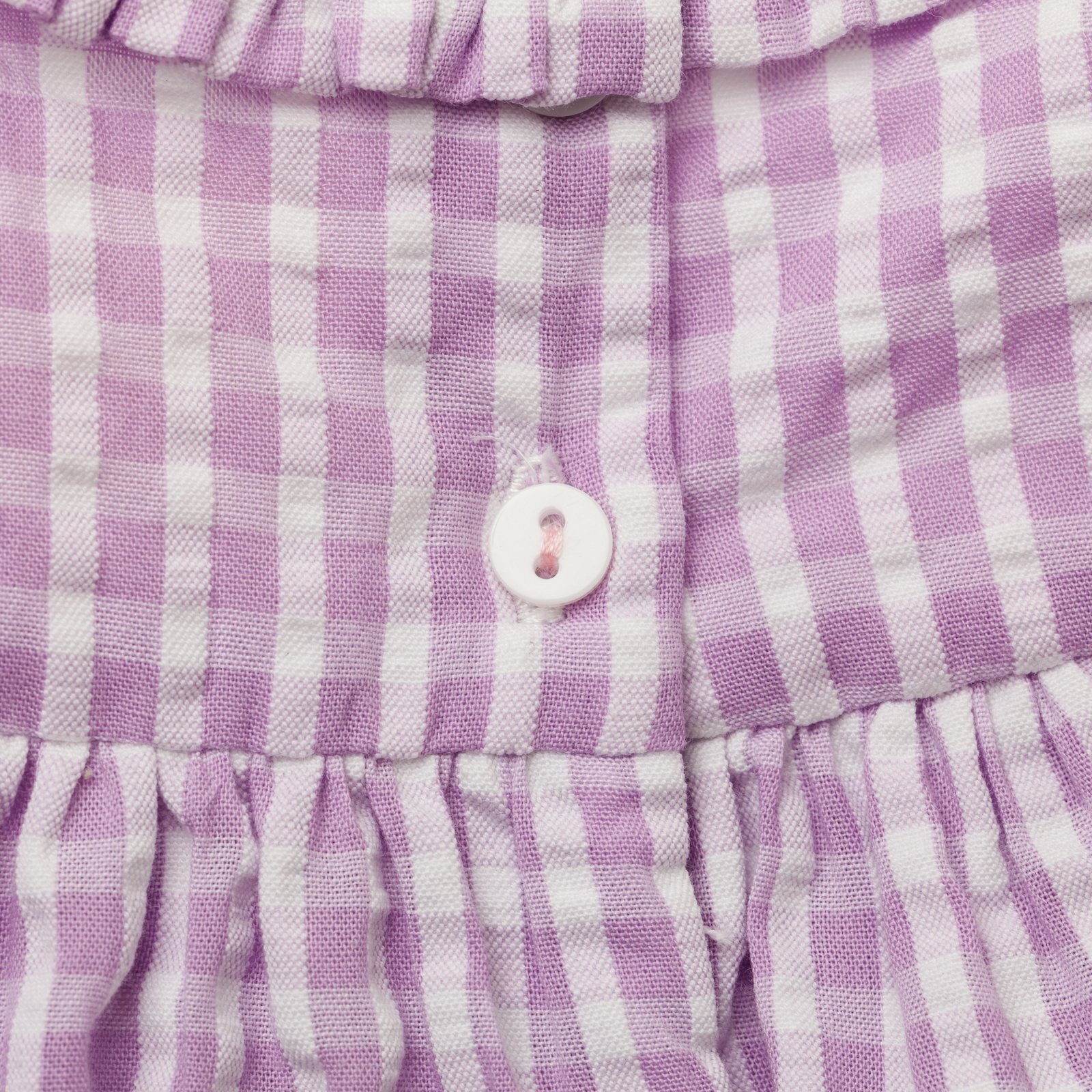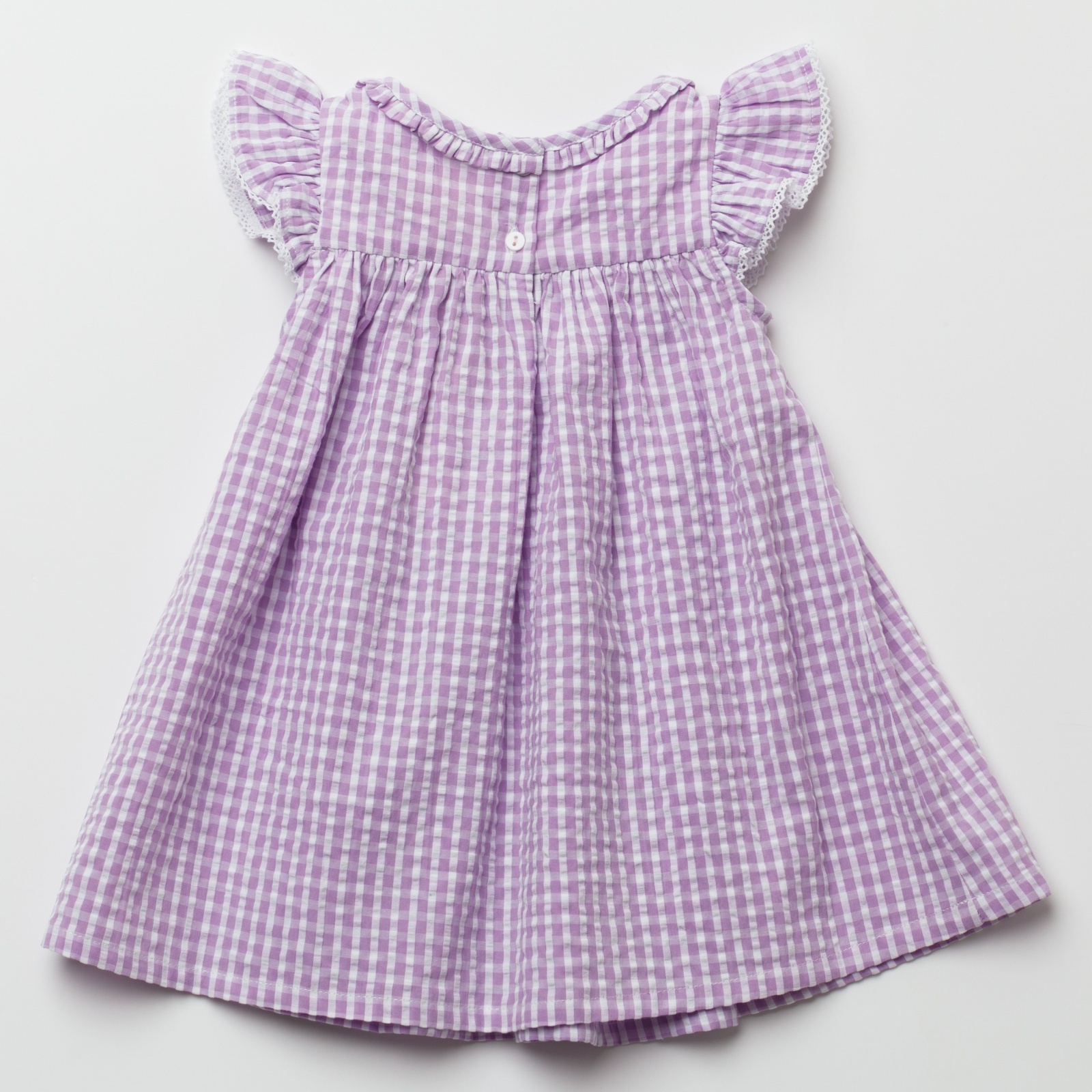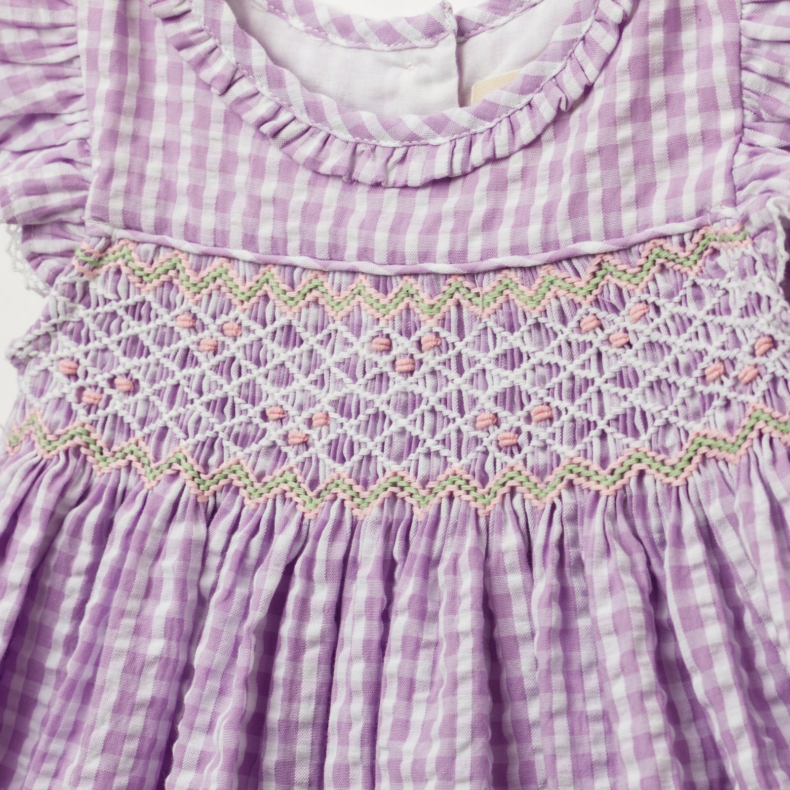 ラベンダーカラーのやさしいギンガムチェックに、胸元の手刺繍のハンドスモッキングが美しく映えるワンピースです。軽やかなコットン素材とふんわり広がるシルエットが、上品で可愛らしい印象に仕上げています。袖のフリルや繊細なレース使いなど細部まで丁寧に作られており、特別なお出かけや記念日にもぴったりの一着です。お揃いのドールドレスと合わせて、リンクコーデも楽しめます。