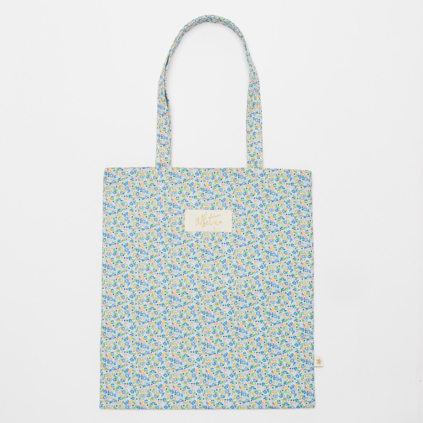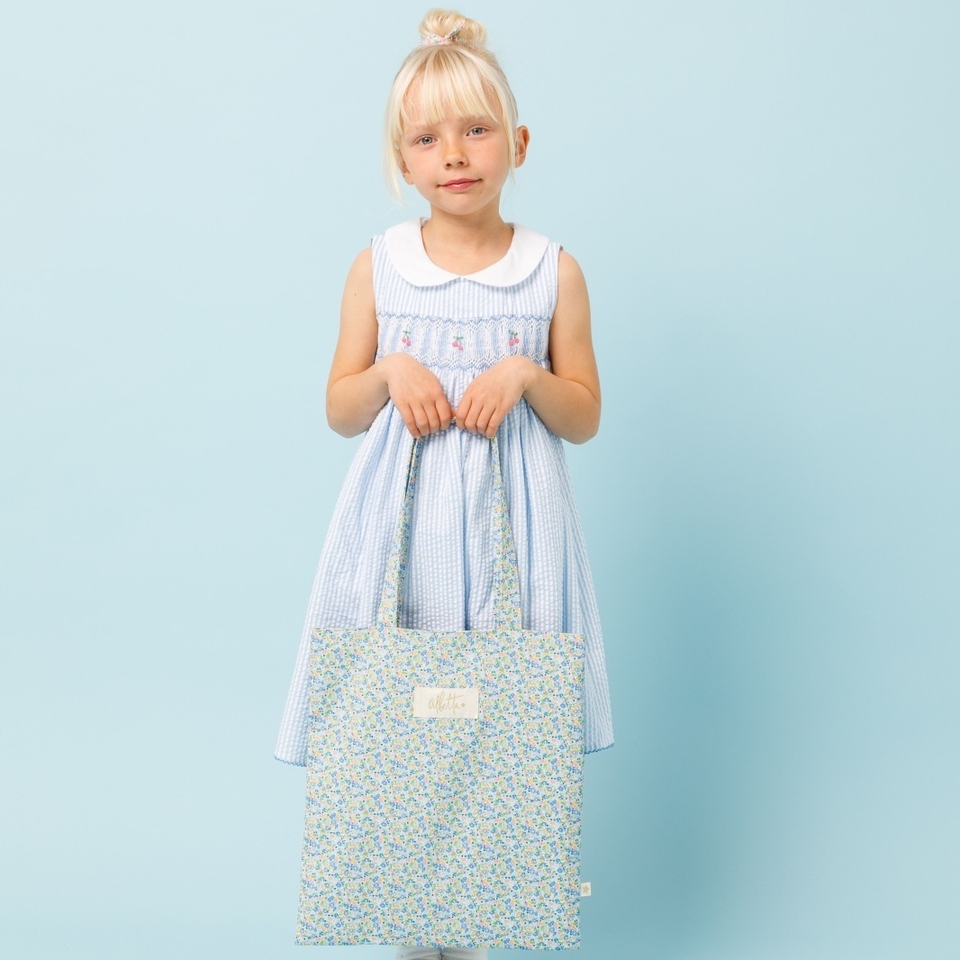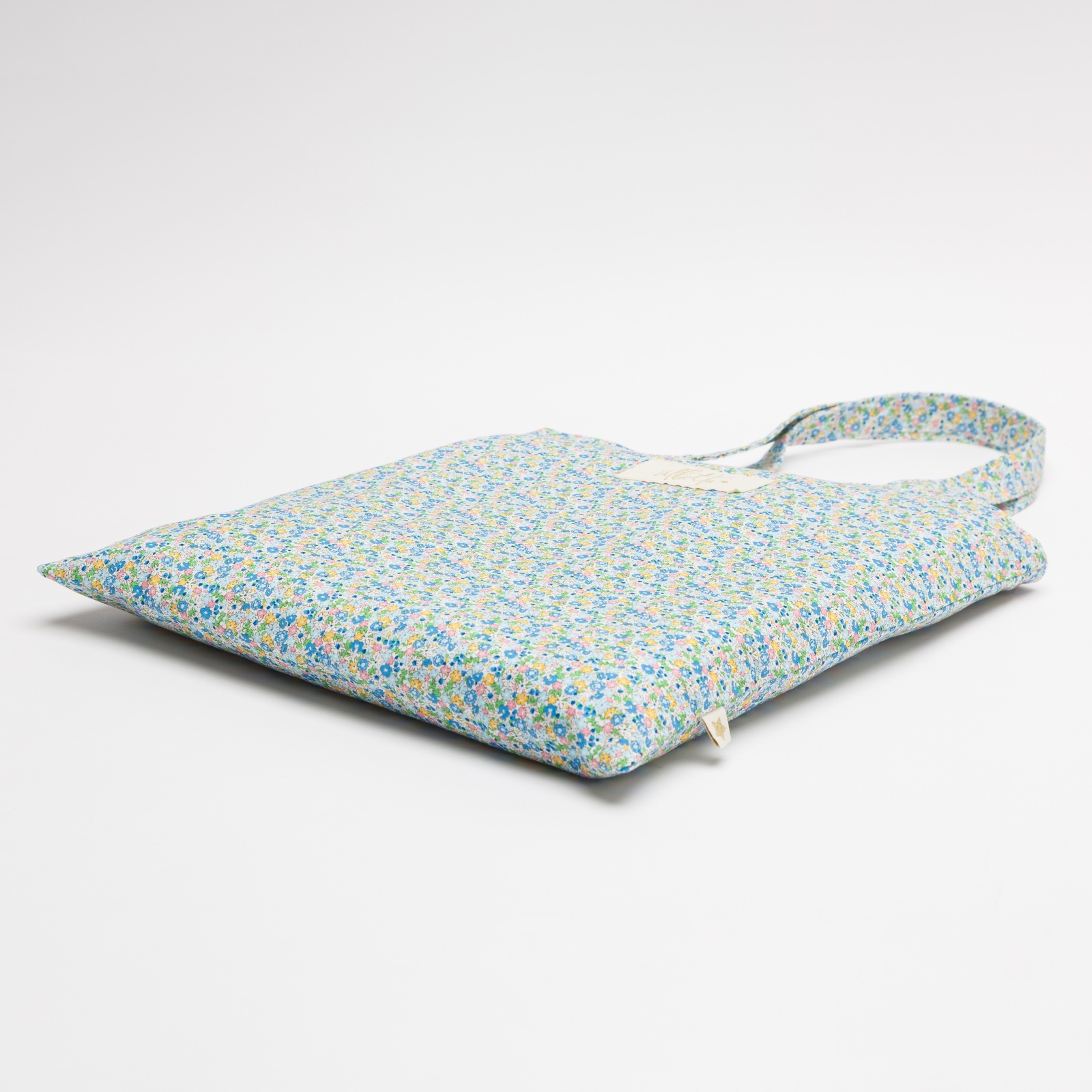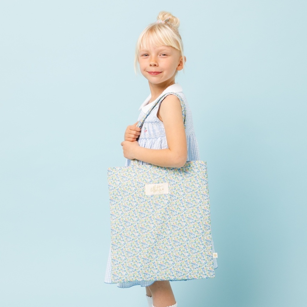 爽やかなブルーやイエローの小花が全体に散りばめられた、とっても愛らしいデザインのバッグです。