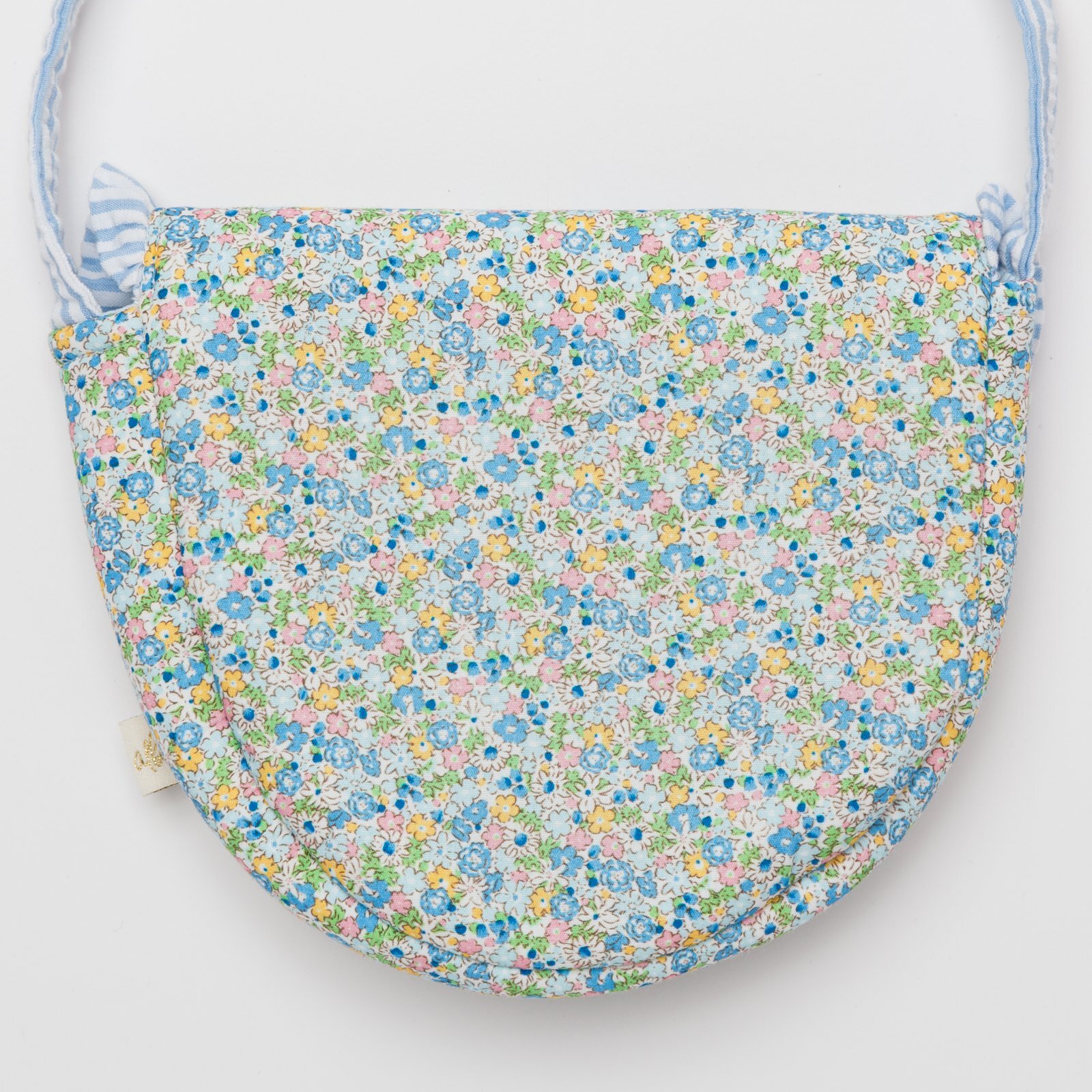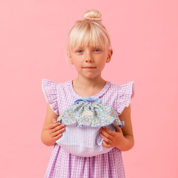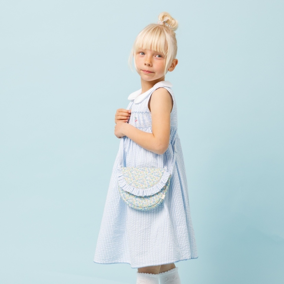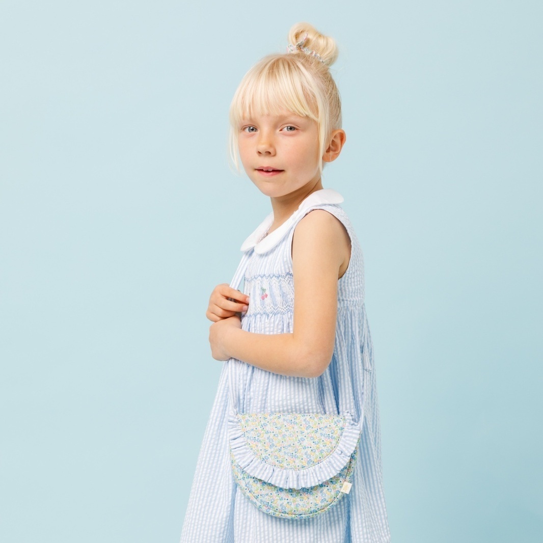 爽やかな水色のストライプフリルと、繊細な小花柄が可憐に組み合わさったポシェットです。丸みのある可愛らしい形で、お子様の大切な宝物やハンカチなどを入れて持ち歩くのにぴったりです。肩紐はマジックテープ仕様になっているので、万が一どこかに引っかかってもパッと外れる安心の設計です。