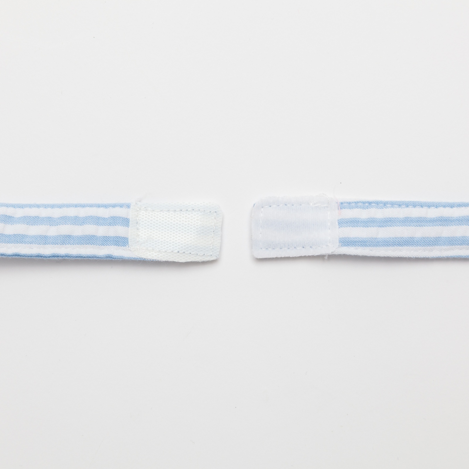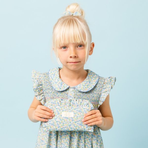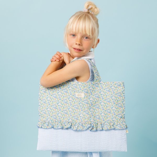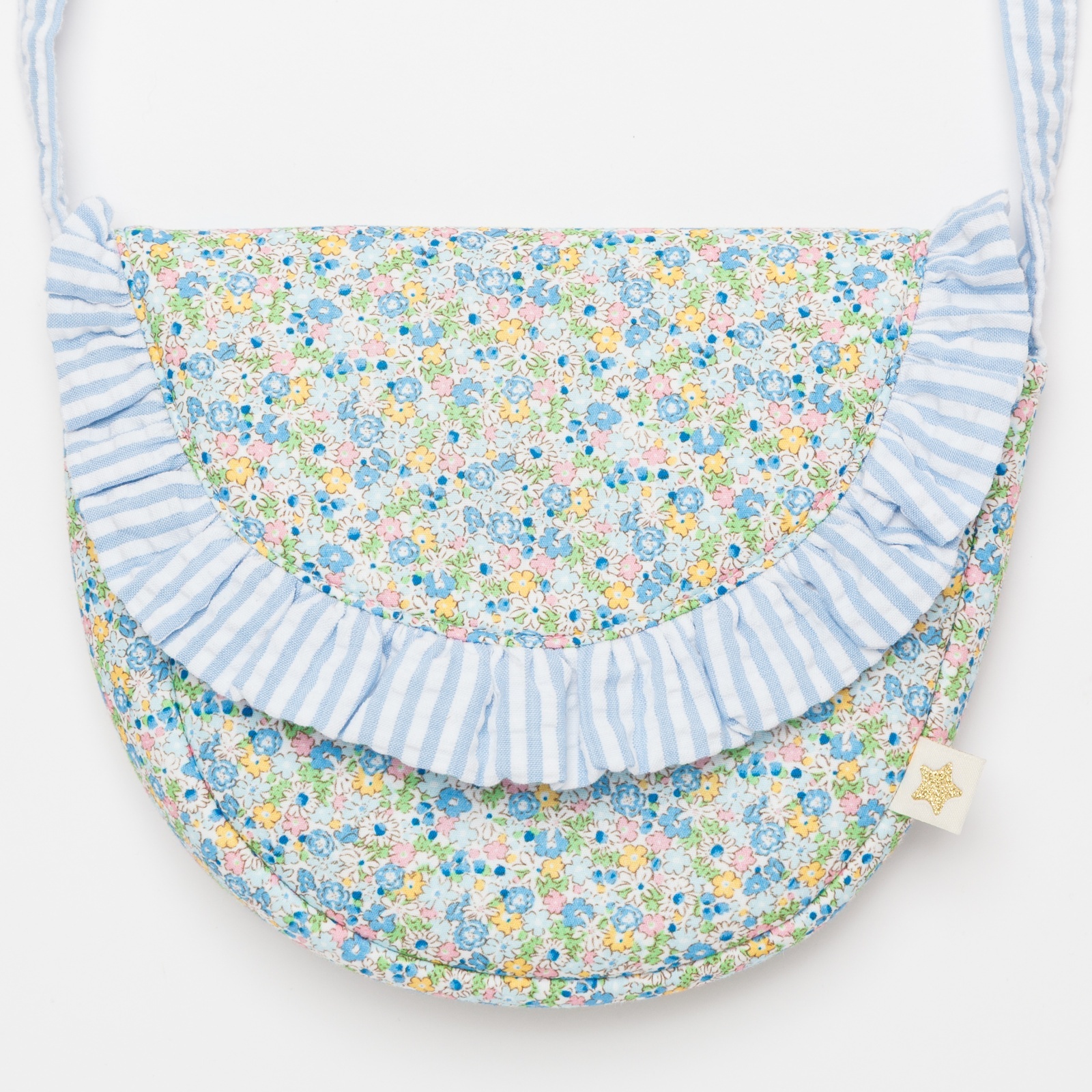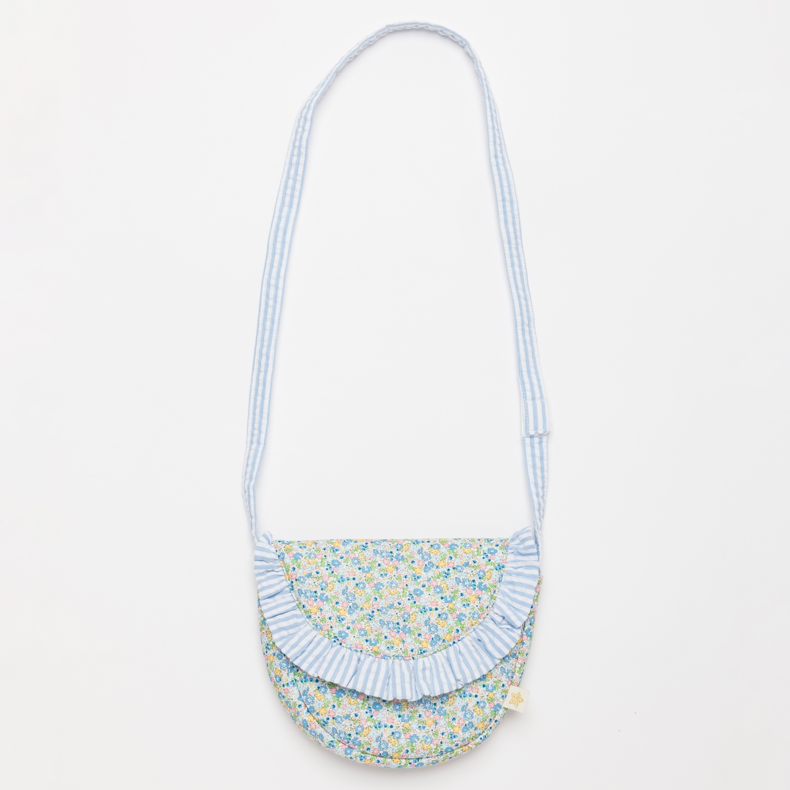 爽やかな水色のストライプフリルと、繊細な小花柄が可憐に組み合わさったポシェットです。丸みのある可愛らしい形で、お子様の大切な宝物やハンカチなどを入れて持ち歩くのにぴったりです。肩紐はマジックテープ仕様になっているので、万が一どこかに引っかかってもパッと外れる安心の設計です。