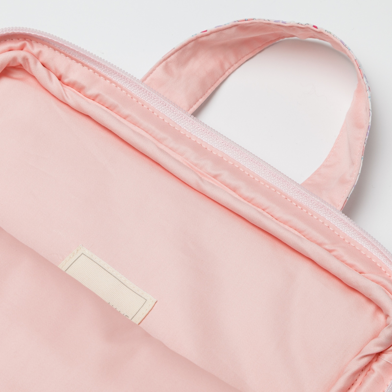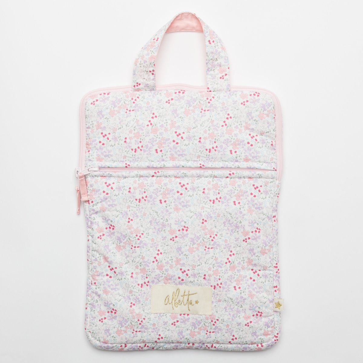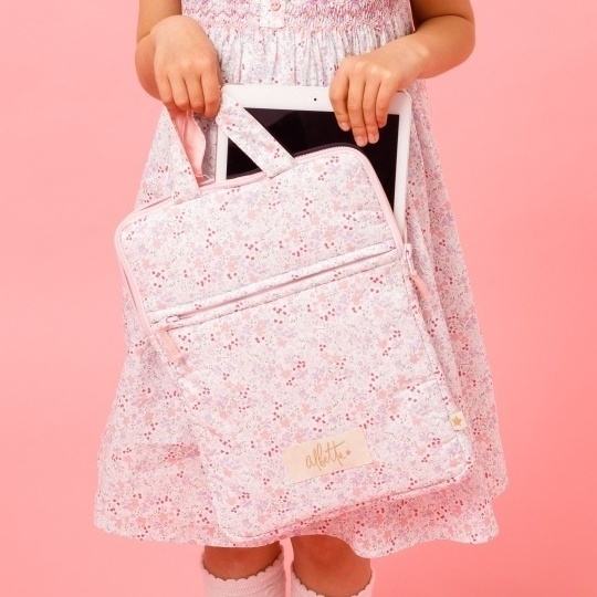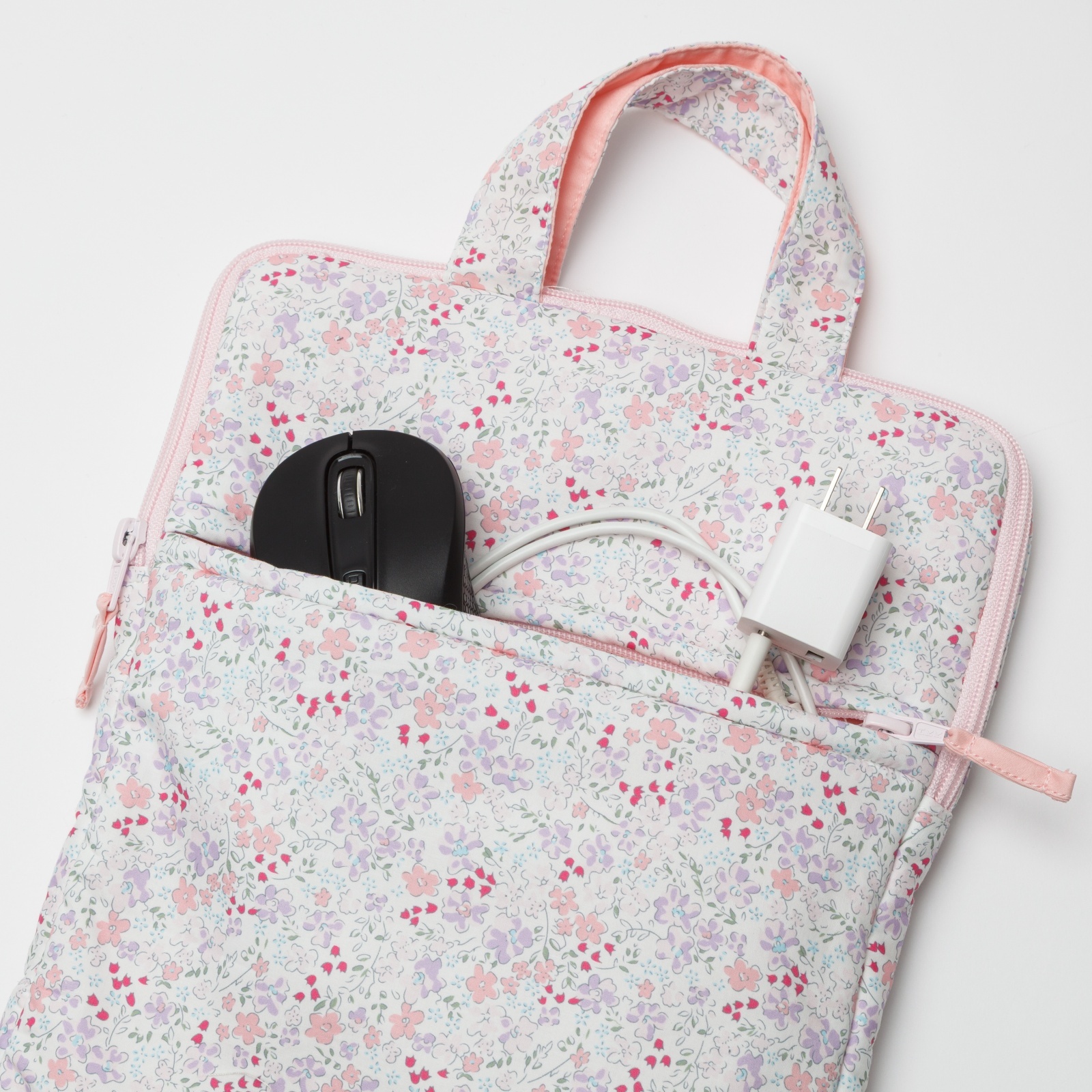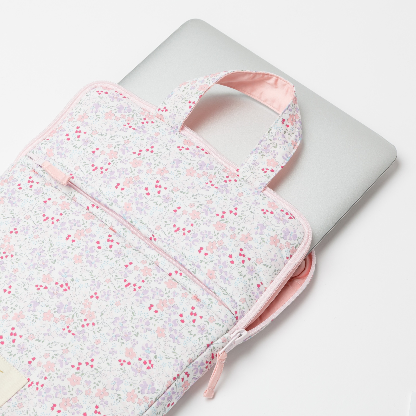 淡いピンクやパープルの小花柄が全体に広がる、とっても上品で華やかなパソコンケースです。