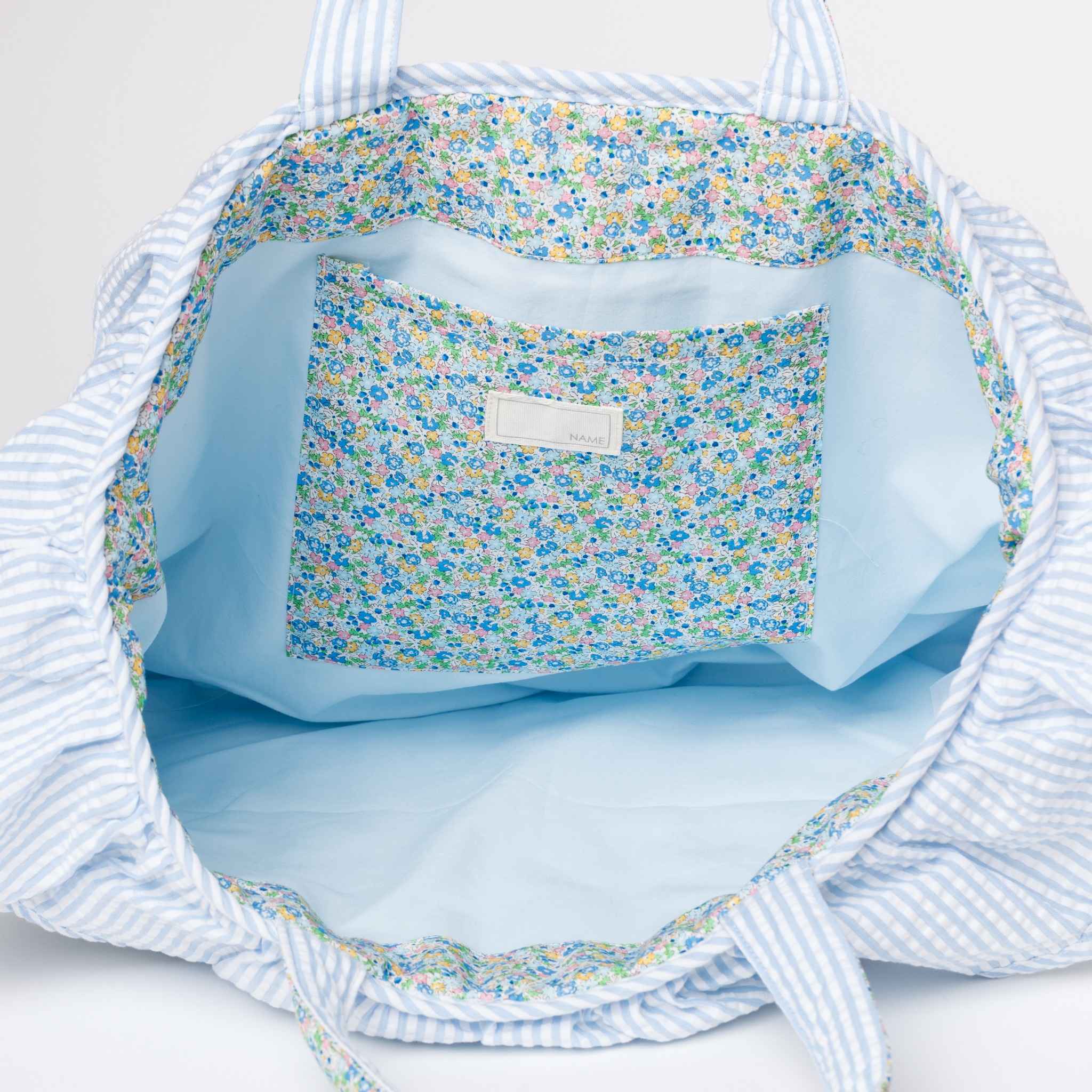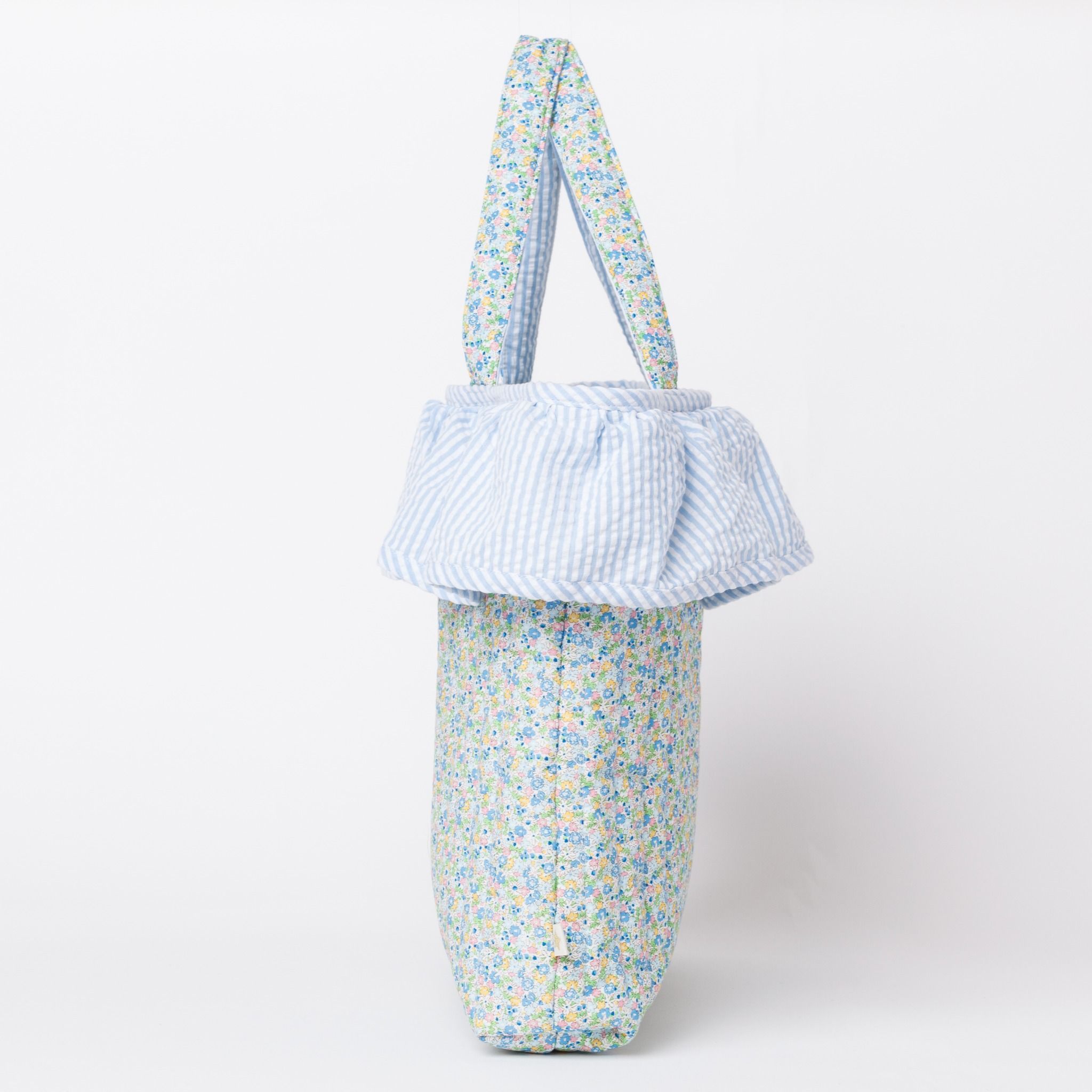 やさしい花柄のノラプリントに、ふんわりとしたフリルデザインが目を引くキルトバッグ。軽くて持ちやすく、日常使いはもちろんお出かけやサブバッグとしても活躍します。内側には便利なポケット付きで、小物の整理もすっきり。可愛さと実用性を兼ね備えた一品です。