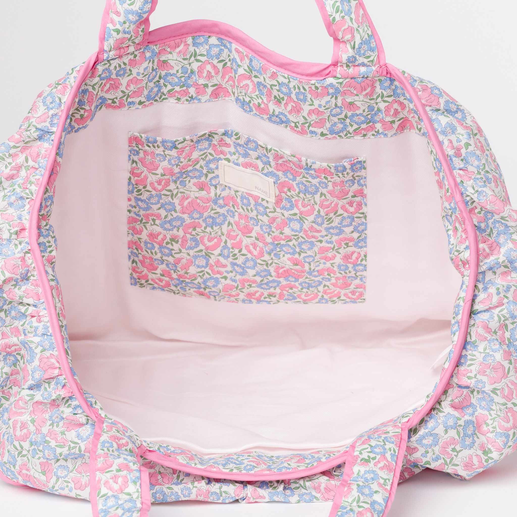 可憐なブルーベルフローラル柄に、やさしいピンクのフリルが映えるキルトバッグ。ふんわりとした軽い使い心地で、デイリー使いからお出かけまで幅広く活躍します。広めのマチで収納力があり、内ポケット付きで小物整理も便利。華やかさと実用性を兼ね備えた一品です。