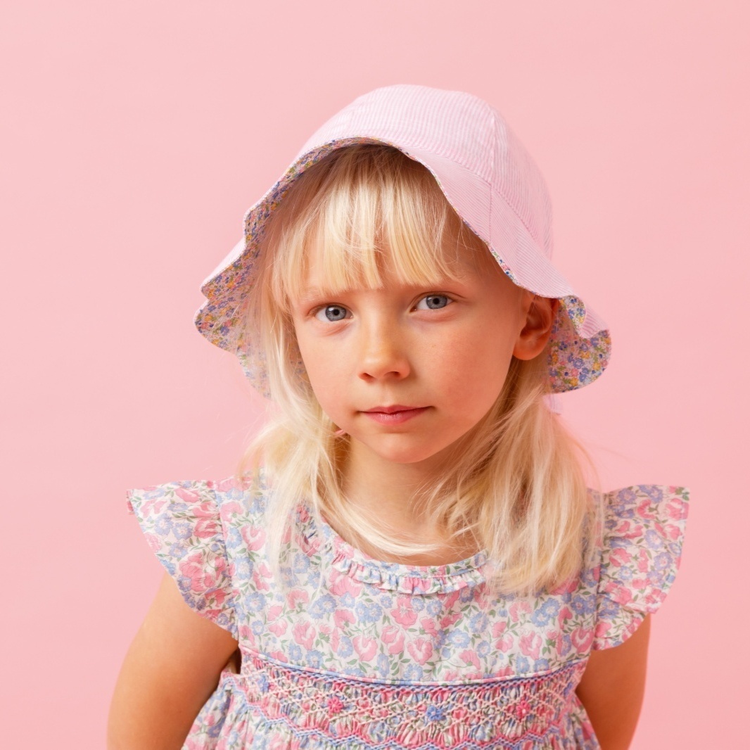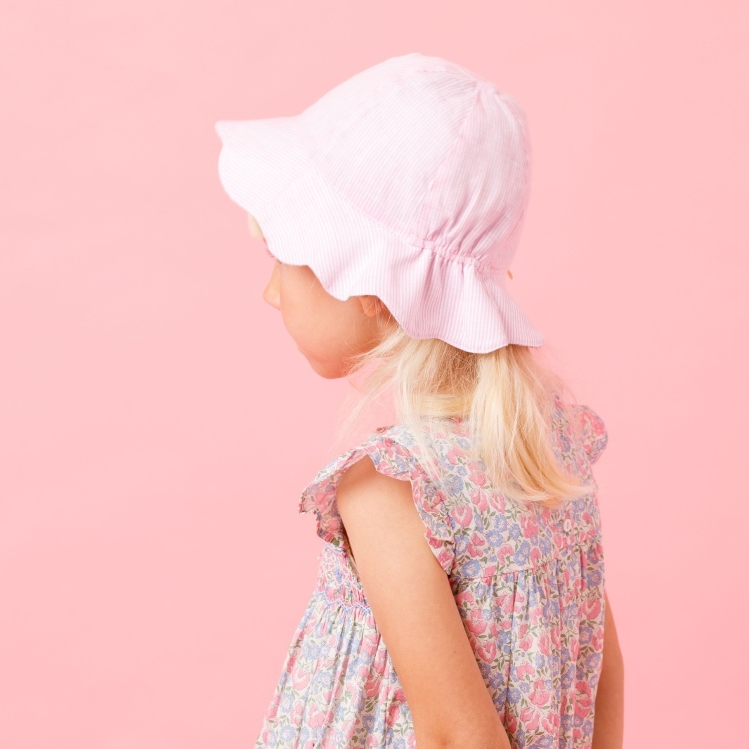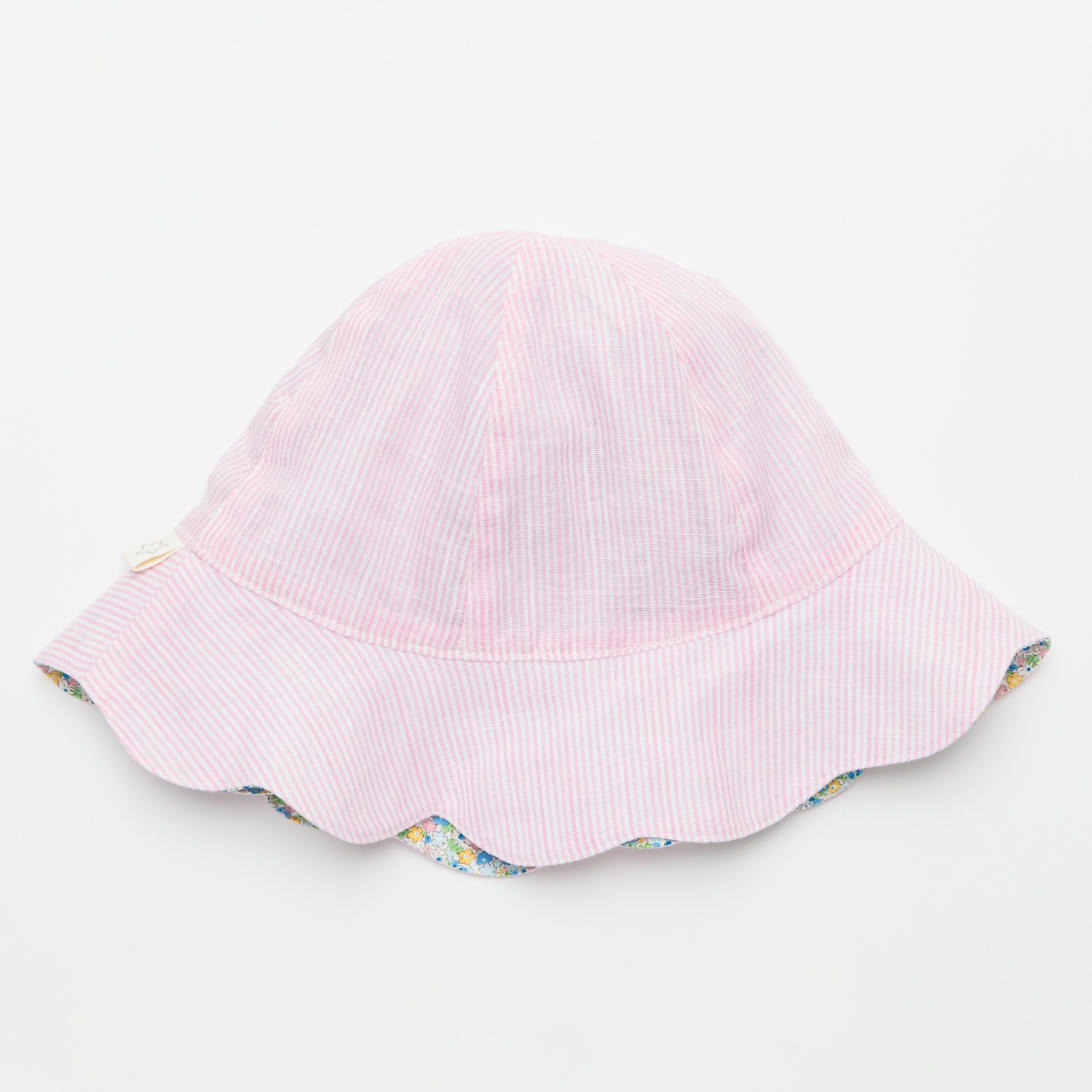 華やかな小花柄と爽やかなピンクストライプのリバーシブル仕様で、その日の気分やコーディネートに合わせて2つの可愛い表情が楽しめるハットです。お花のような「なみなみ」のスカラップ形状のつばが、お子さまのお顔周りをパッと明るく引き立てながら、デリケートな肌を日差しからやさしく守ります。軽くて柔らかな素材なので、長時間かぶっても疲れにくく、使わない時はくるっと丸めてコンパクトにバッグへ収納できる、ママにも嬉しい使い勝手抜群のアイテムです。