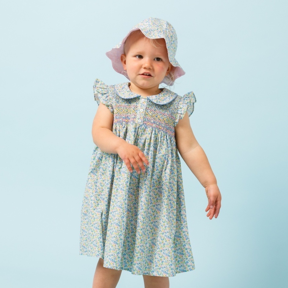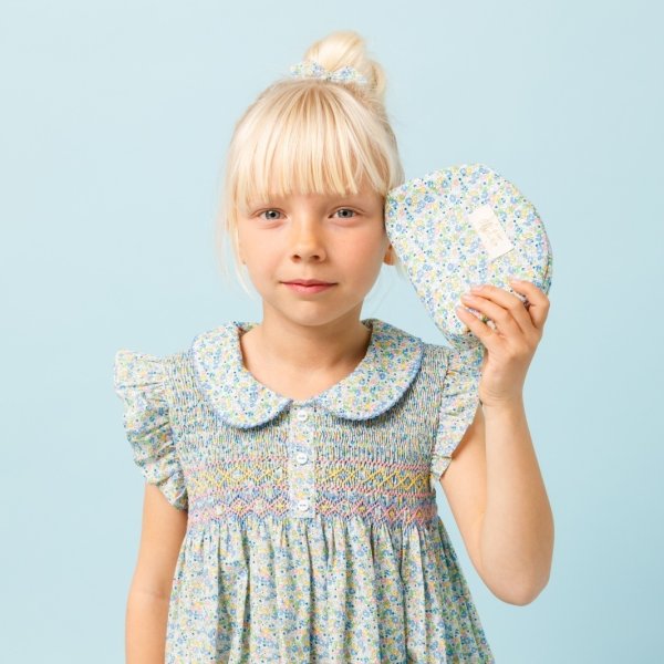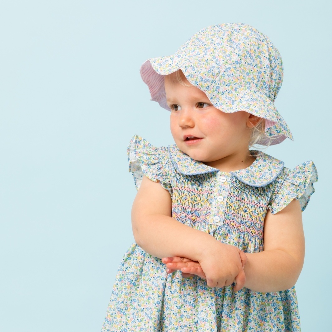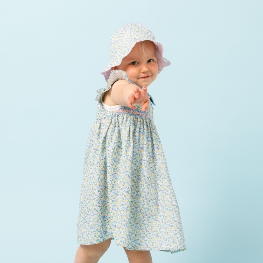 華やかな小花柄と爽やかなピンクストライプのリバーシブル仕様で、その日の気分やコーディネートに合わせて2つの可愛い表情が楽しめるハットです。お花のような「なみなみ」のスカラップ形状のつばが、お子さまのお顔周りをパッと明るく引き立てながら、デリケートな肌を日差しからやさしく守ります。軽くて柔らかな素材なので、長時間かぶっても疲れにくく、使わない時はくるっと丸めてコンパクトにバッグへ収納できる、ママにも嬉しい使い勝手抜群のアイテムです。