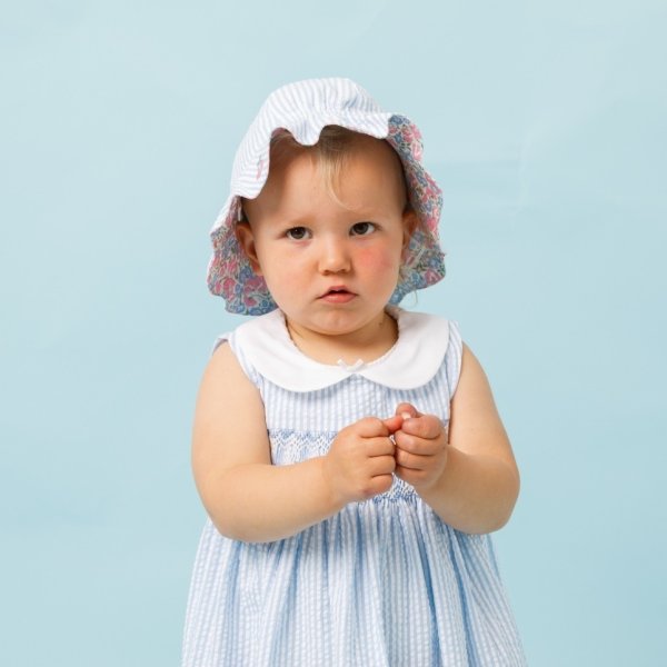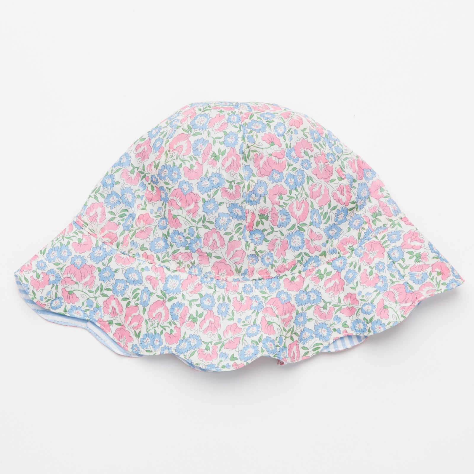 華やかな小花柄と爽やかなブルーのストライプ柄を気分に合わせて使い分けられるリバーシブル仕様で、1つあればお出かけのコーディネートがぐっと広がるハットです。お花のような「なみなみ」のスカラップ形状のつばが、お子さまのお顔周りをパッと明るく引き立てながら、夏の日差しからデリケートな肌をやさしく守ります。軽くて柔らかな素材は長時間のお出かけでも疲れにくく、使わない時はくるっと丸めてコンパクトにバッグへ収納できる、ママにも嬉しい使い勝手抜群のアイテムです。