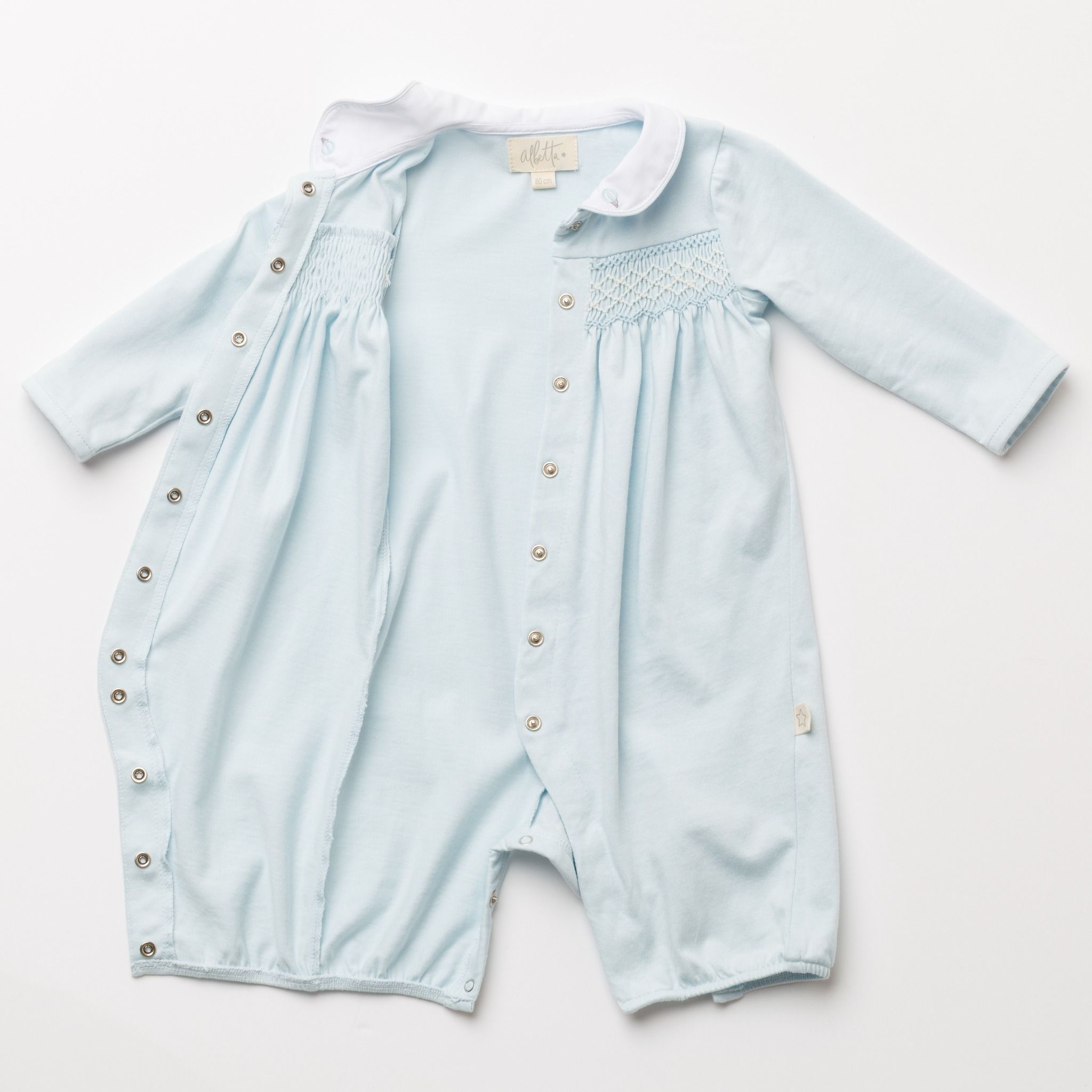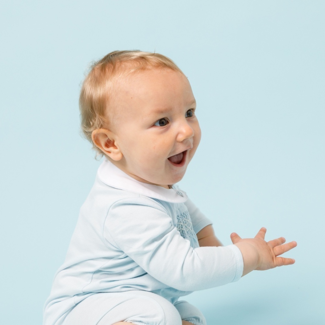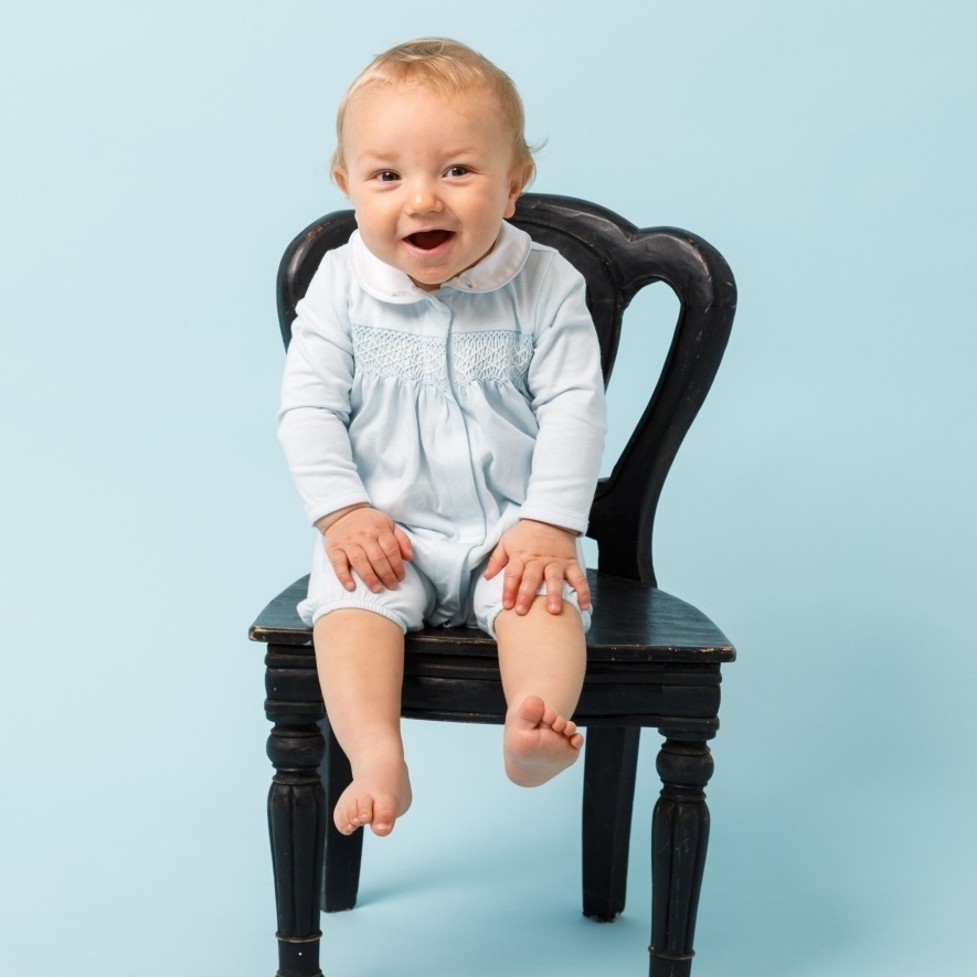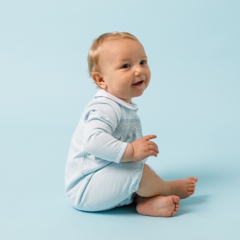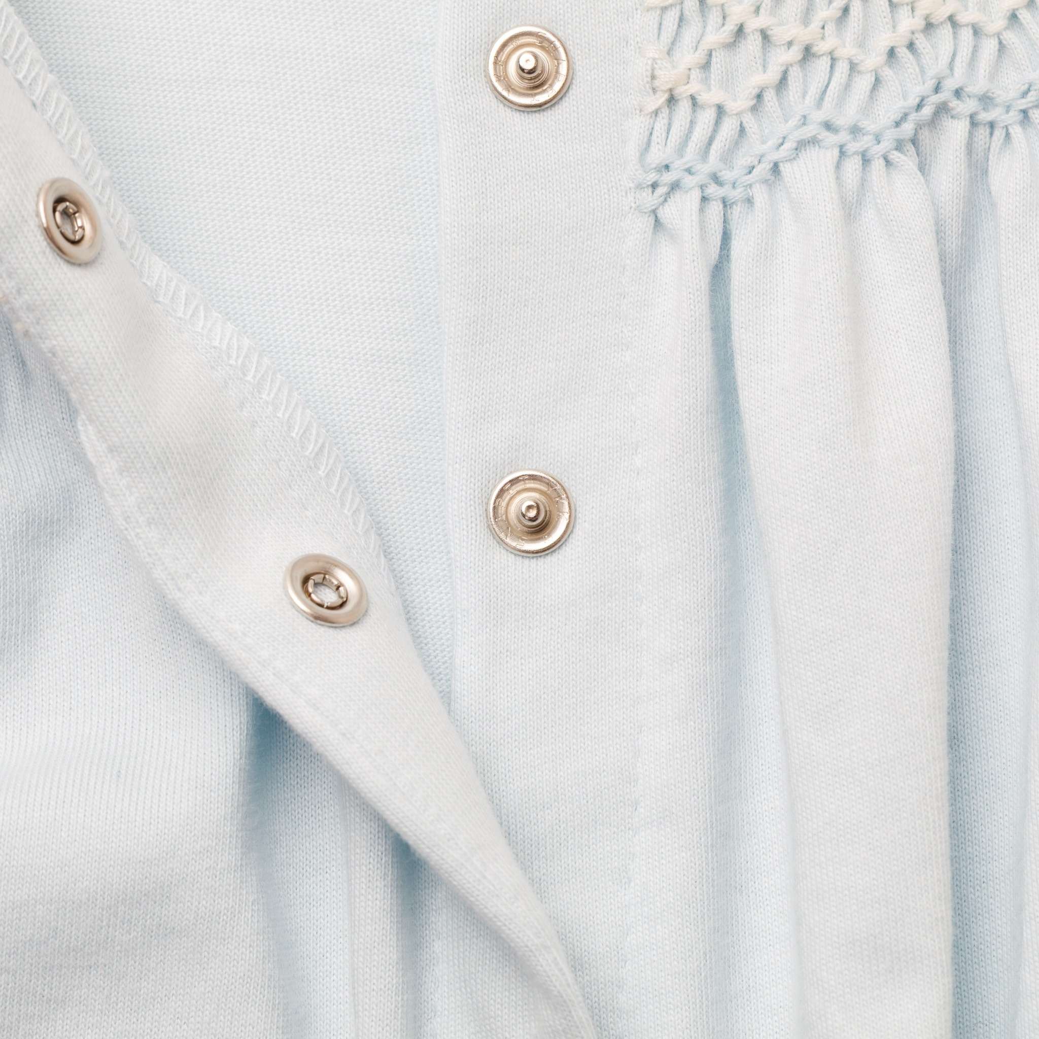 やさしいブルーカラーが印象的なジャージー素材のロンパース。胸元には手仕事によるハンドスモッキングを施し、繊細で上品な表情に仕上げました。柔らかく伸びのある生地で赤ちゃんの動きを妨げず、快適な着心地を実現。丸襟の刺繍が愛らしいアクセントとなり、日常からお出かけまで幅広く活躍する一着です。