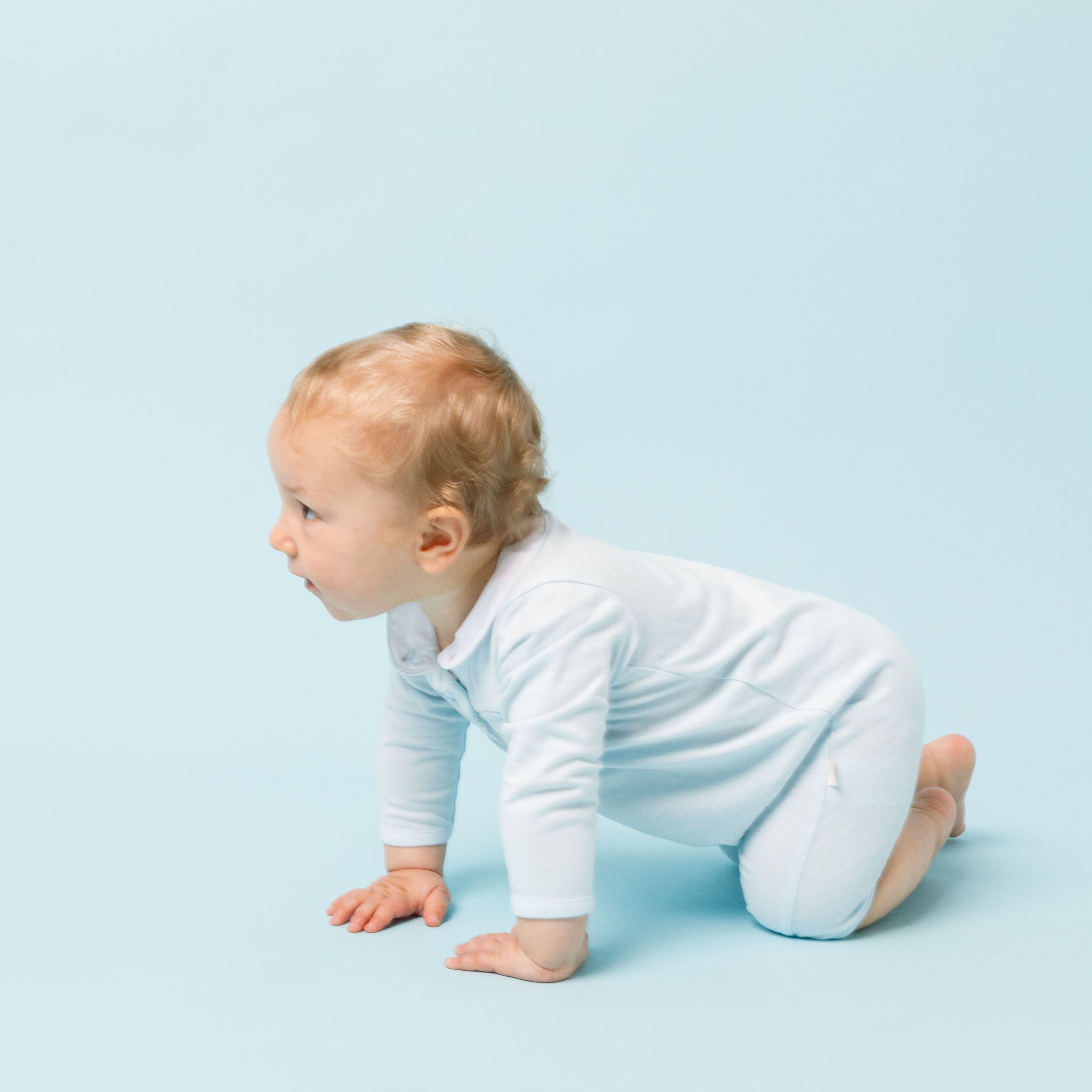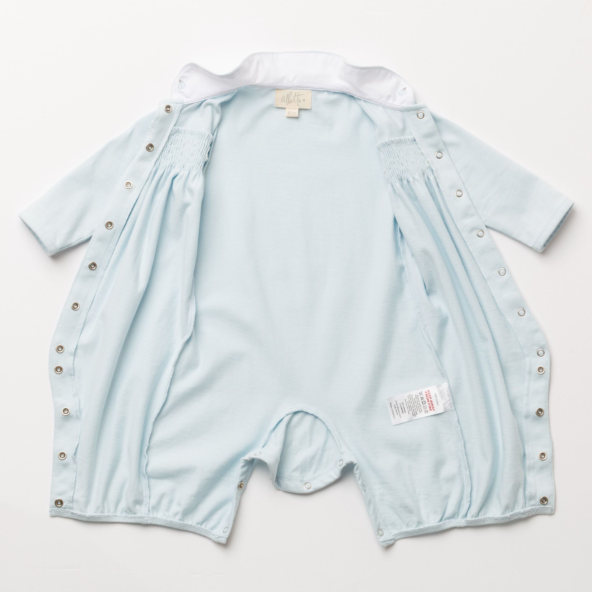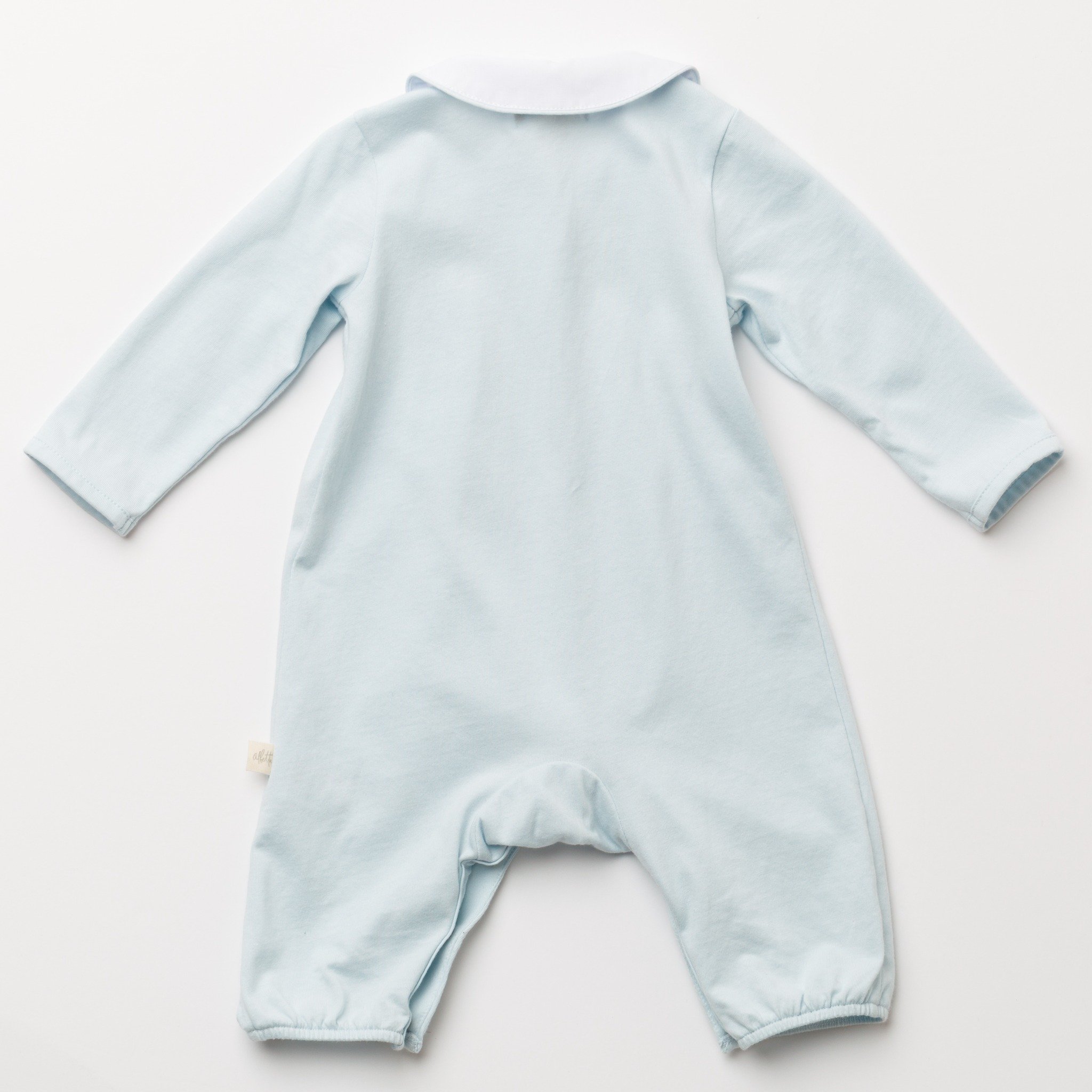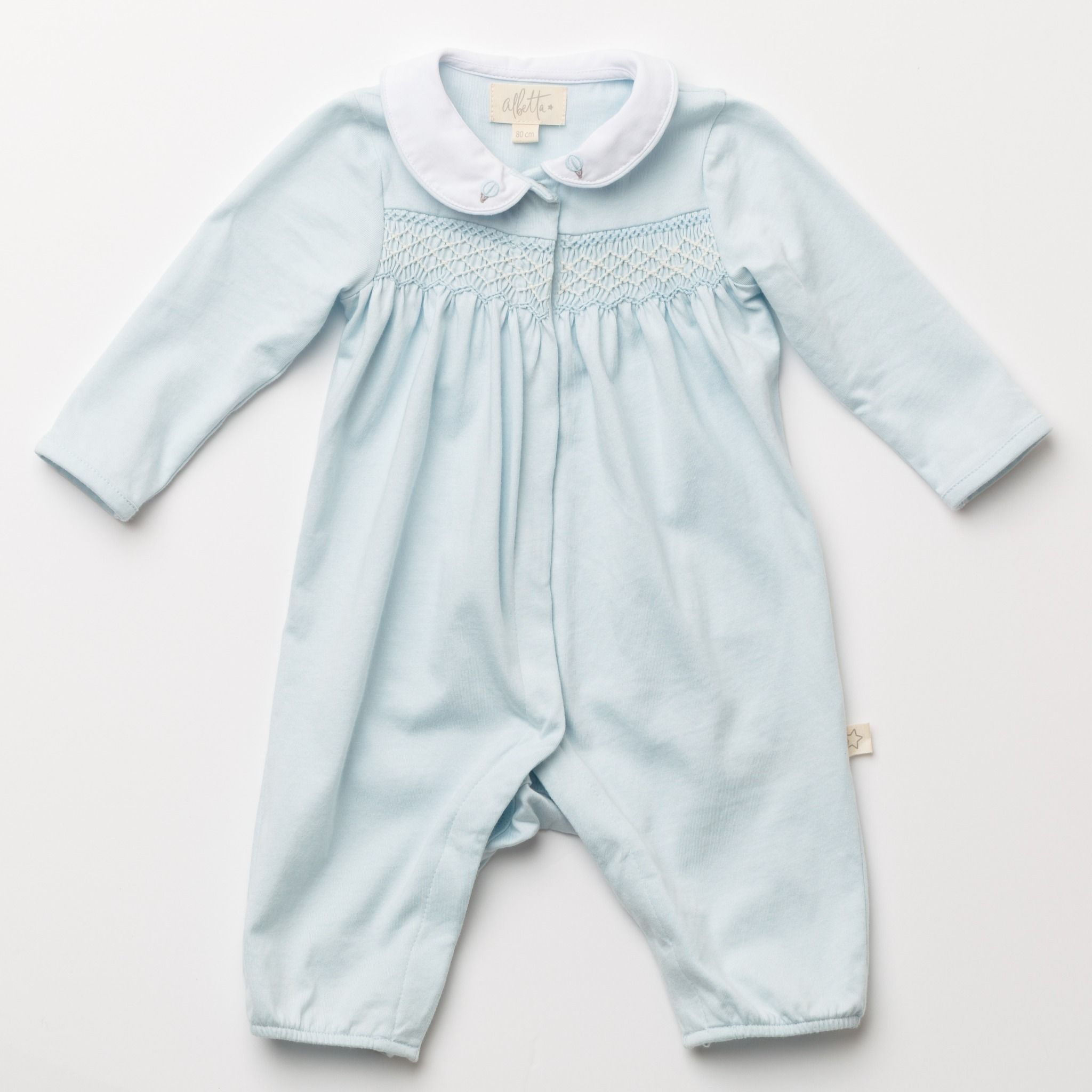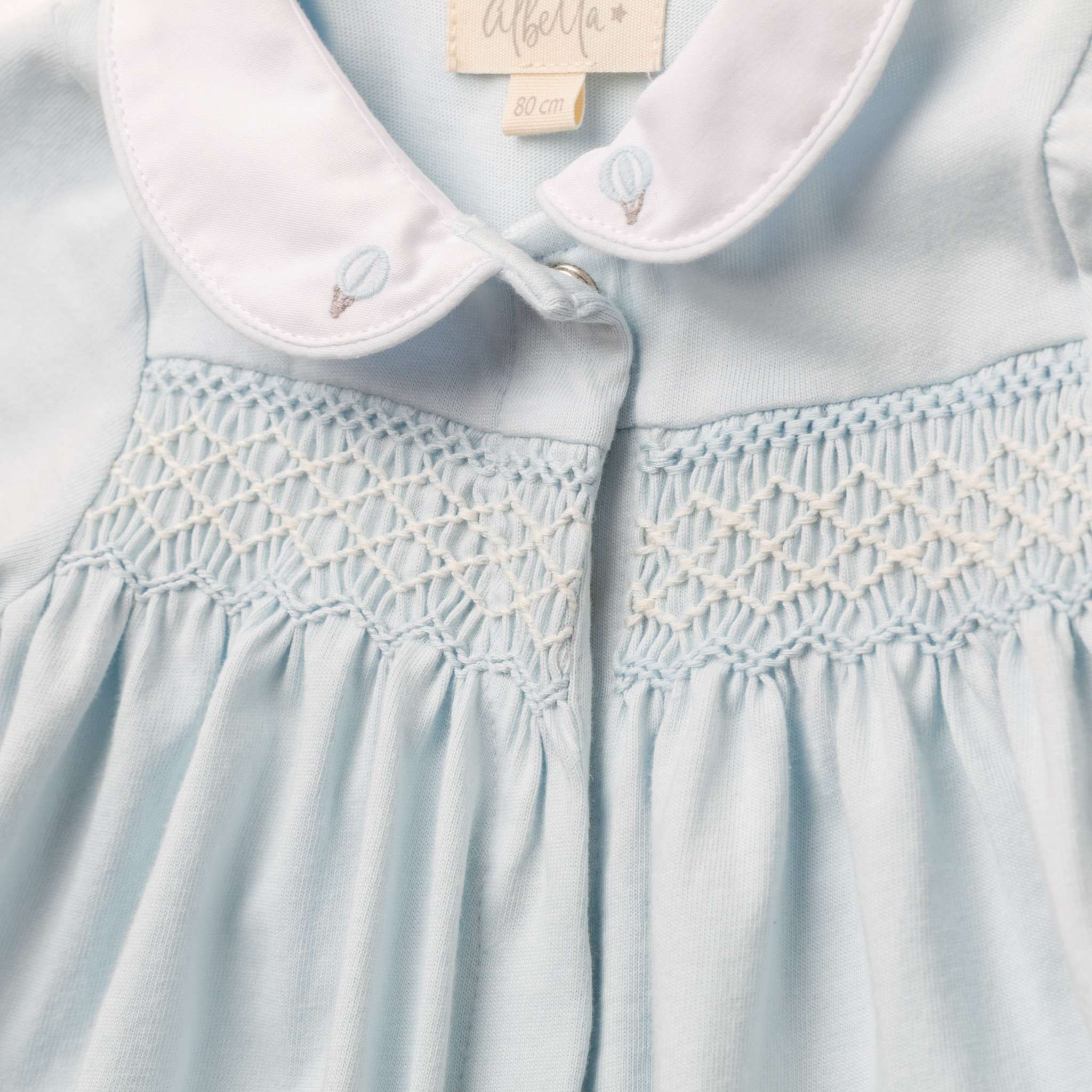 やさしいブルーカラーが印象的なジャージー素材のロンパース。胸元には手仕事によるハンドスモッキングを施し、繊細で上品な表情に仕上げました。柔らかく伸びのある生地で赤ちゃんの動きを妨げず、快適な着心地を実現。丸襟の刺繍が愛らしいアクセントとなり、日常からお出かけまで幅広く活躍する一着です。