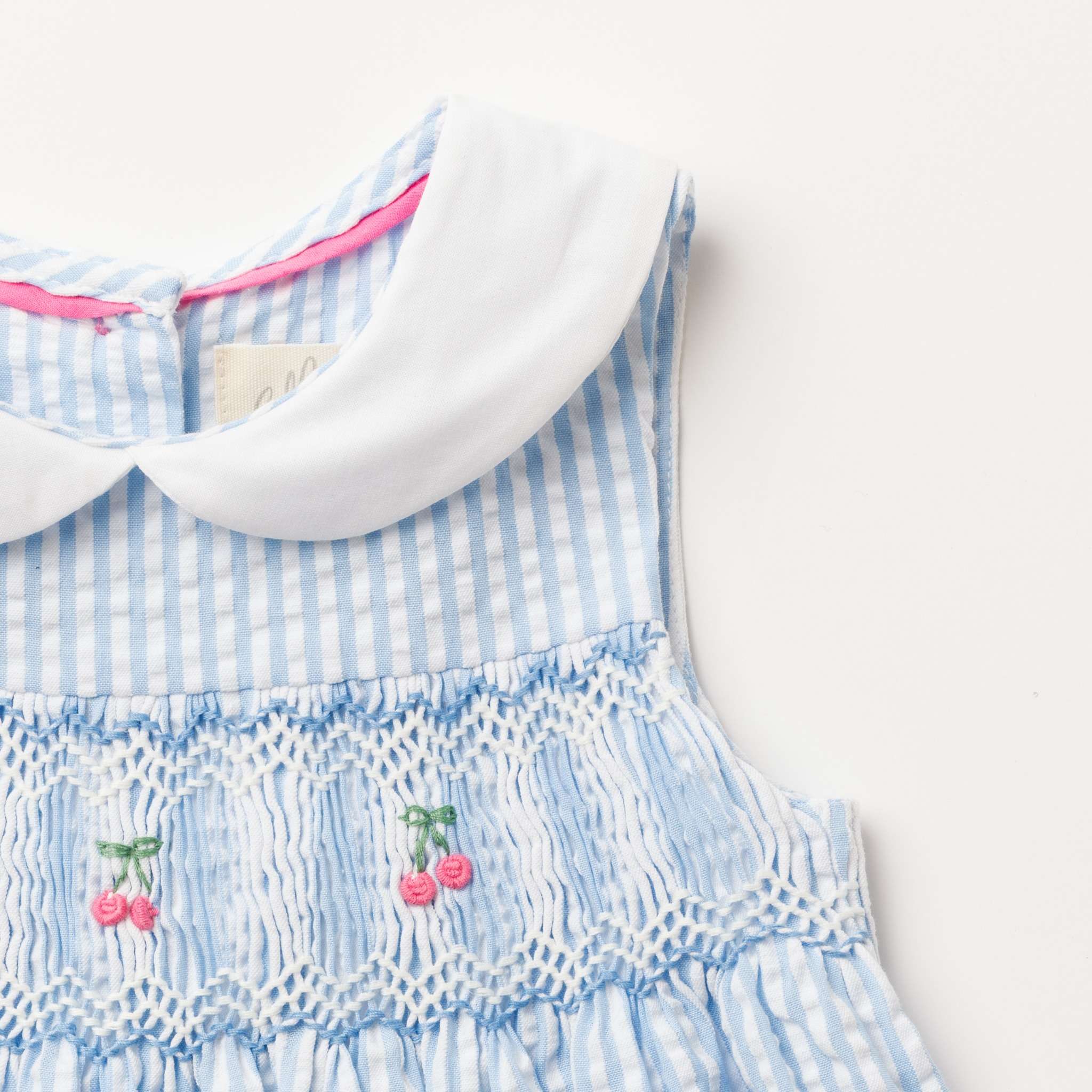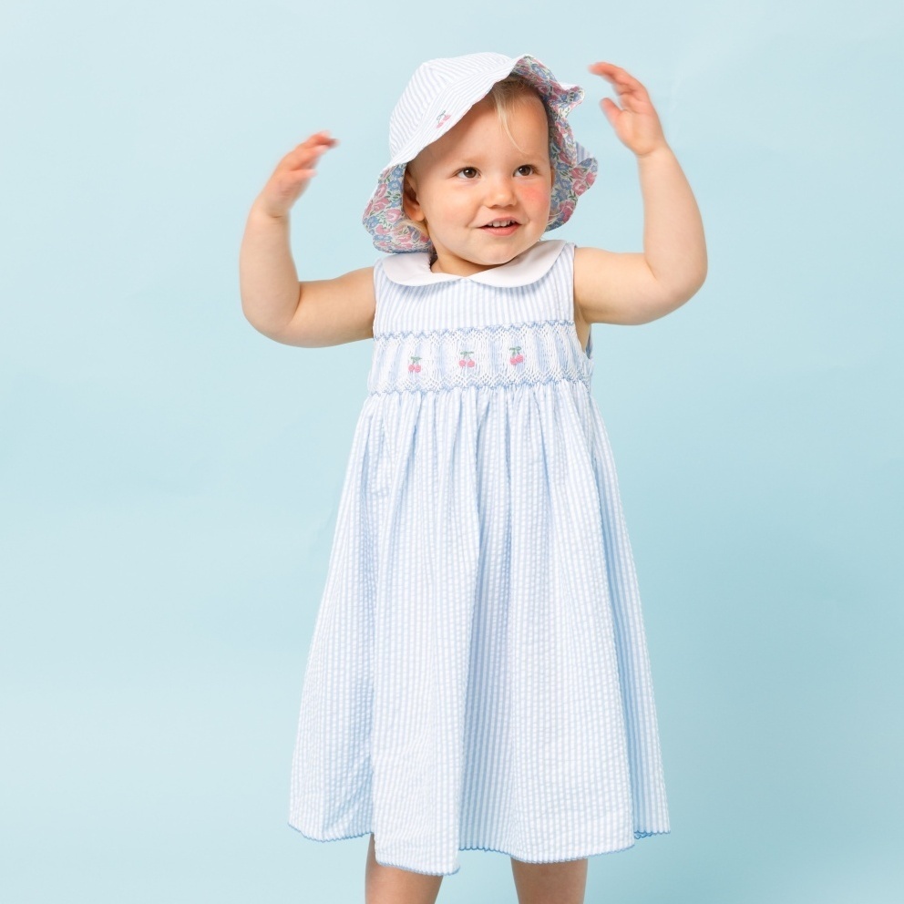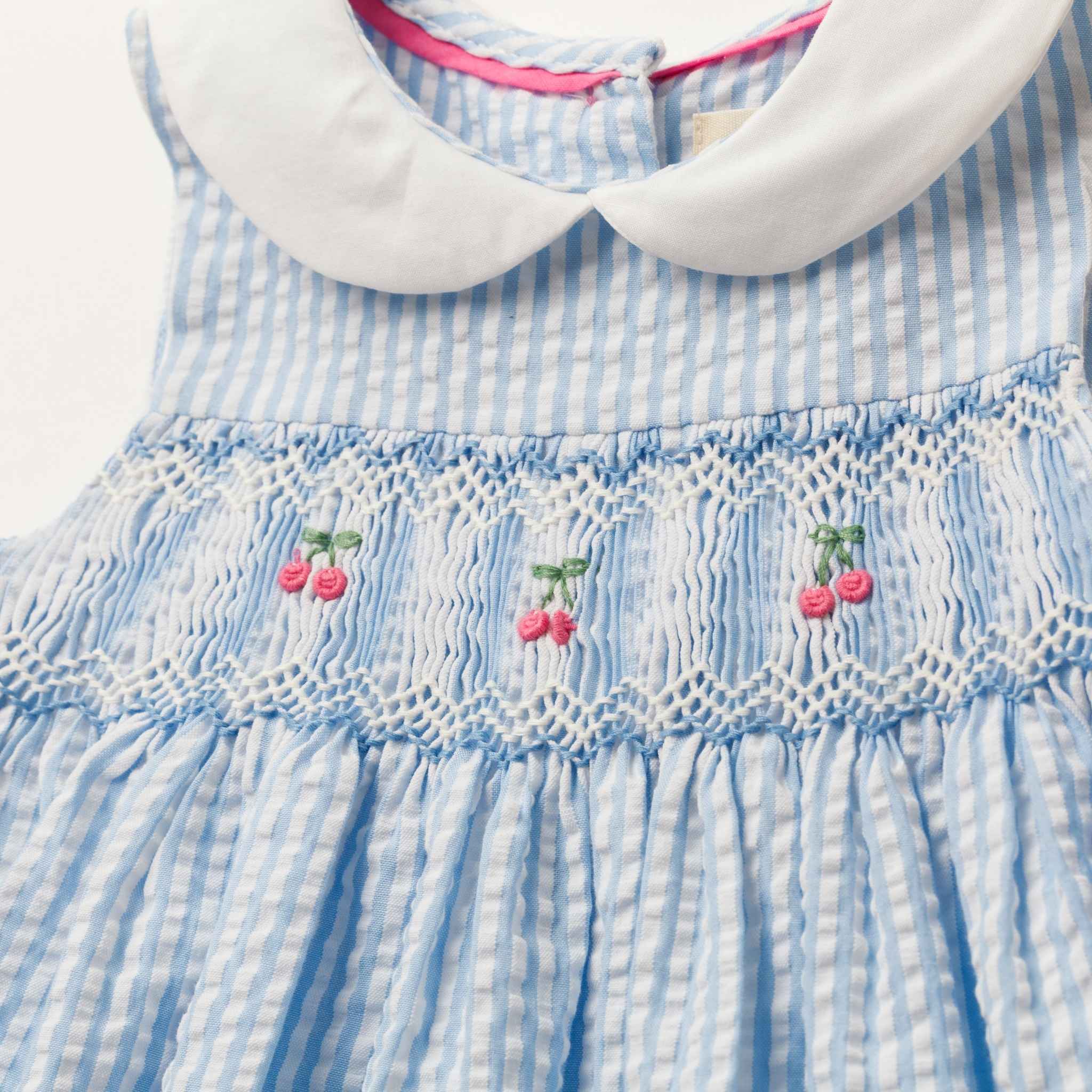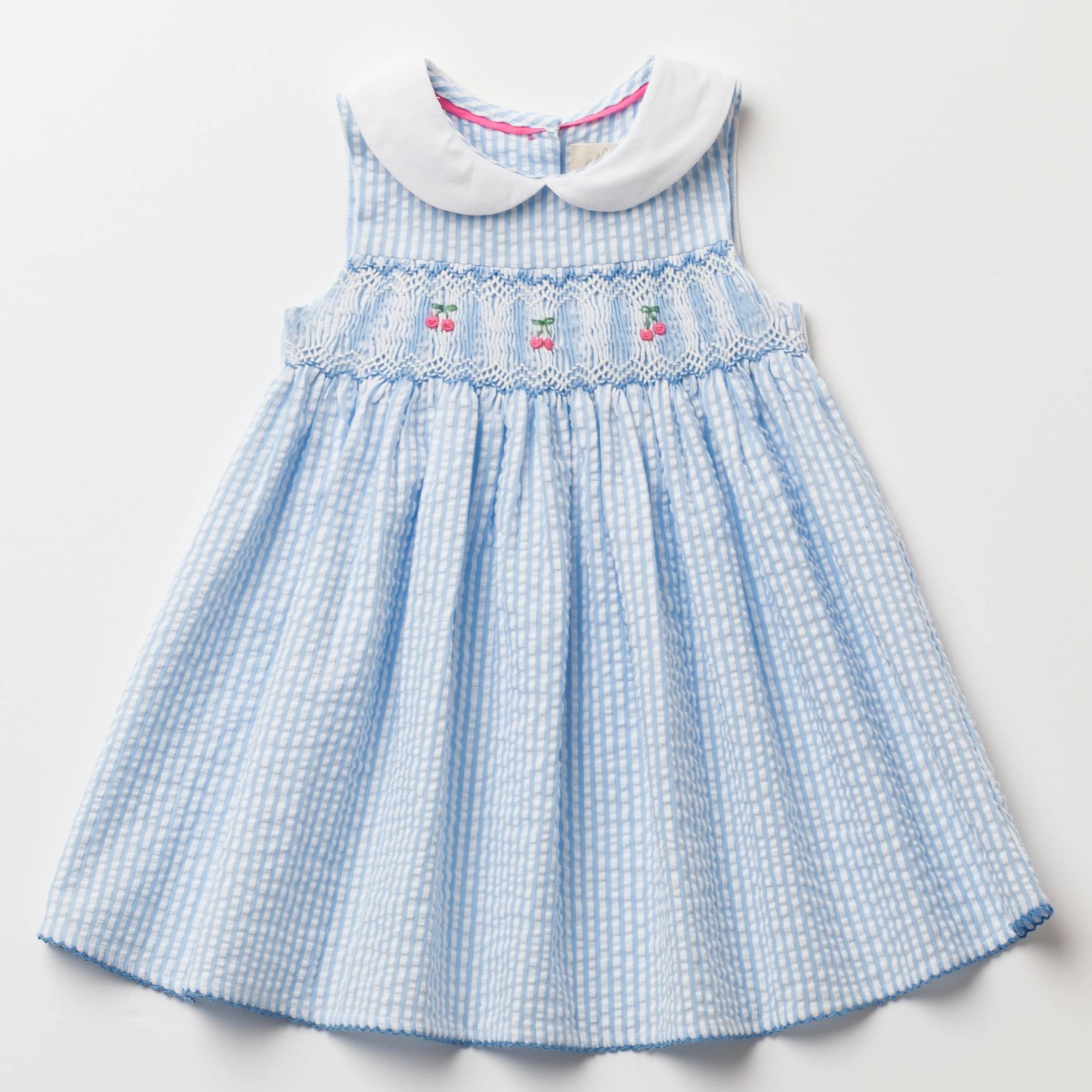 チェリー刺繍・ブルーシアサッカー・ハンドスモッキング・ワンピース_1〜2歳(85-92cm) [CDE1583059 1-2y]