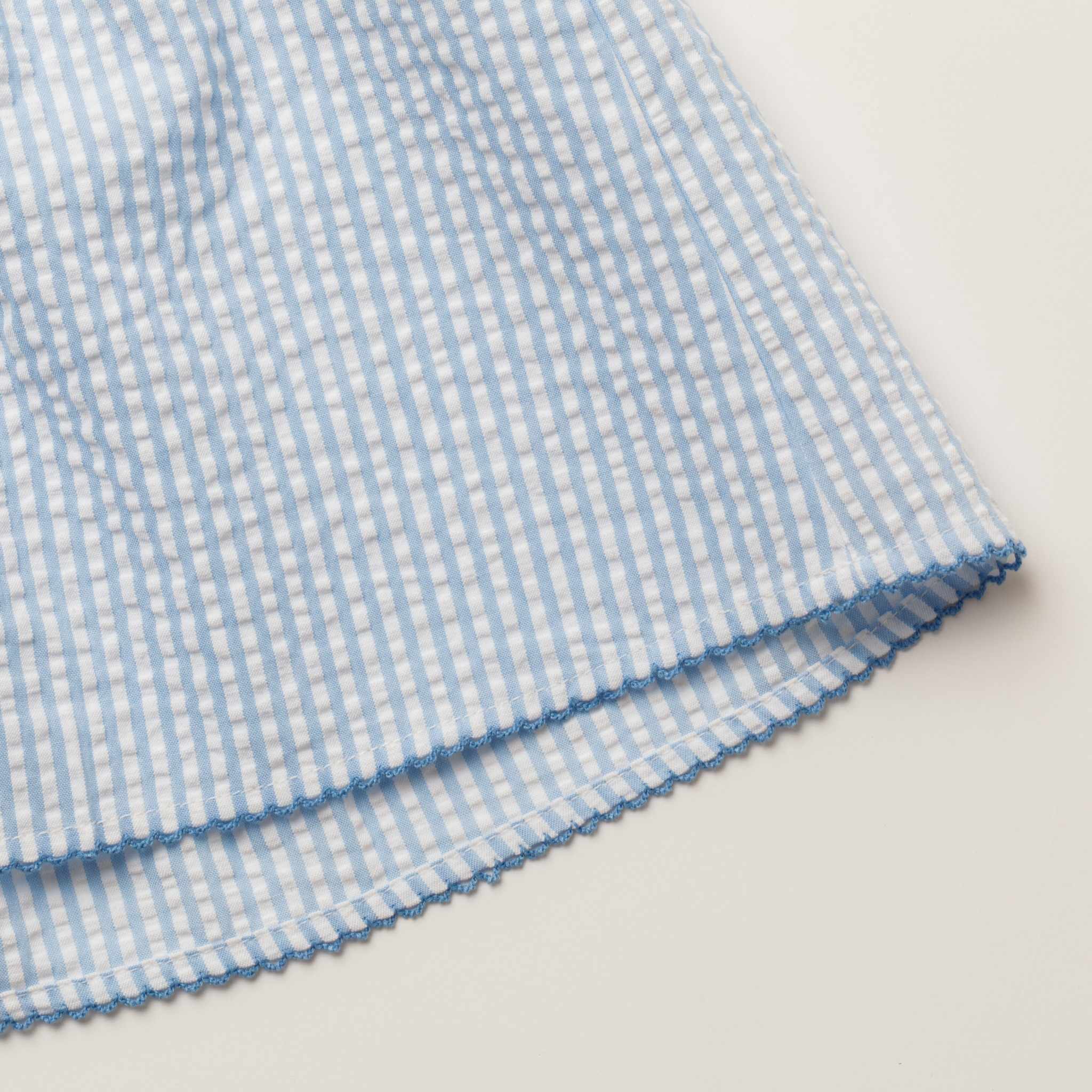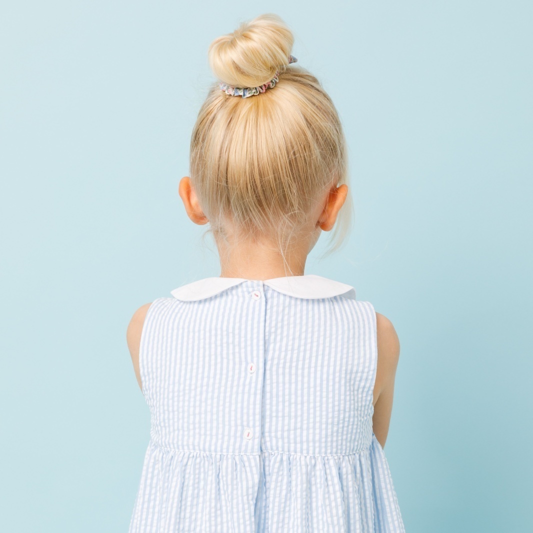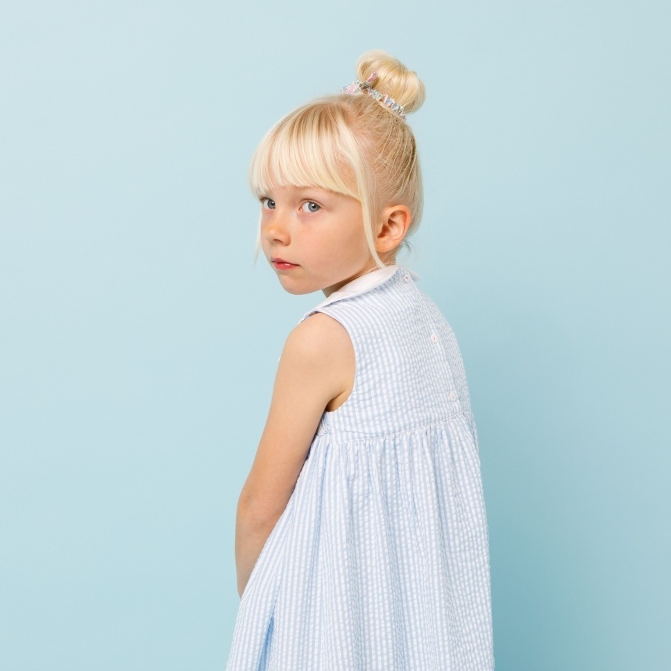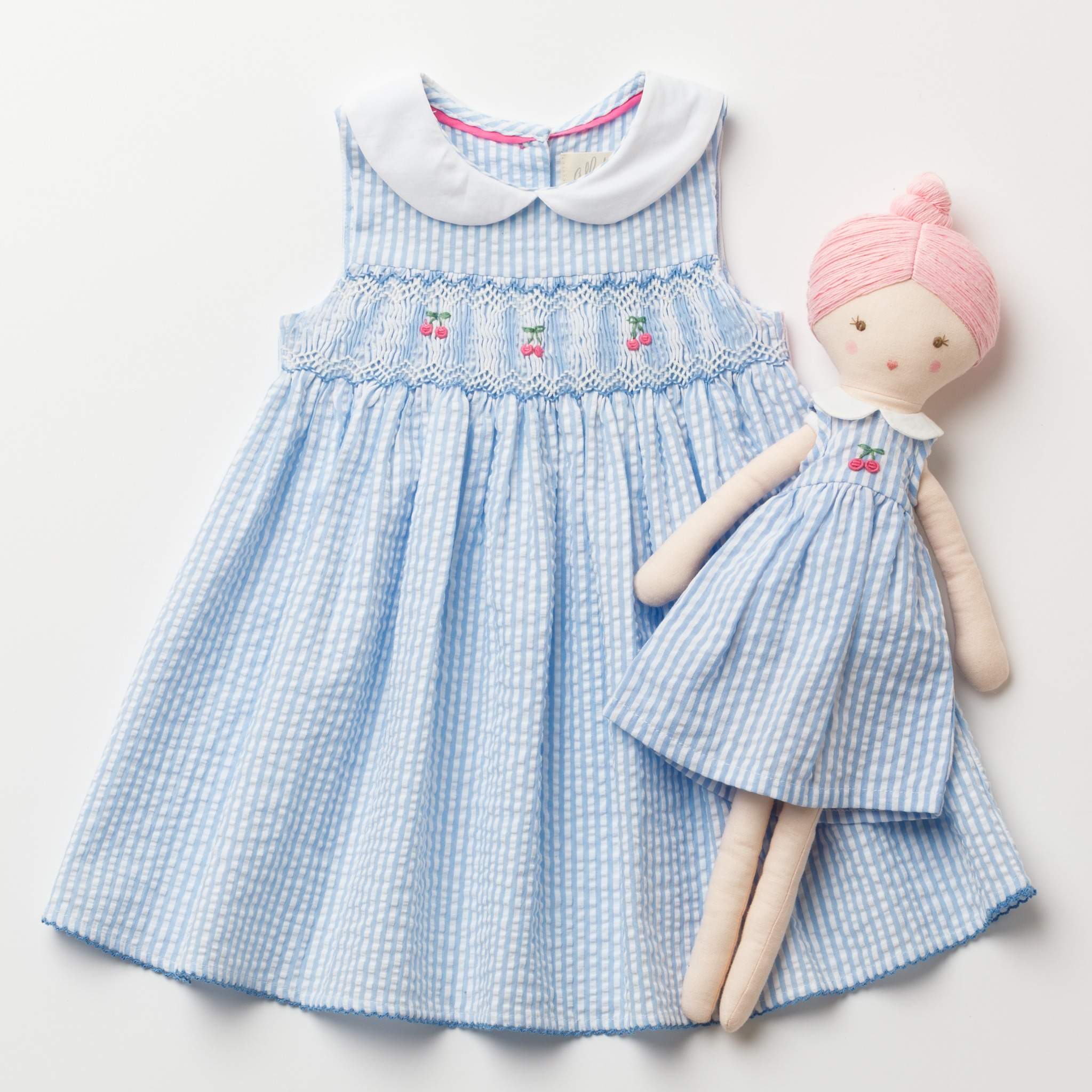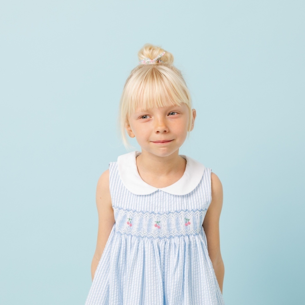 爽やかなブルーストライプに、丁寧に施されたハンドスモッキング刺繍が映えるワンピースです。立体感のある刺繍とやわらかなコットン素材が心地よく、上品で可憐な印象に仕上げています。白い丸襟が清潔感を引き立て、日常のお出かけから特別なシーンまで幅広く活躍。お揃いのドールドレスとのコーディネートも楽しめる一着です。