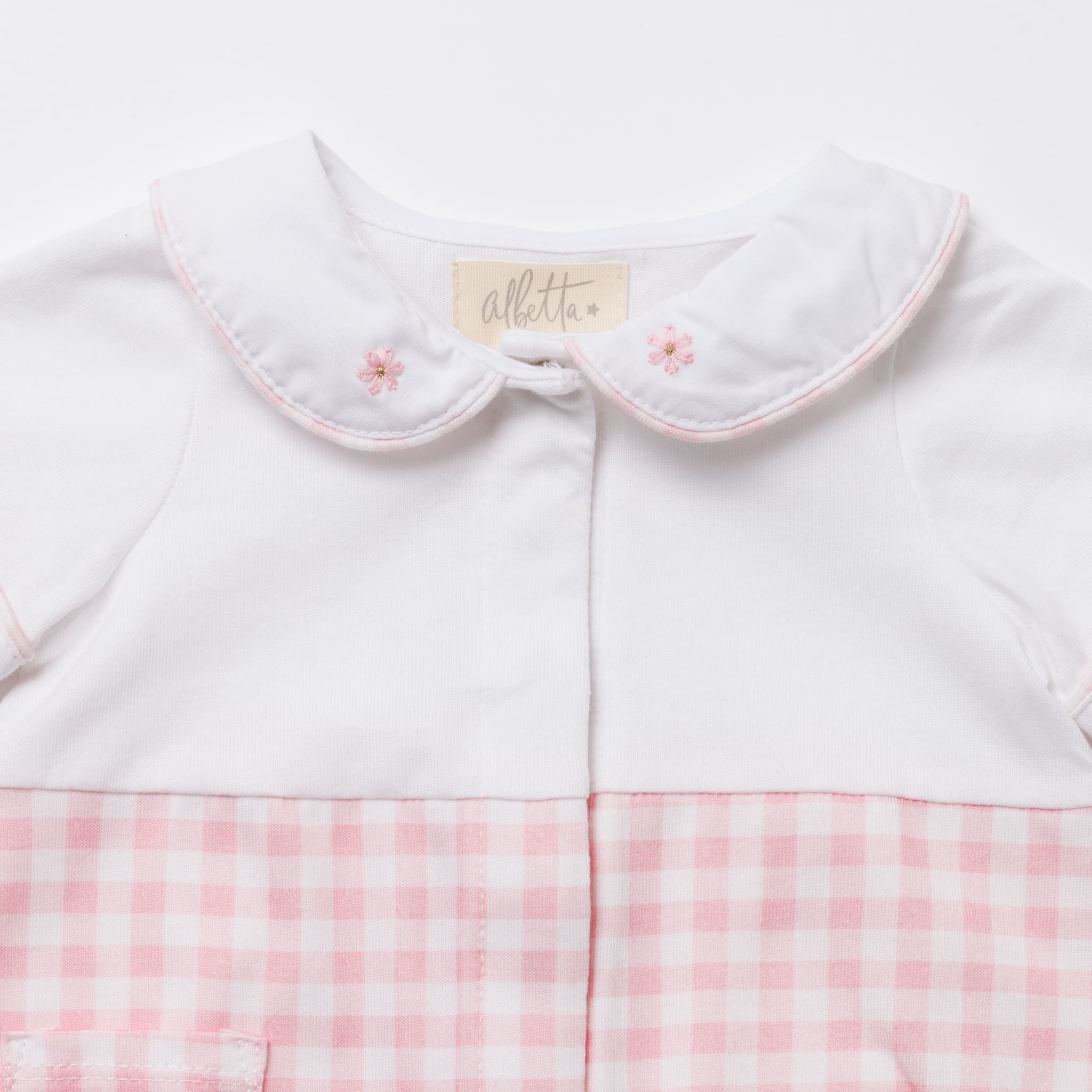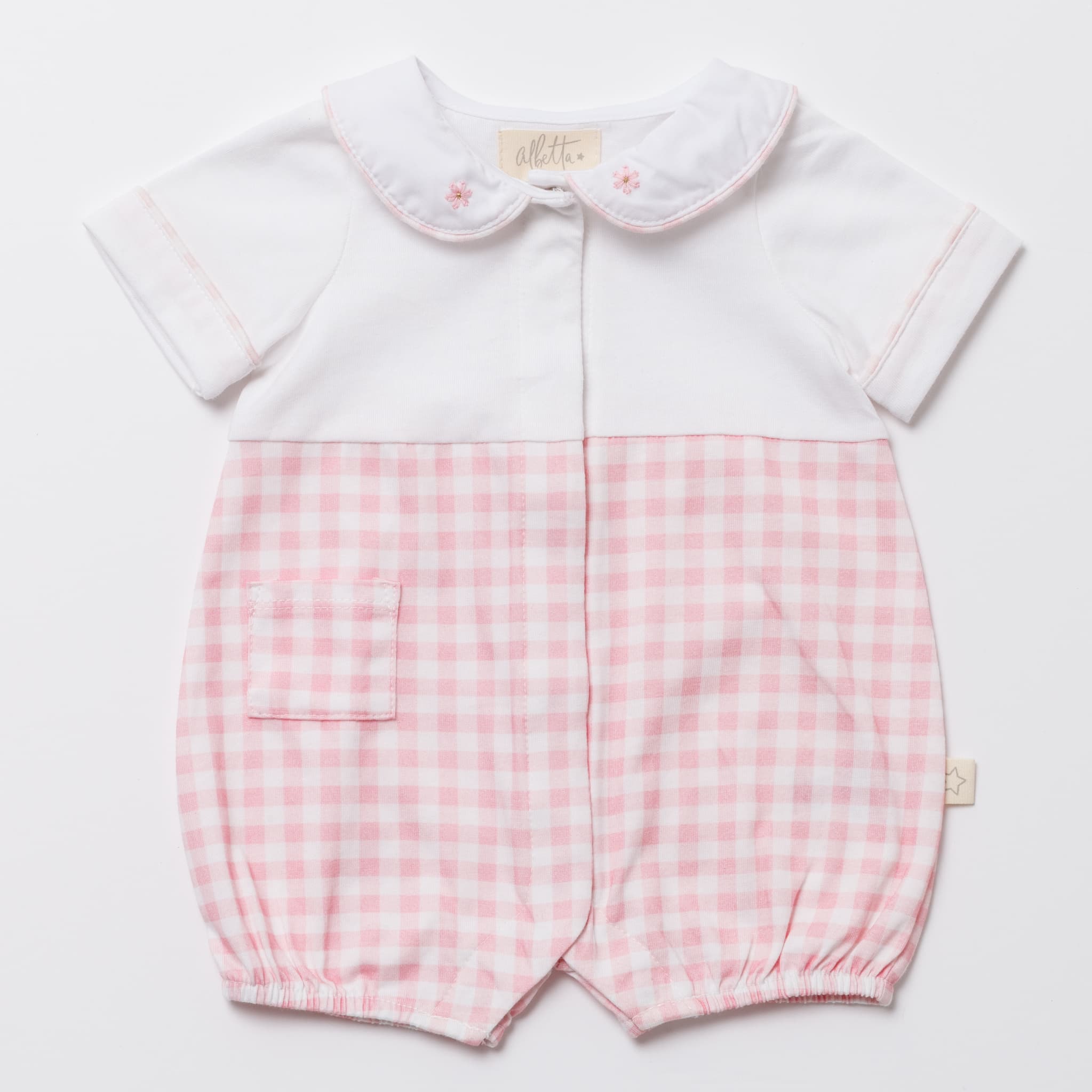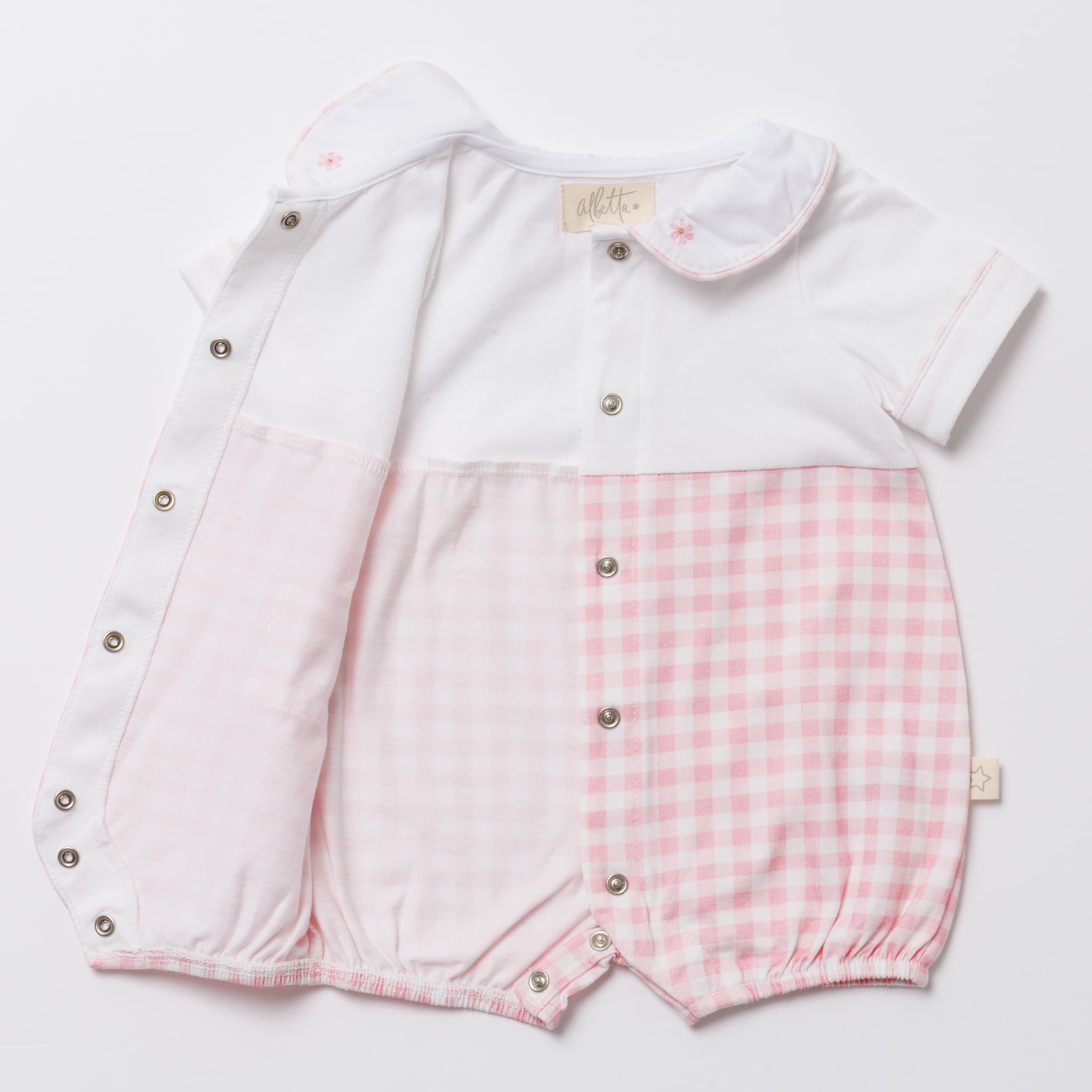 優しいピンクのチェック柄と、襟元の花刺繍が愛らしいロンパースです。丸みのある襟と繊細な刺繍が上品で可憐な印象を演出。やわらかな素材とゆったりとしたシルエットで着心地も良く、スナップボタン仕様でお着替えもスムーズです。デイリーからお出かけまで幅広く活躍する一着です。